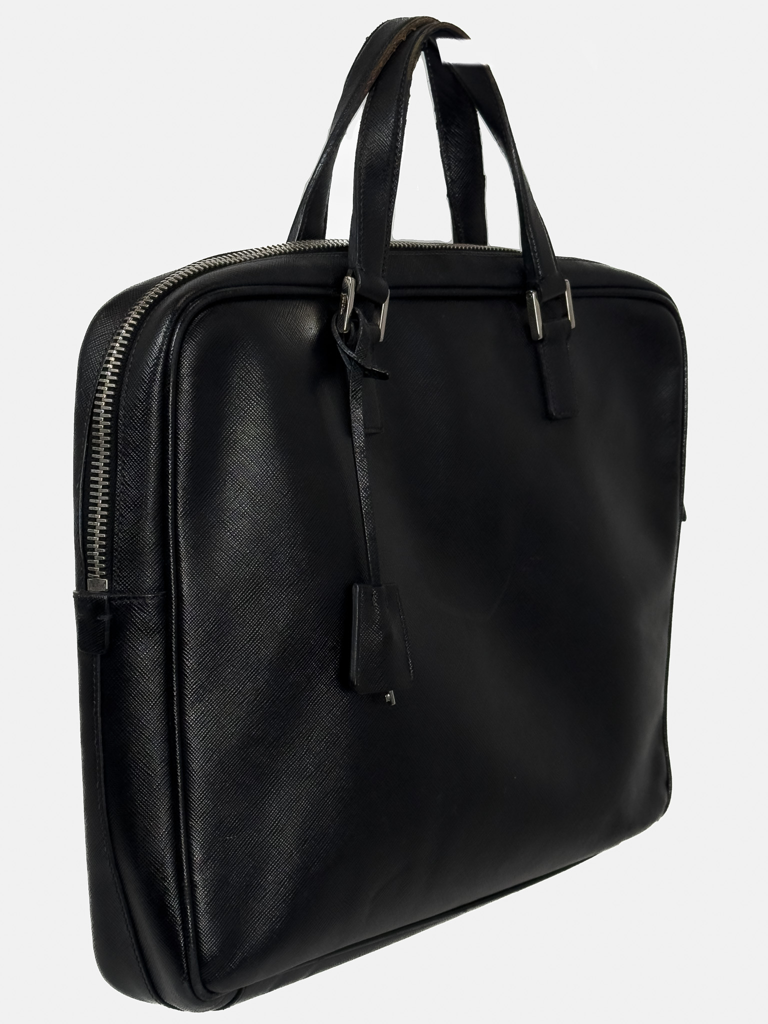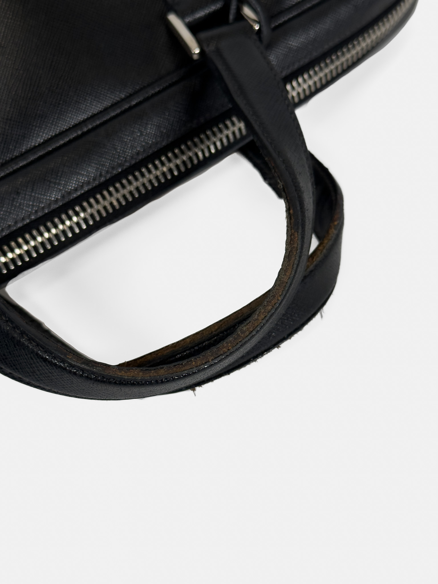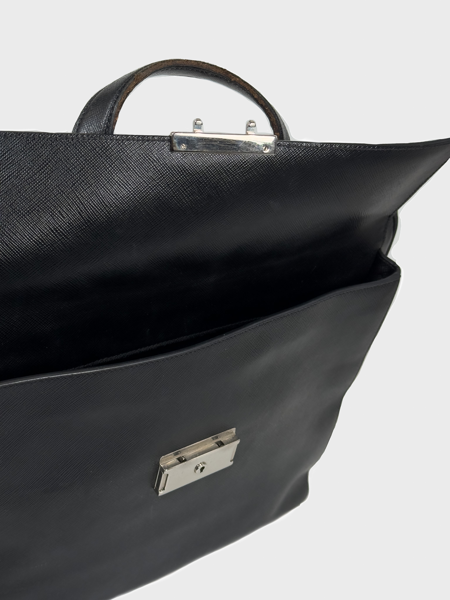 "Czarna skórzana aktówka, srebrne zapięcie z logo marki w centralnej części, prostokątny kształt, kieszeń na przodzie, dwa uchwyty do ręki, srebrne okucia, zapinana na suwak, jedna duża komora z kieszenią wewnątrz, logowane wnętrze. Stan dobry, posiada przetarcia na rączkach, ślady użytkowania na skórze, rysy na metalowych elementach. Wymiary: szerokość 38cm, wysokość 29cm, głębokość 5cm."