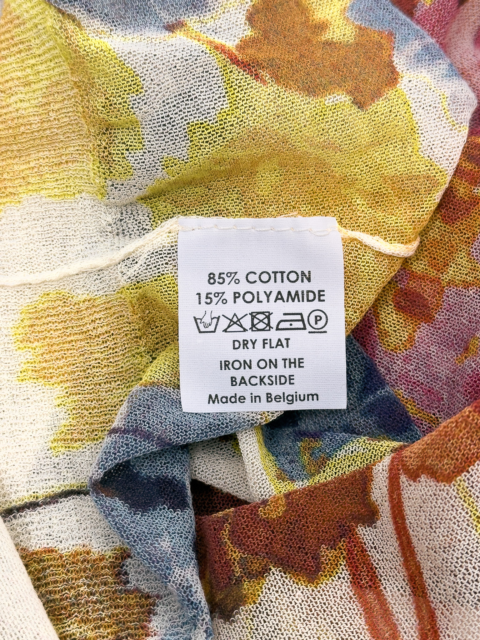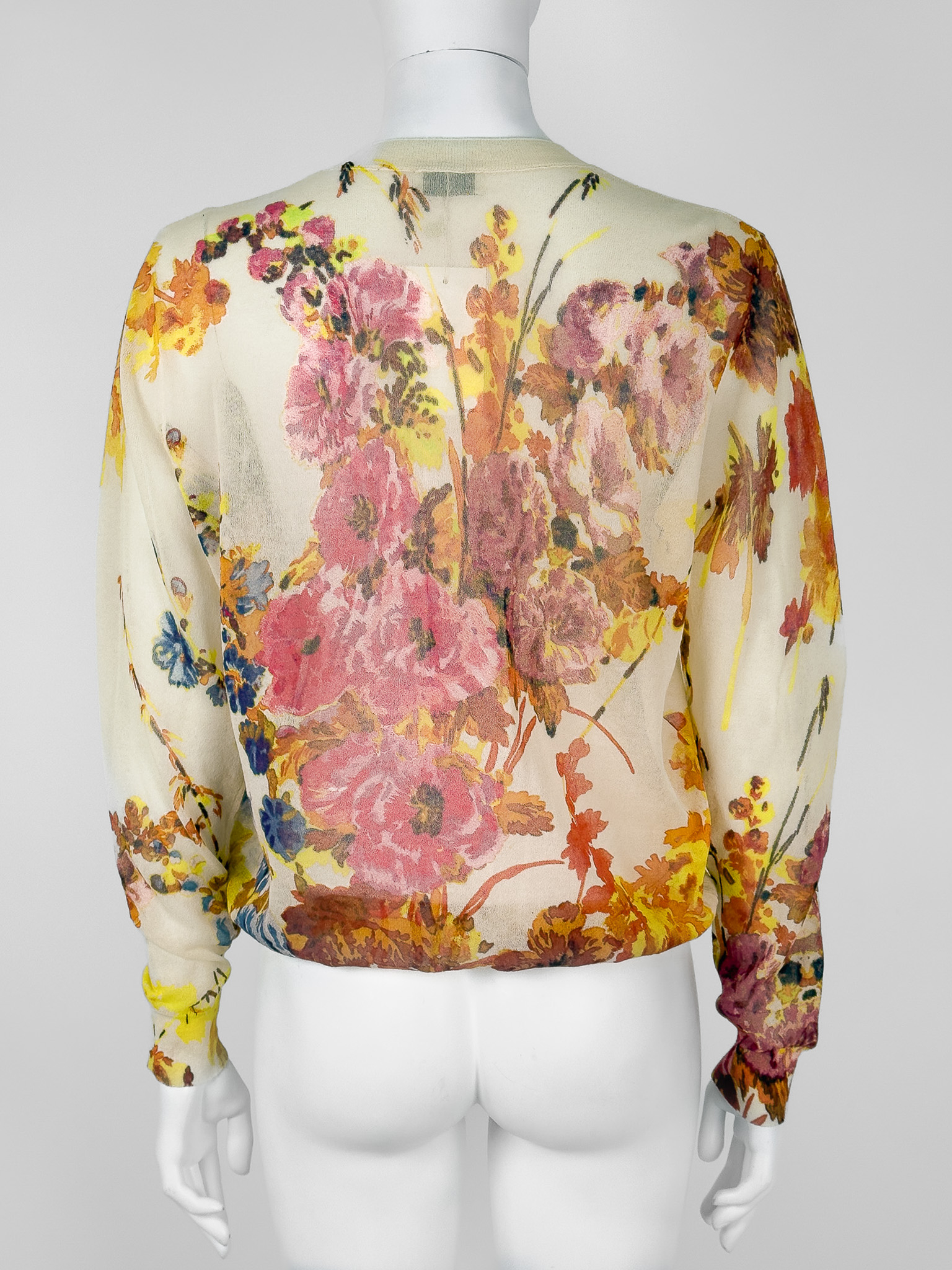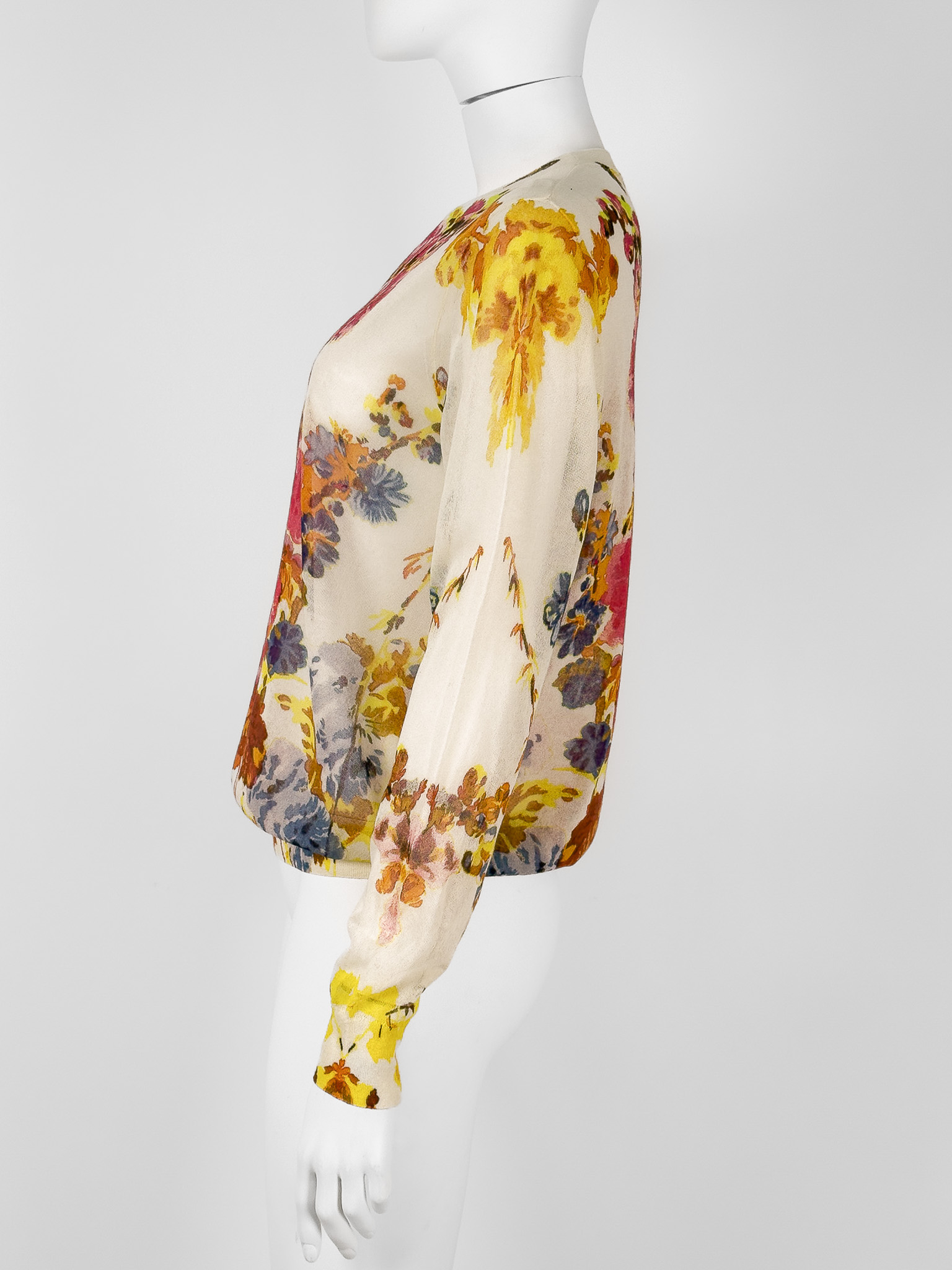 "Kremowa bawełniana bluzka z długim rękawem ozdobiona wzorem kwiatów w ciepłych barwach, zaokrąglony dekolt, cienka, delikatnie transparentna, o prostym kroju. wykończona delikatym ściągaczem. Stan bardzo dobry. Rozmiar z metki L. Skład: 85% bawełna, 15% poliamid. Wymiary: szerokość mierzona od pachy do pachy 57cm, długość całkowita 62cm."