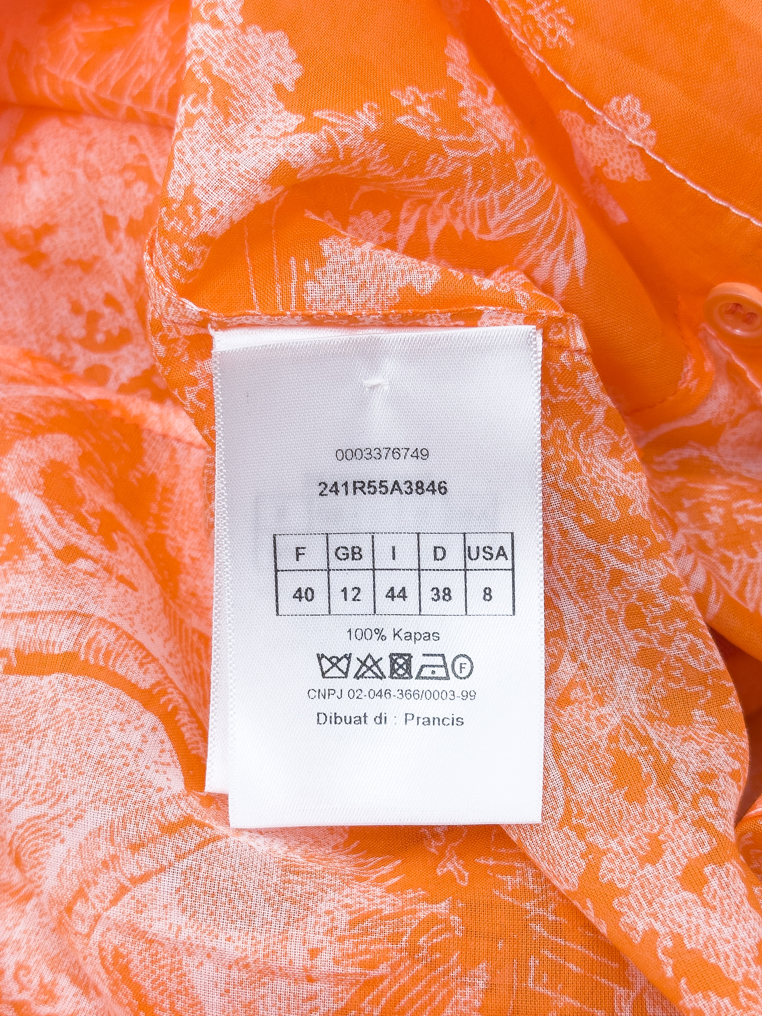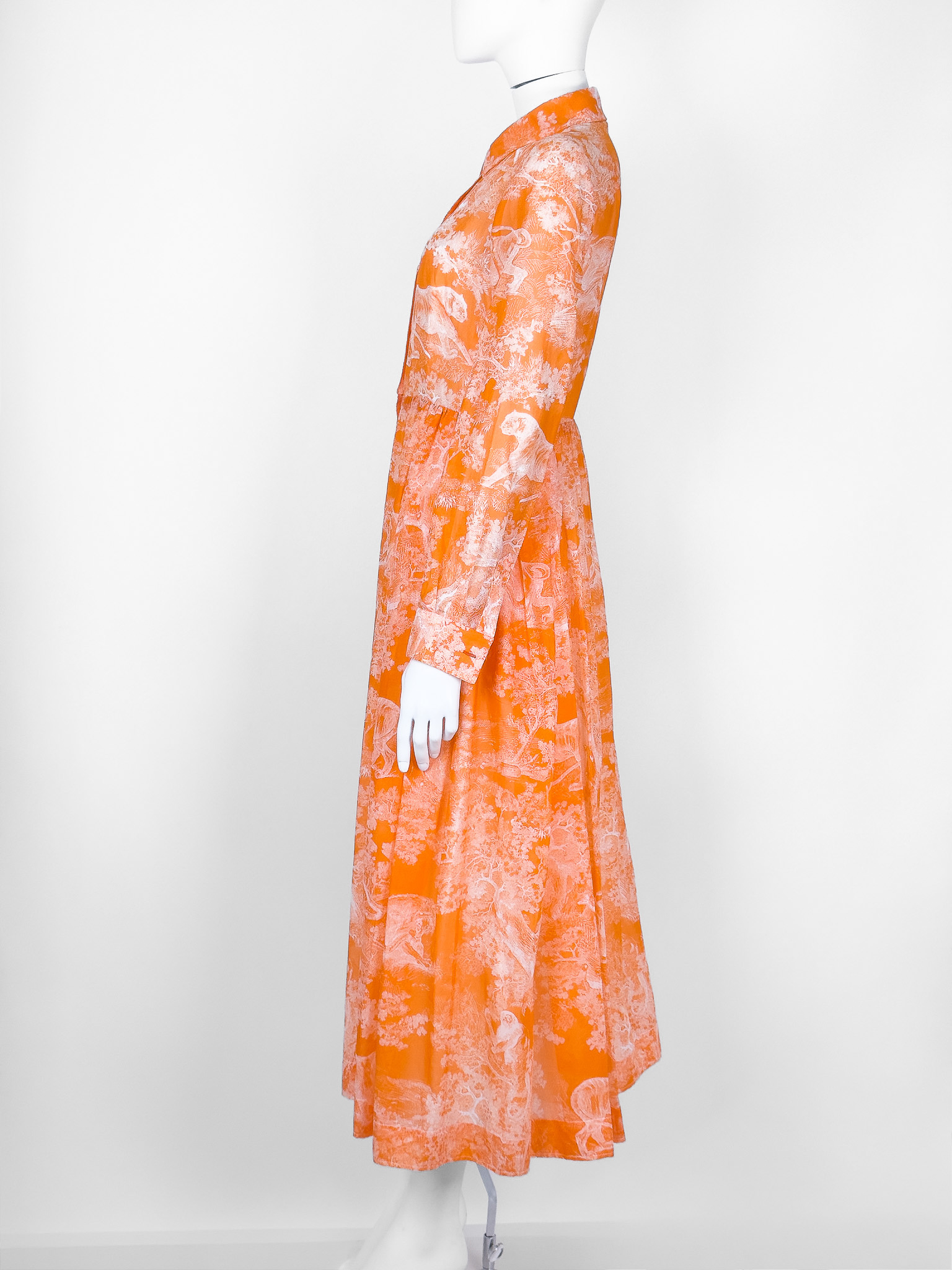 "Kolekcja: Dioriviera capsule 2022. Pomarańczowa bawełniana sukienka w charakterystyczny wzór dla marki, zapinana na guziki, długi rękaw, w zestawie z białą halką na ramiączkach. Stan bardzo dobry. Rozmiar z metki IT44. Skład: 100% bawełna. Wymiary: szerokość mierzona od pachy do pachy 49cm, długość całkowita 126cm."