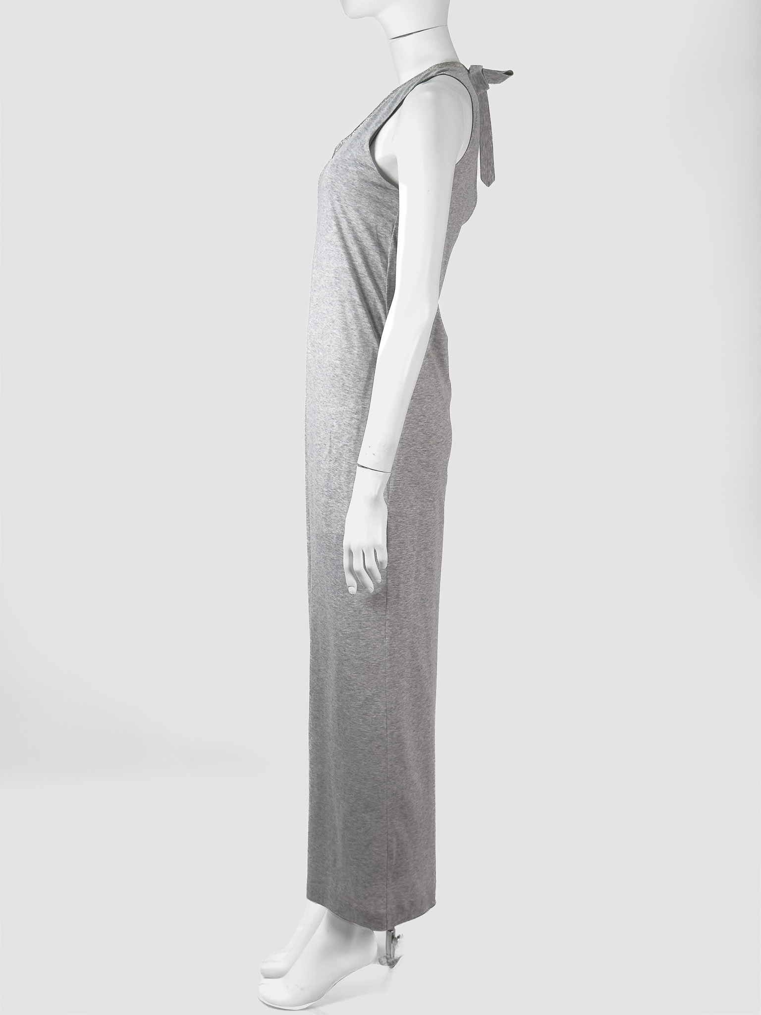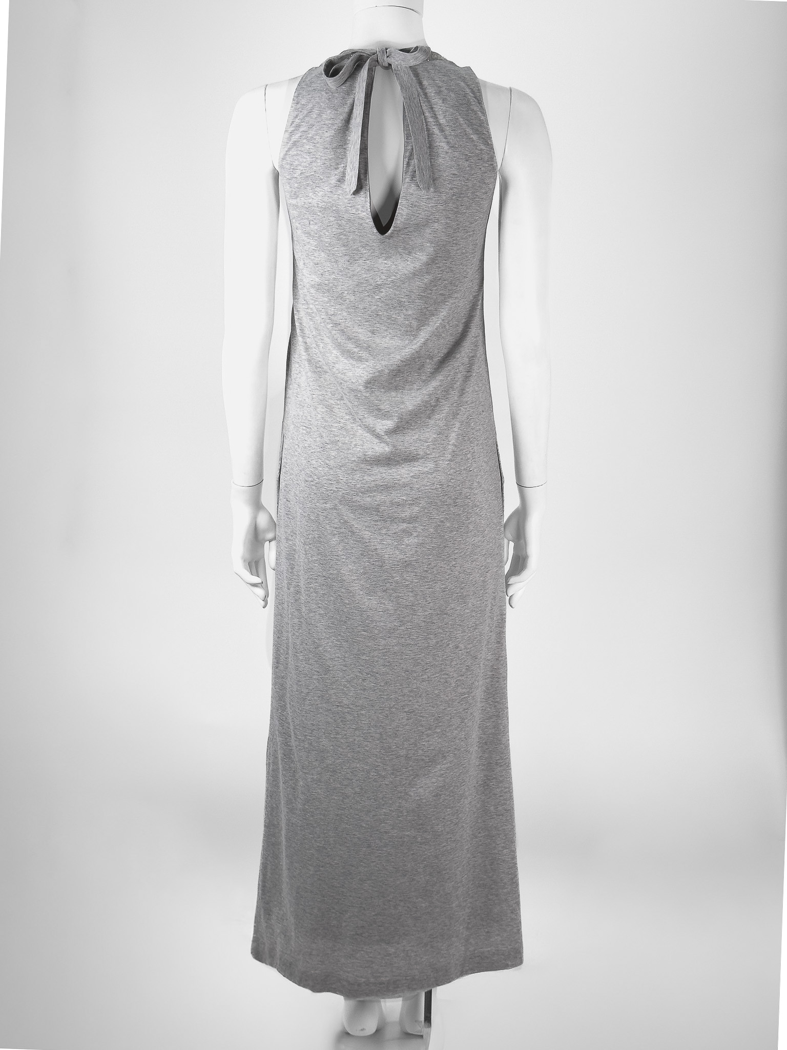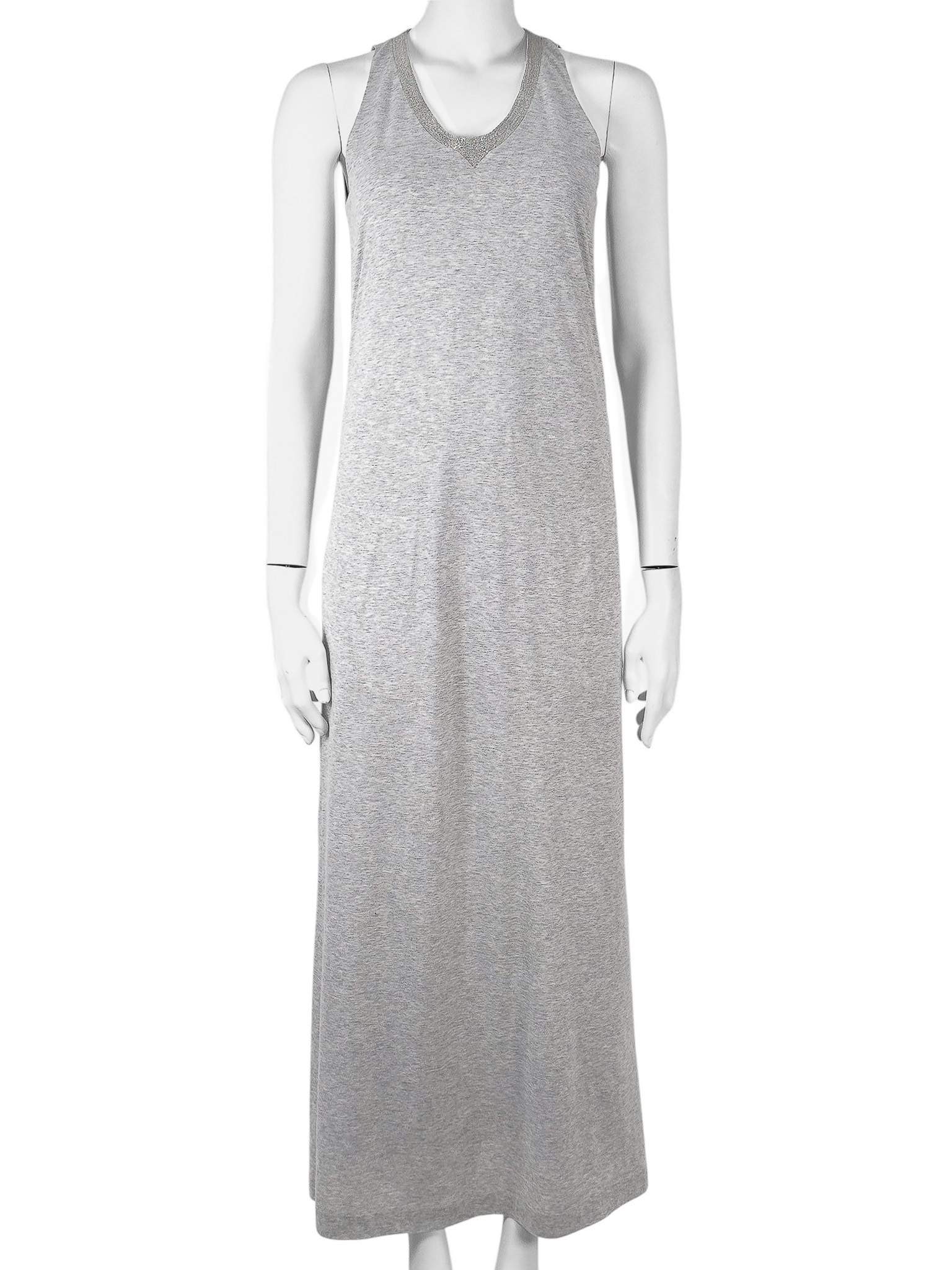 "Szara bawełniana sukienka na ramiączkach zdobiona kryształami przy dekolcie, wiązana przy szyi, długość maxi, zaokrąglony dekolt. Stan bardzo dobry, posiada dziury na podszewce. Rozmiar z metki S. Skład: 100% bawełna. Wymiary: szerokość mierzona od pachy do pachy 42cm, długość całkowita 134cm."