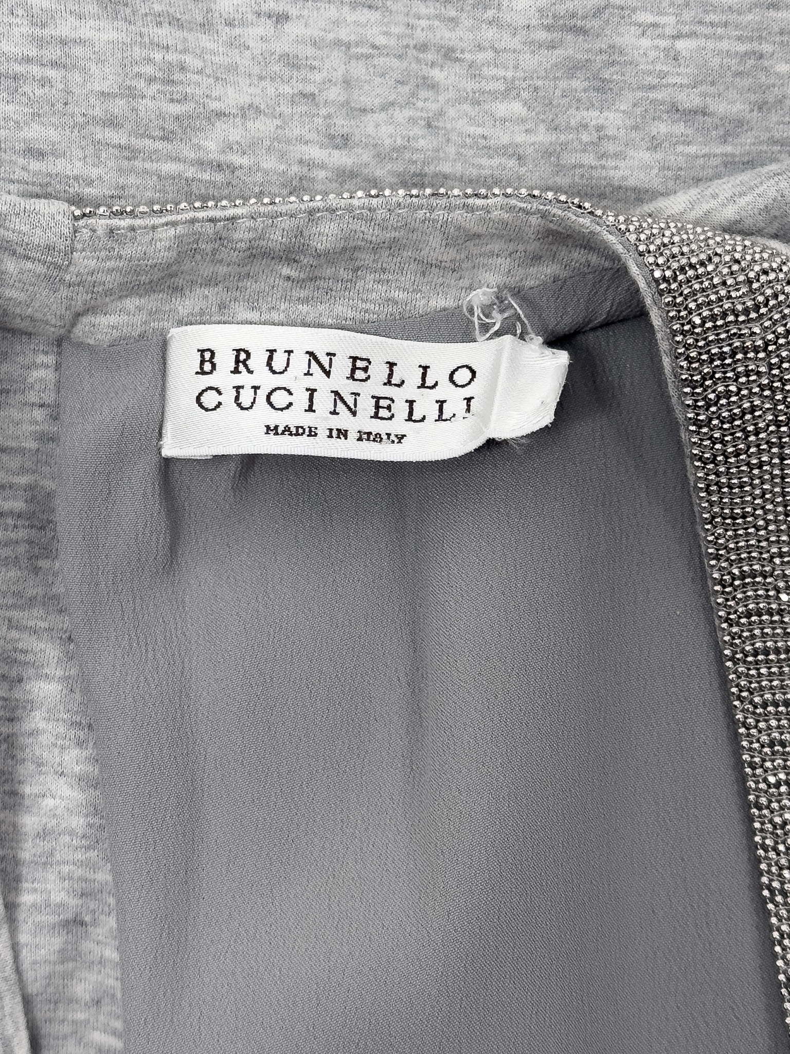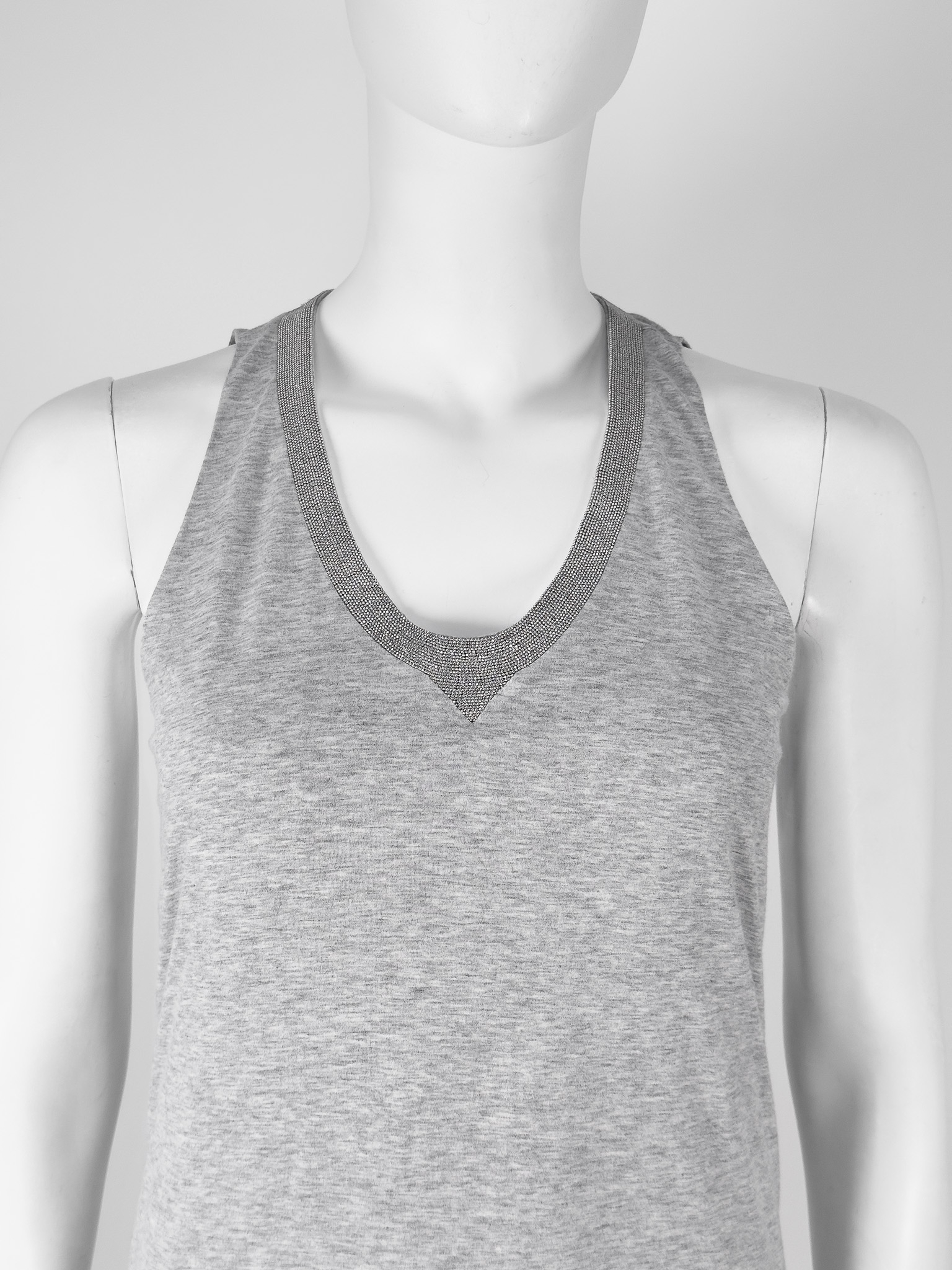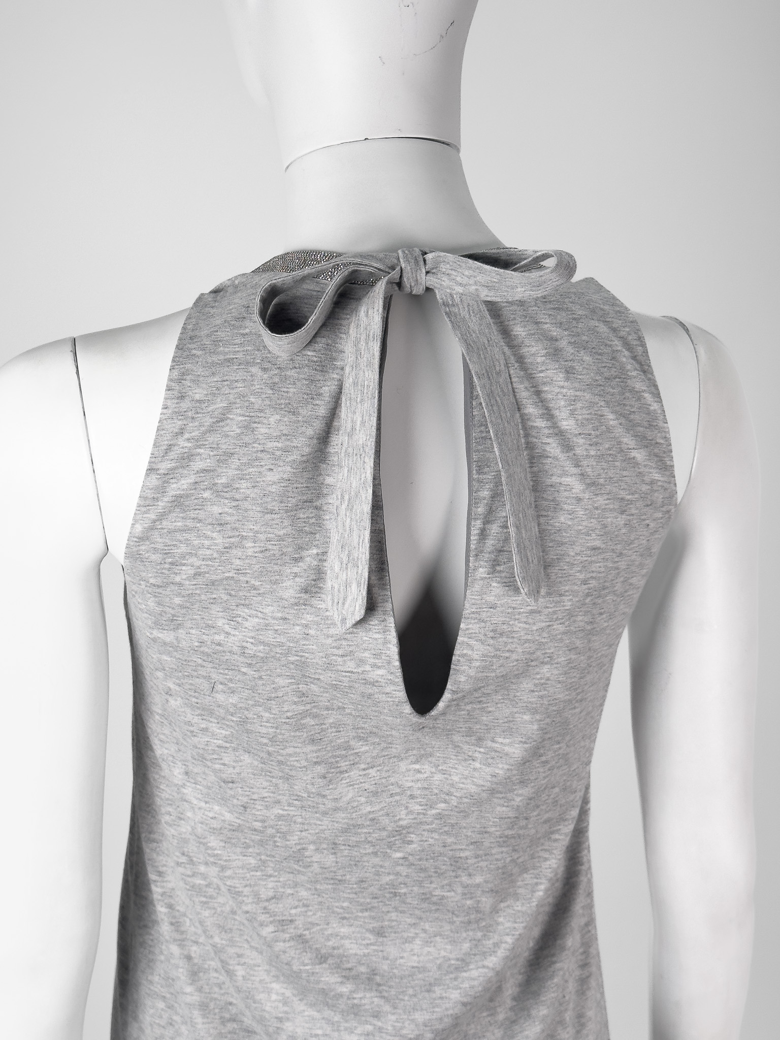 "Szara bawełniana sukienka na ramiączkach zdobiona kryształami przy dekolcie, wiązana przy szyi, długość maxi, zaokrąglony dekolt. Stan bardzo dobry, posiada dziury na podszewce. Rozmiar z metki S. Skład: 100% bawełna. Wymiary: szerokość mierzona od pachy do pachy 42cm, długość całkowita 134cm."