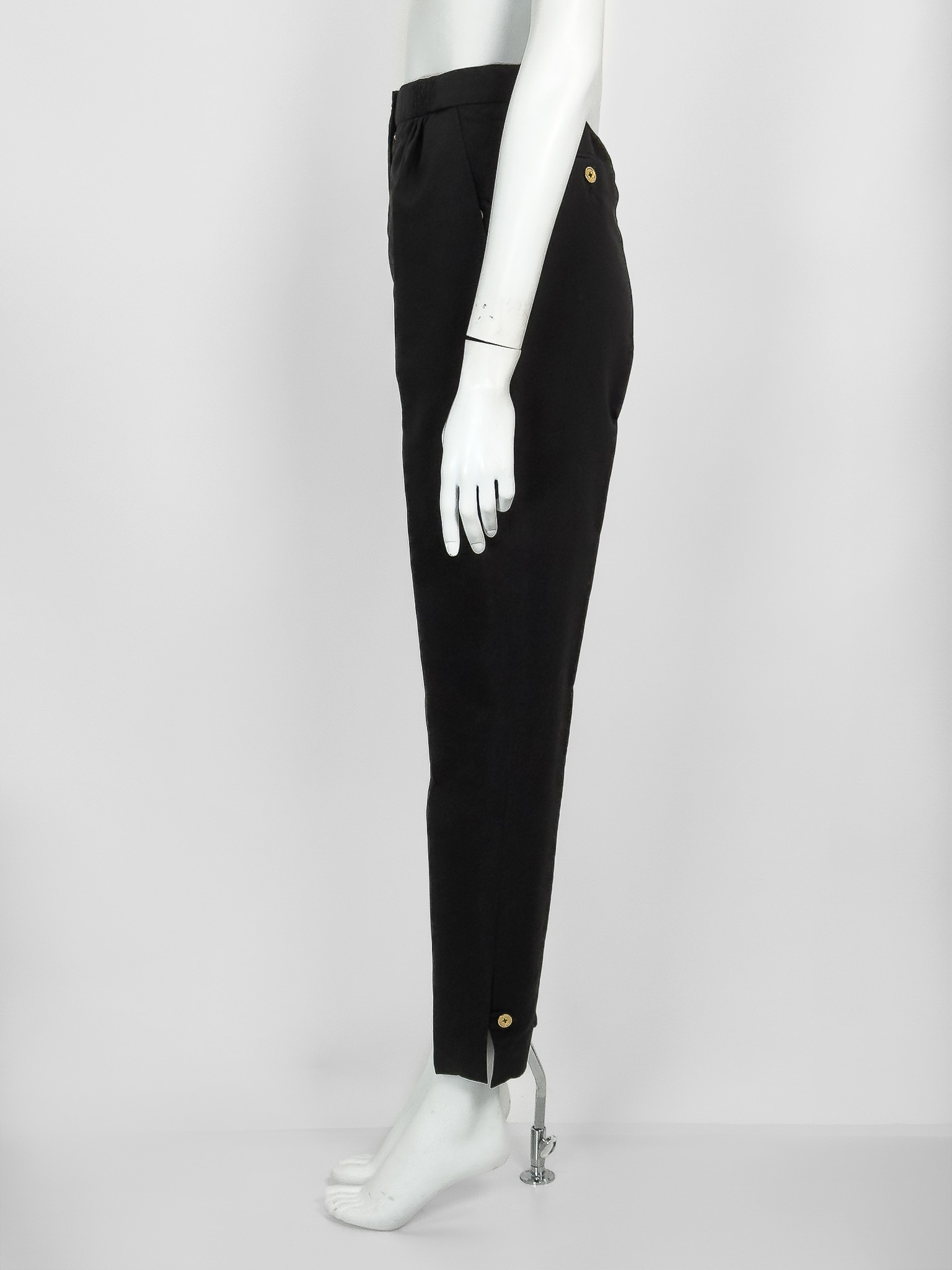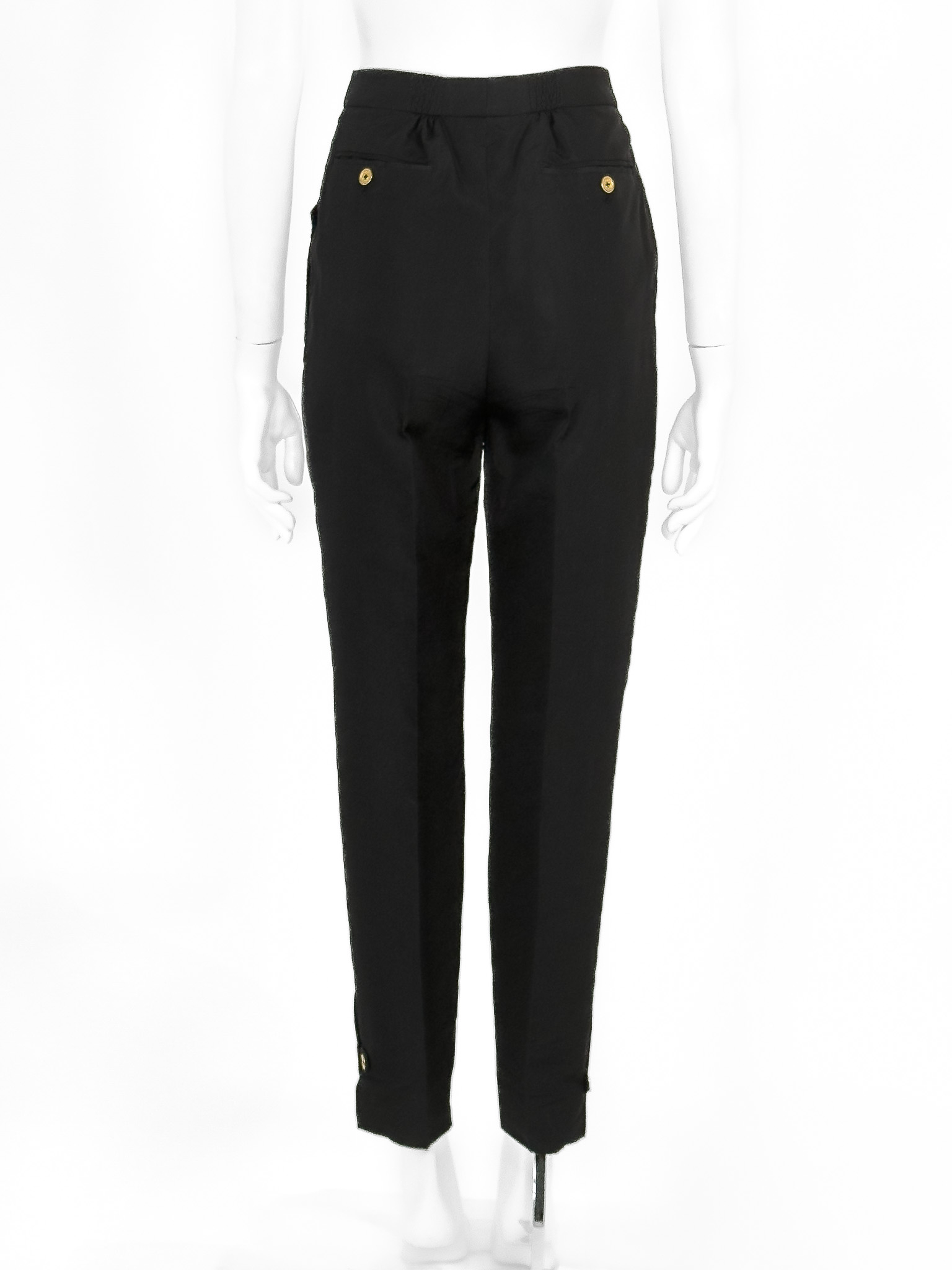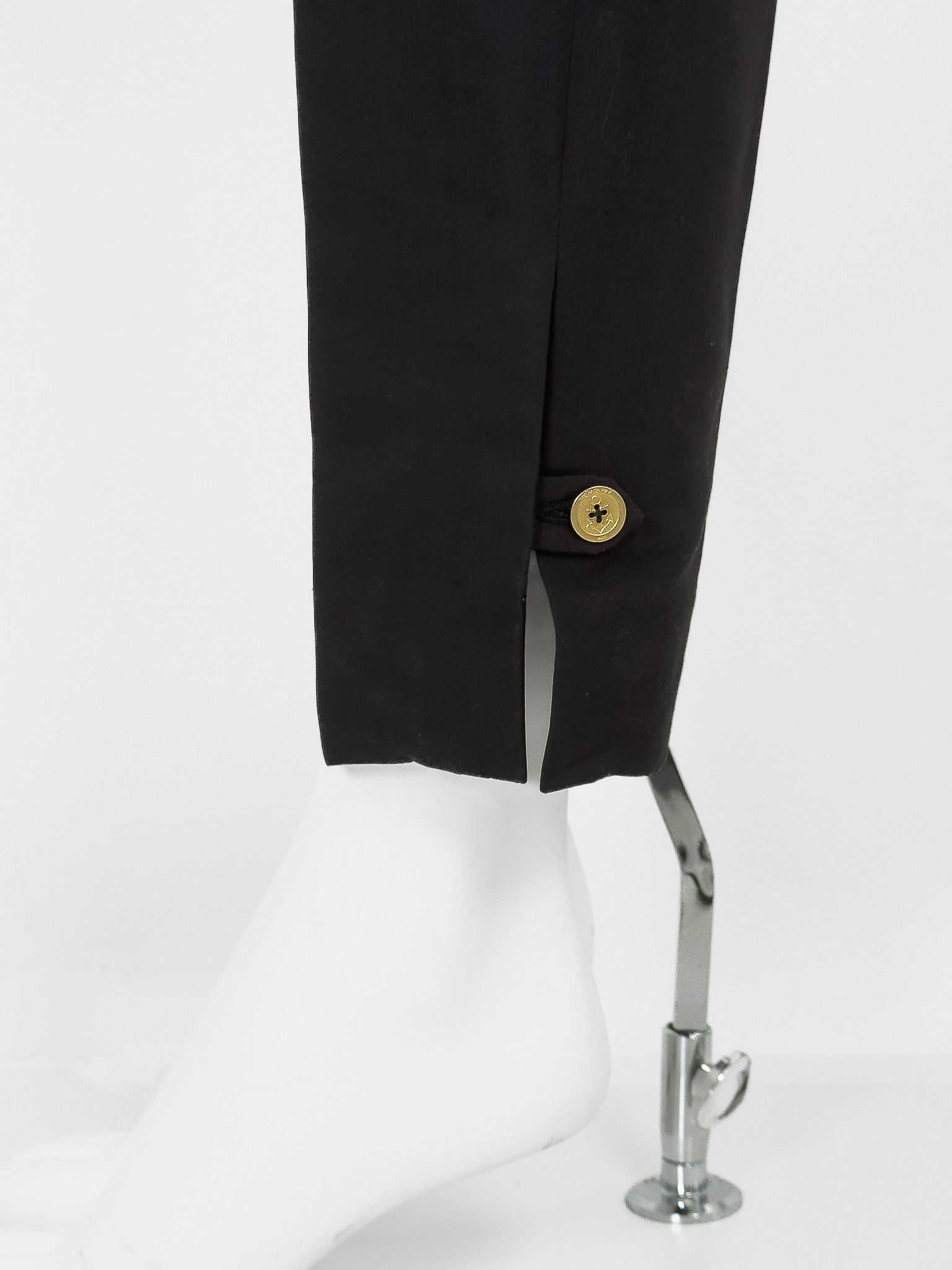 "Czarne bawełniane spodnie, zapinane na złoty logowany guzik z grafiką kotwicy oraz kryty suwak, marszczenia w pasie, prosta nogawka w kant wykończona zapinanym rozcięciem, dwie kryte kieszenie po bokach oraz dwie w tylnej części. Rozmiar z metki F36. Skład: 76% bawełna, 24% jedwab. Wymiary: szerokość w pasie 32cm, długość całkowita mierzona od zewnętrznej strony nogawki 104cm."
