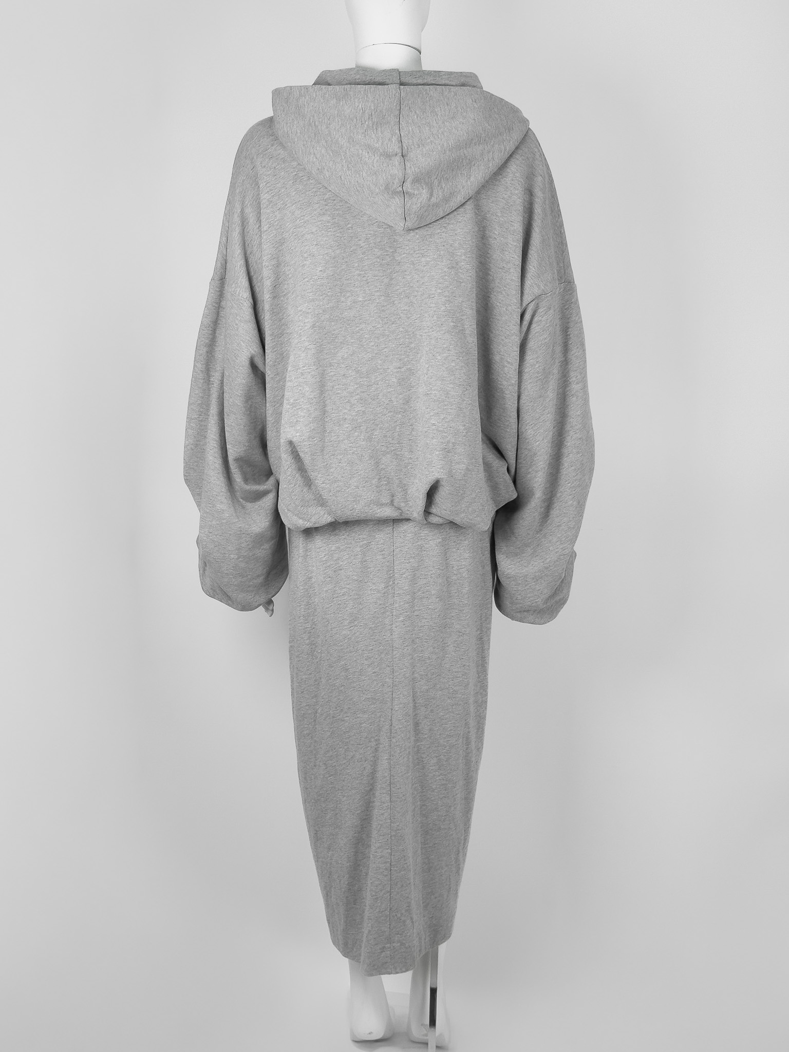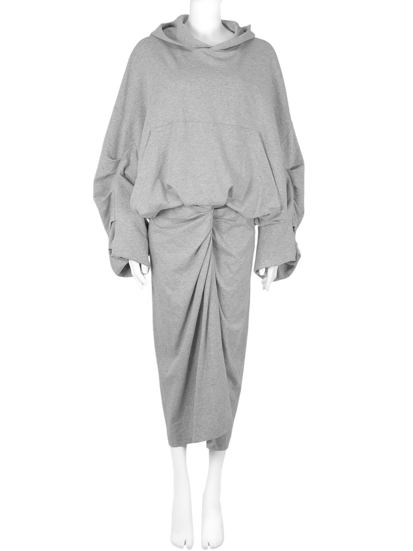 "Szary bawełniany komplet dresowy: bluza z kapturem + spódnica, ozdobiony marszczeniem, duża kieszeń na przodzie, guma w pasie w spódnicy, obniżona linia ramion. Stan bardzo dobry. Rozmiar z metki M. Skład: 100% bawełna. Wymiary: szerokość mierzona od pachy do pachy 89cm, długość całkowita bluzy 59cm; szerokość w pasie 39cm, długość całkowita spódnicy 96cm."
