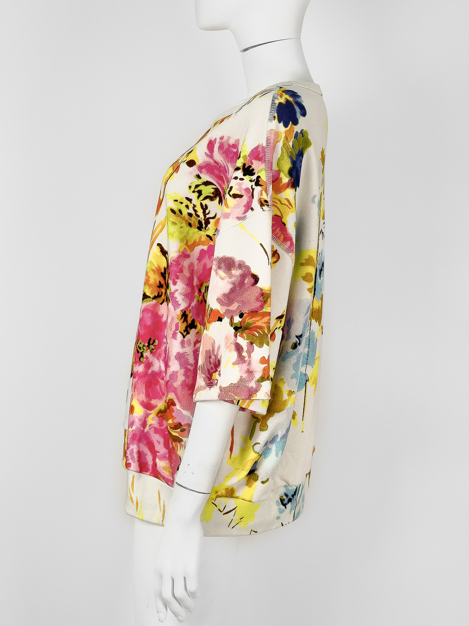 "Jasnobeżowy bawełniany t-shirt w wielobarwną grafikę kwiatową, krój oversize, zaokrąglony dekolt, obniżona linia ramion, wykończony ściągaczem. Stan bardzo dobry. Rozmiar z metki M. Skład: 100% bawełna. Wymiary: szerokość mierzona od pachy do pachy 67cm, długość całkowita 66cm."