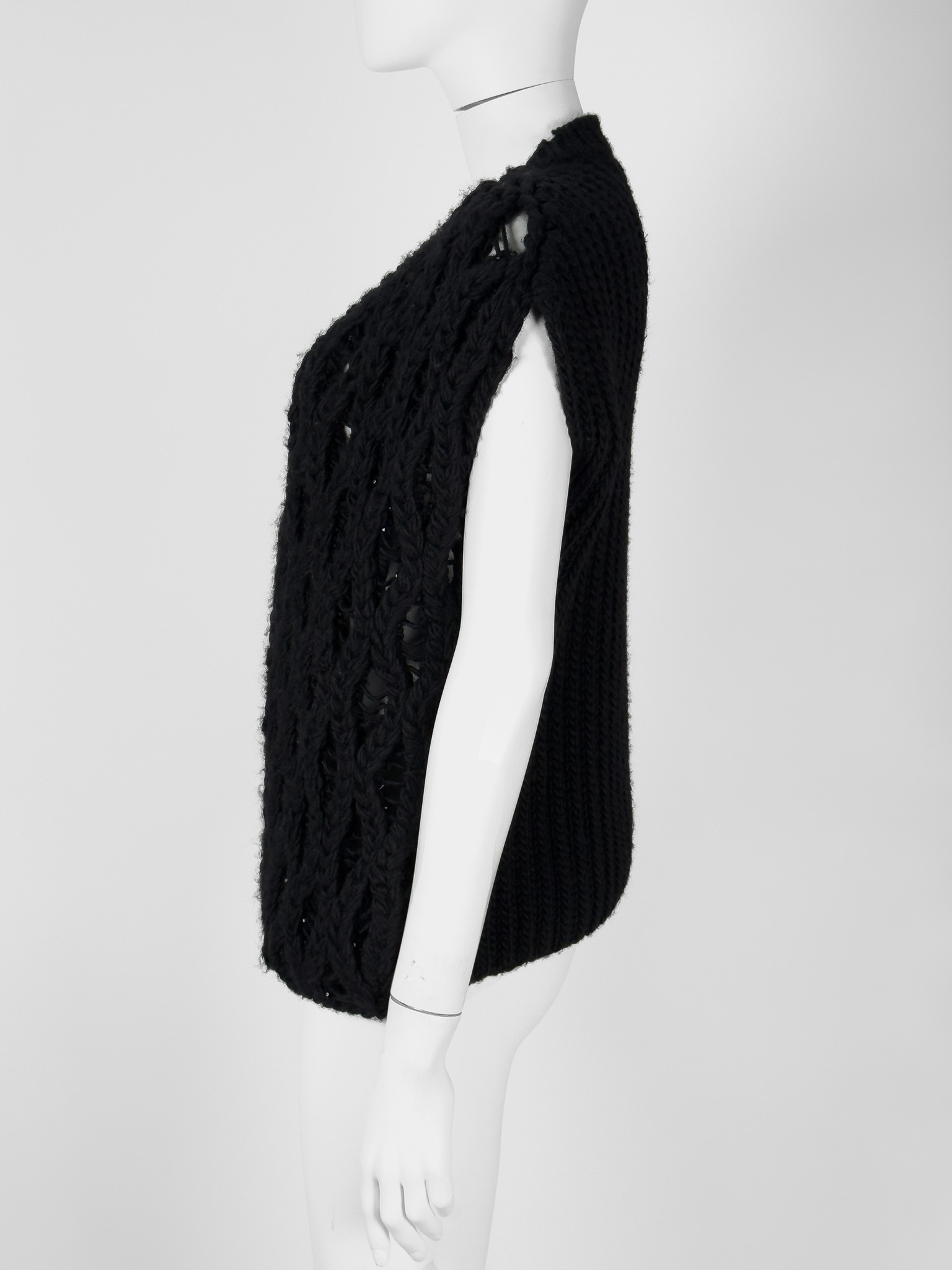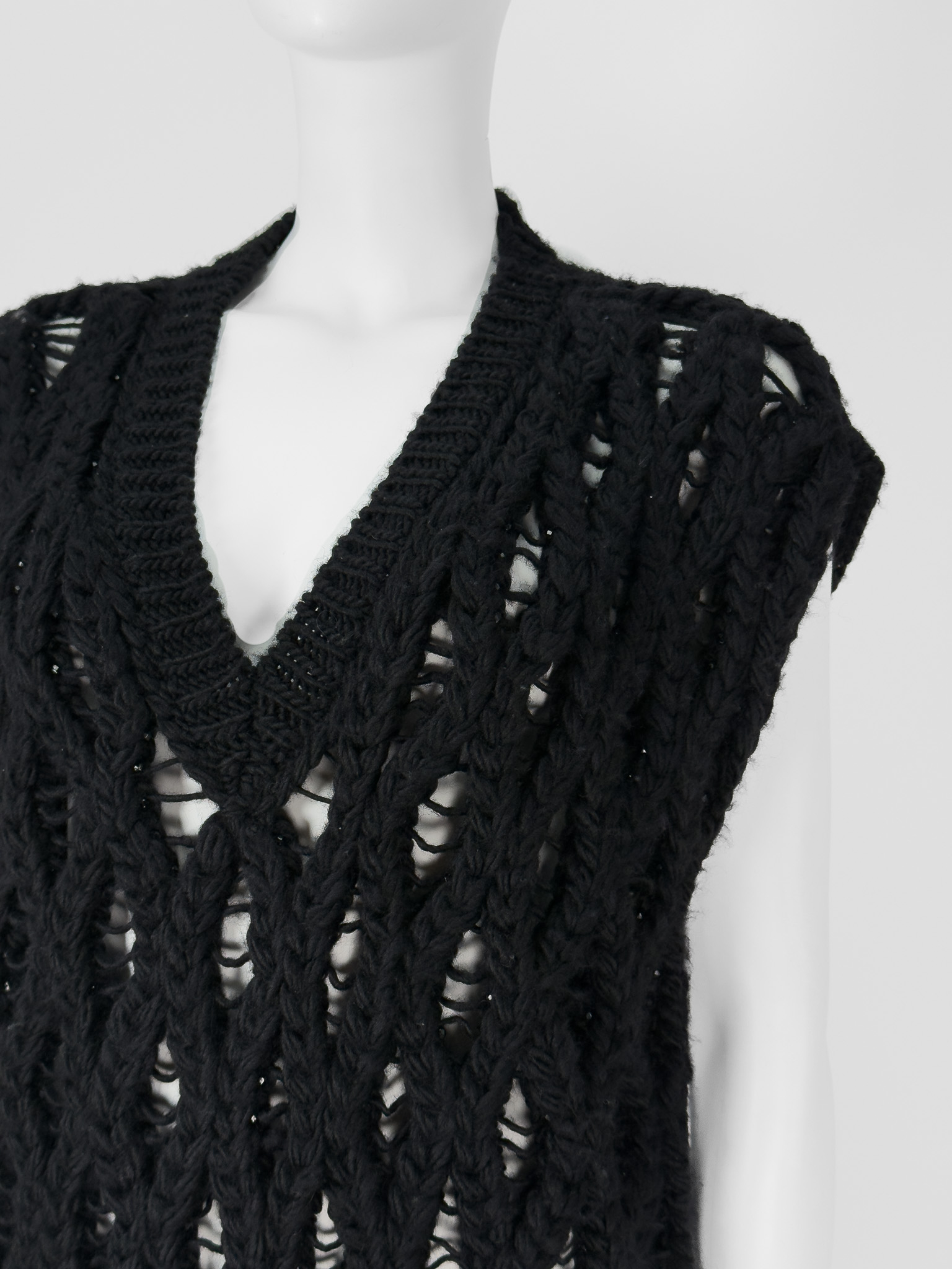 "Czarny bezrękawnik z dzianiny, ażurowy, ozdobiony połyskującymi koralikami, dekolt w serek, wykończony prążkowanym ściągaczem w dolnej części. Wycięta metka z rozmiarem oraz składem. Rozmiarowo wypada jak M. Wymiary: szerokość mierzona od pachy do pachy 56cm, długość całkowita 65cm."