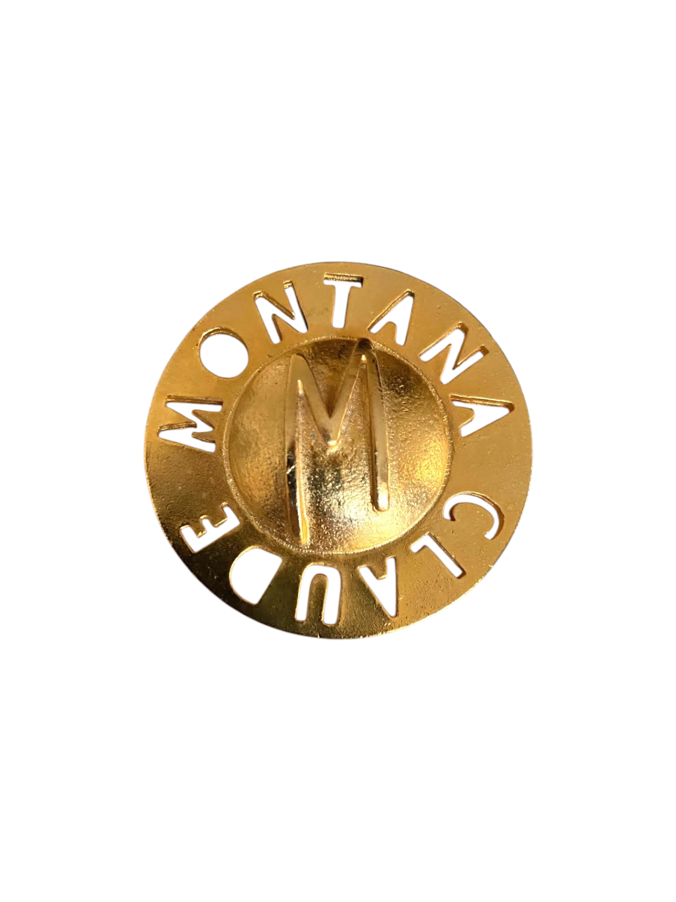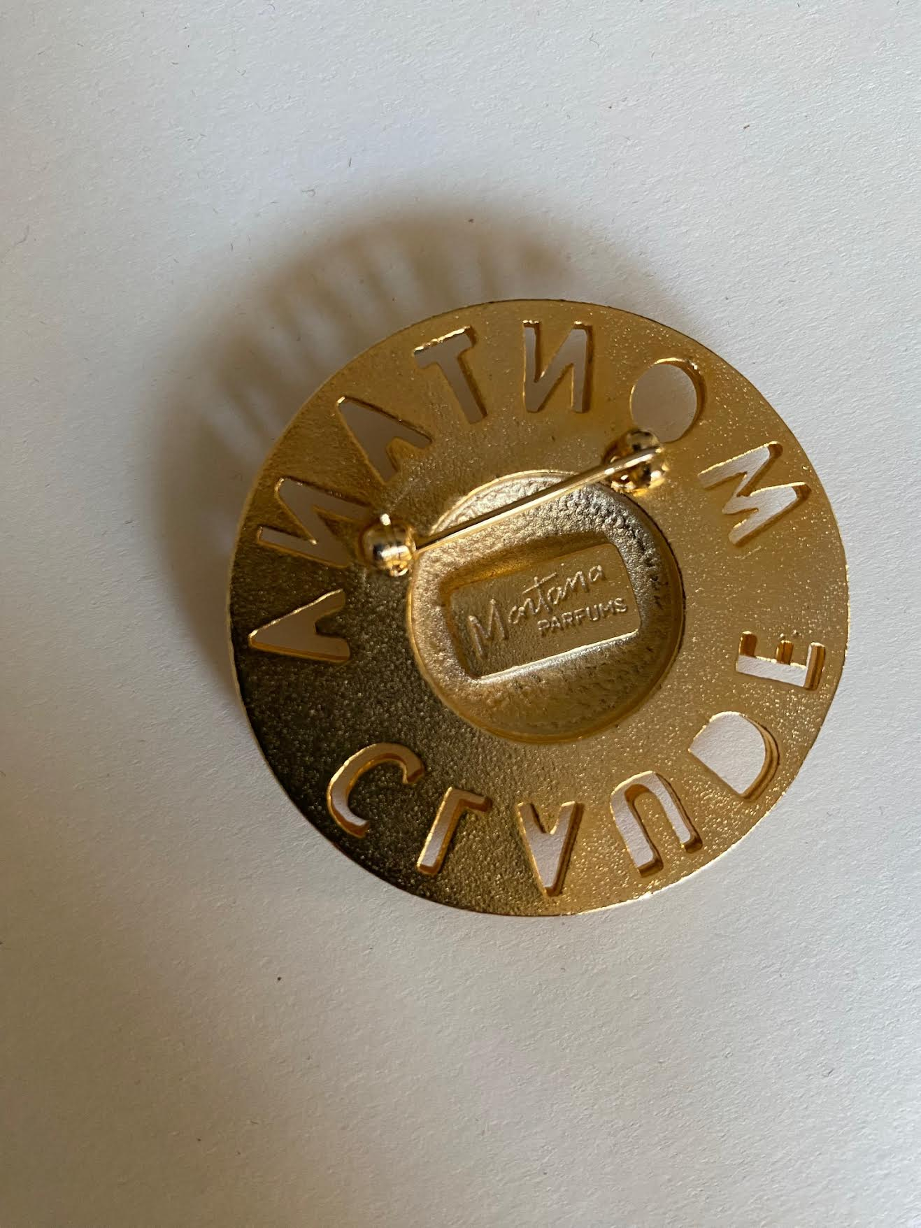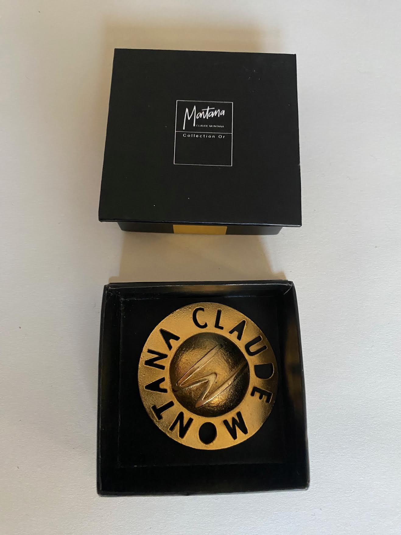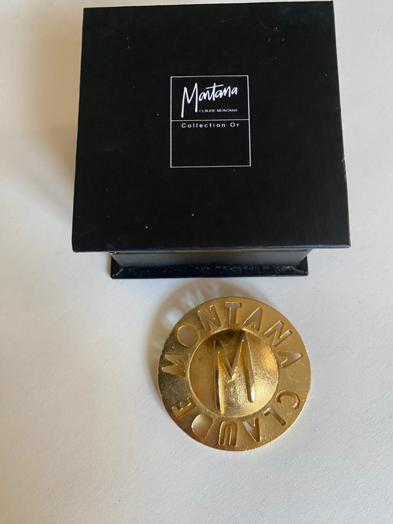 "Broszka Claude Montana francuskiego projektanta mody, w zestawie z pudełkiem. Wymiary: średnica 4,5 cm."