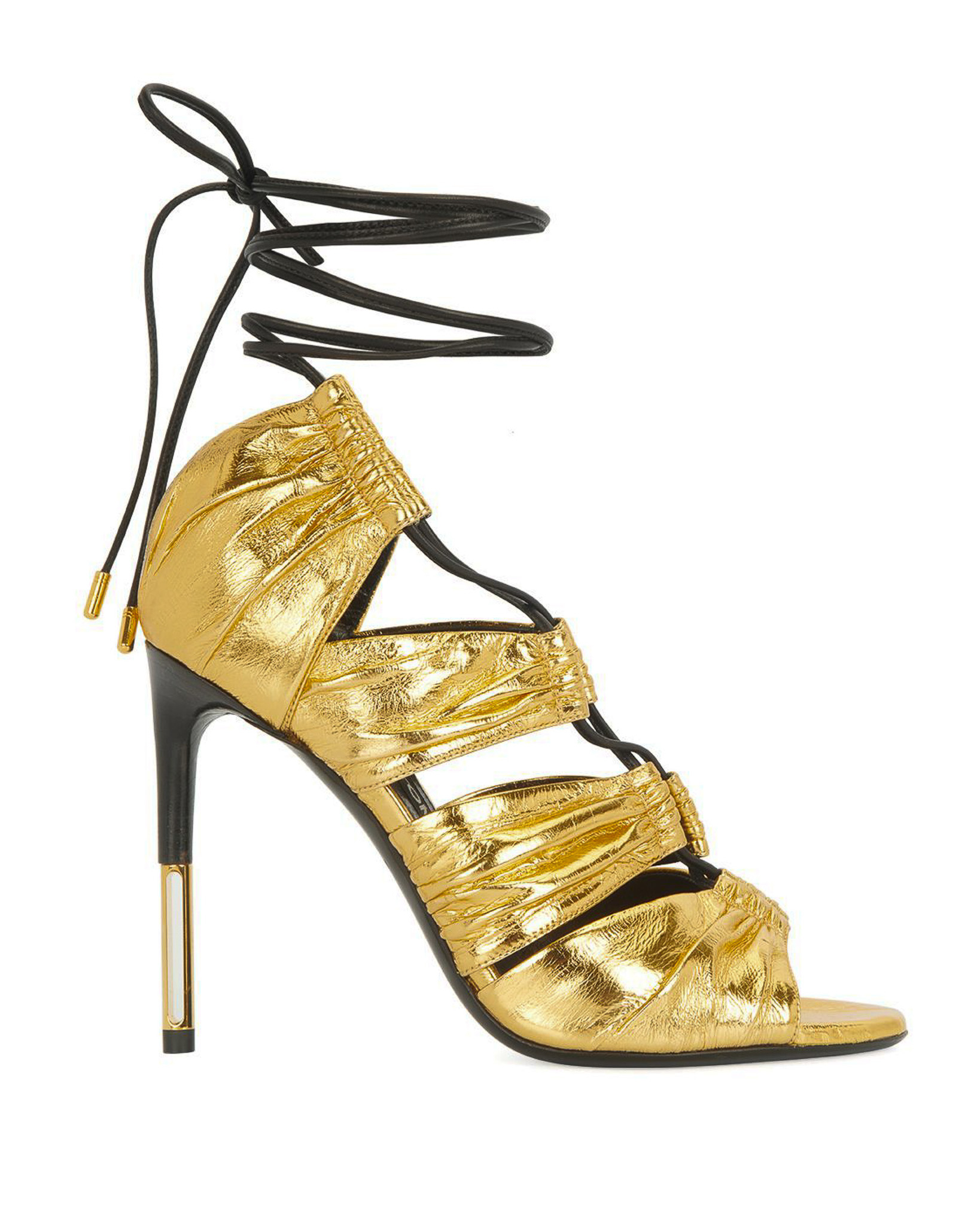 "Złoto-czarne skórzane buty na obcasie wykończone marszczeniem, ozdobne wycięcia, migdałowe noski, czarne wiązanie wokół kostki, odkryte palce, wkładka z logo, w zestawie z pudełkiem. Stan nowe. Rozmiar 41."
