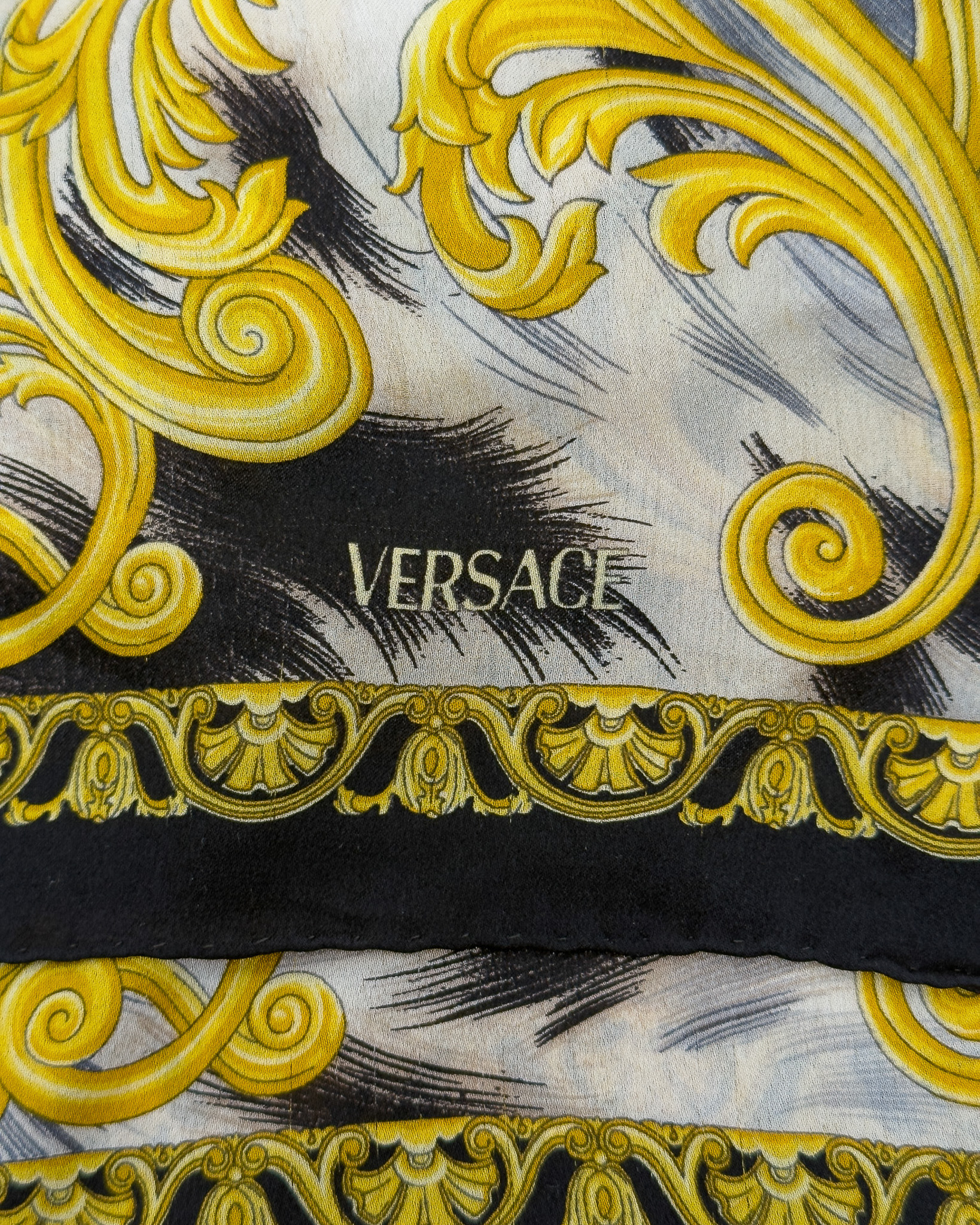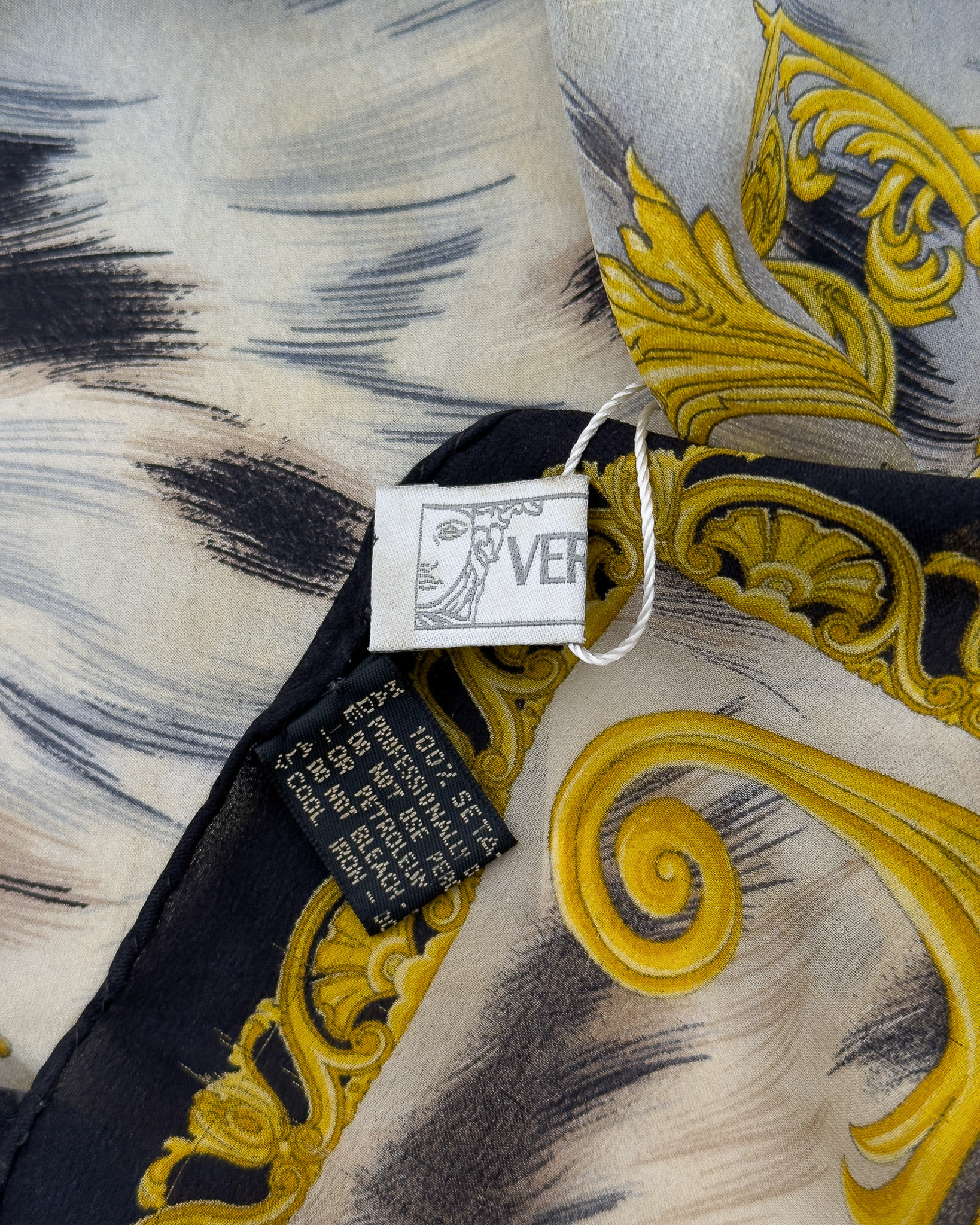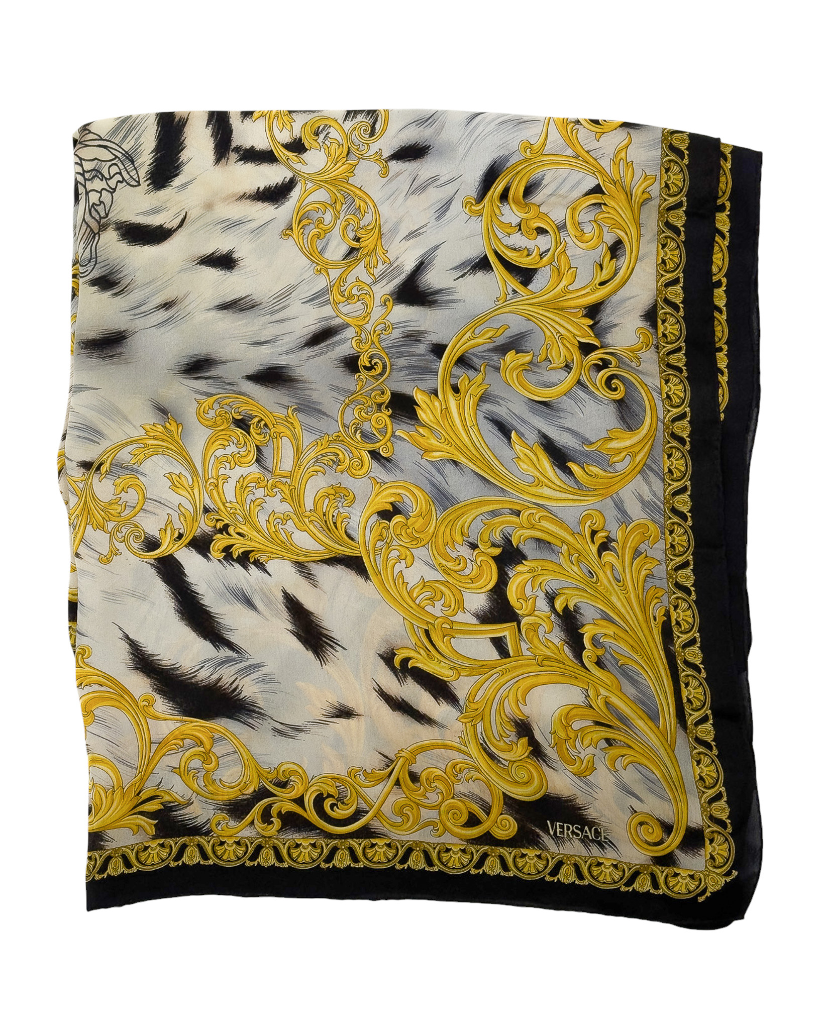 "Biała jedwabna chusta w print zwierzęcy, w motyw białej pantery, ozdobiona złotym wzorem oraz grafiką charakterystyczną dla marki w centralnej części, kwadratowy kształt, czarna lamówka. Stan bardzo dobry. Skład: 100% jedwab. Wymiary: 88cm x 85cm."