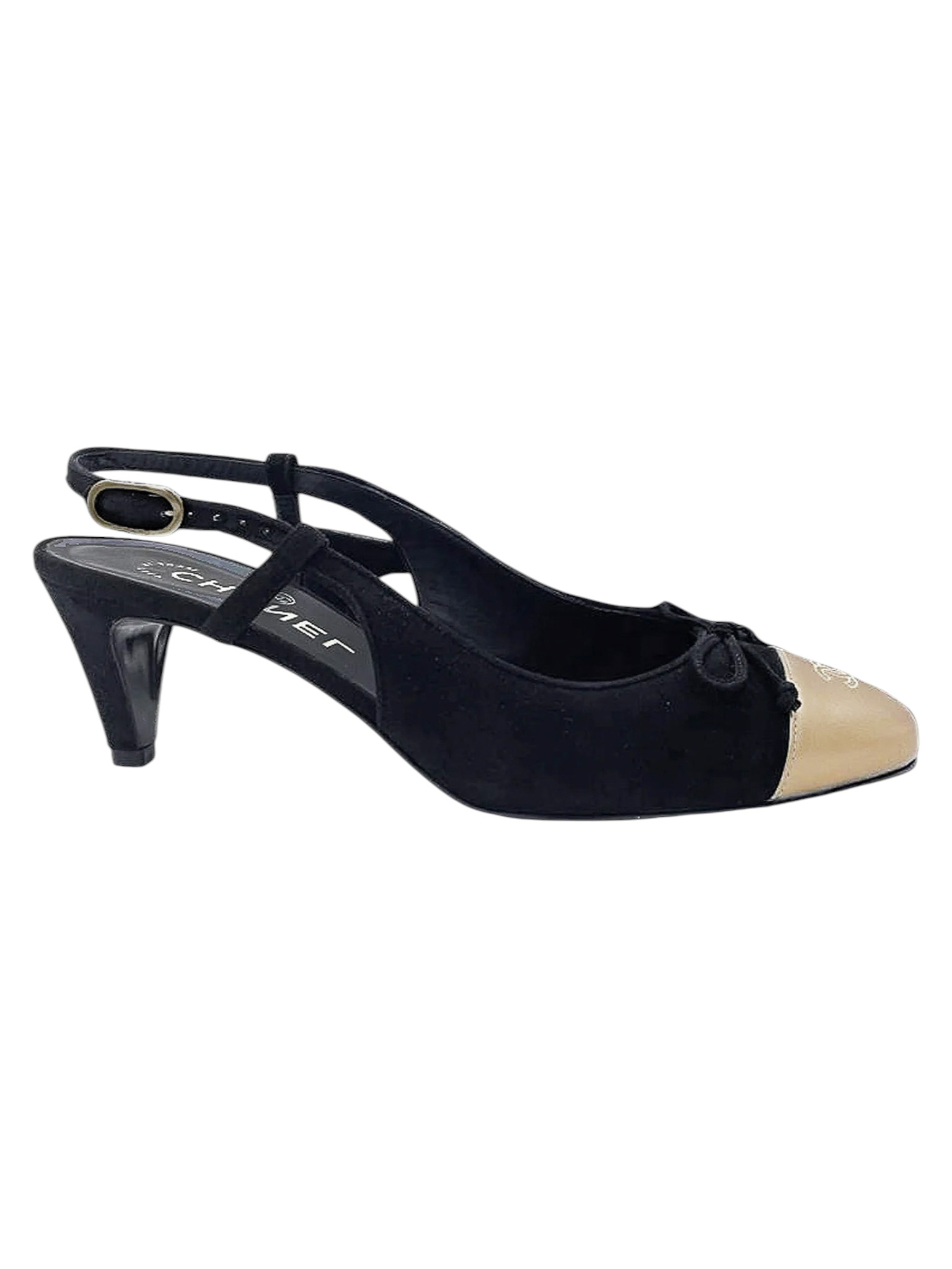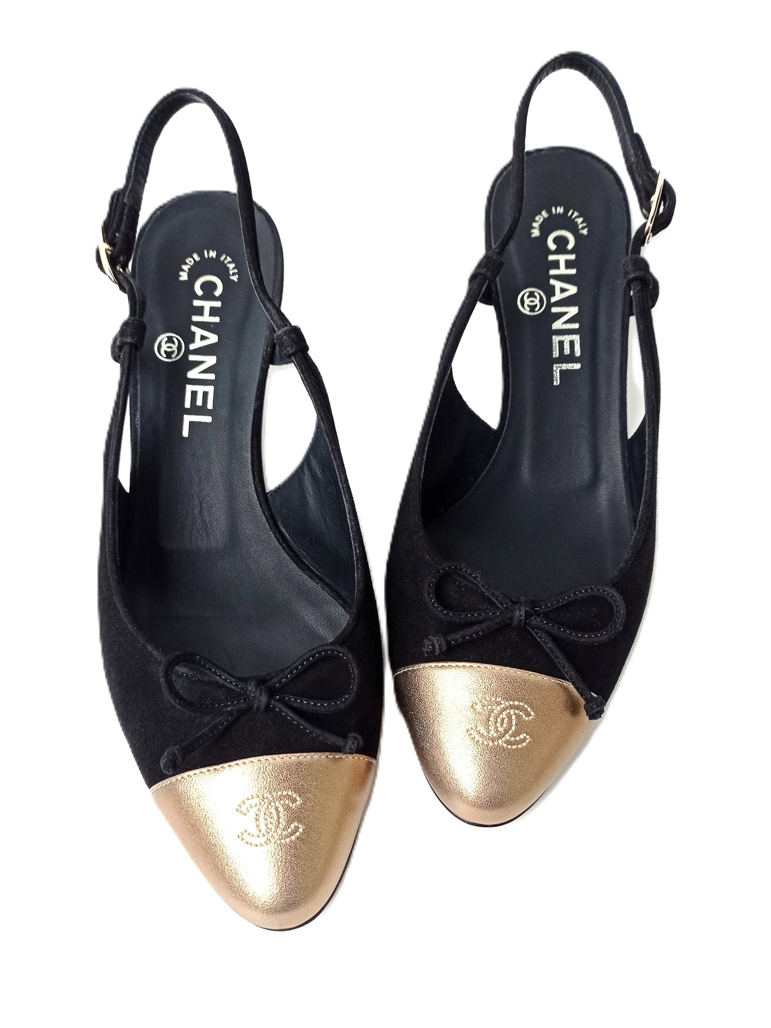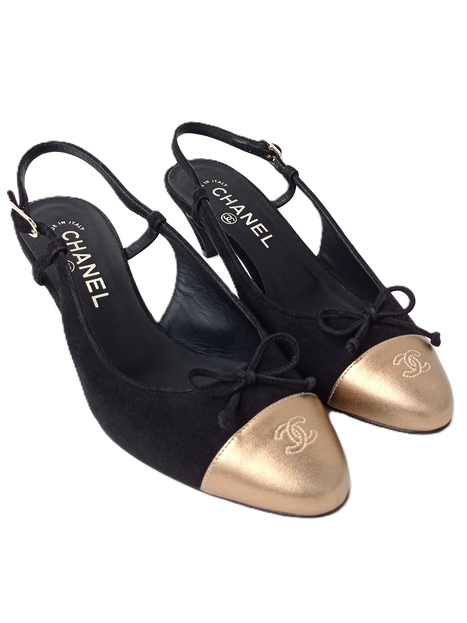 "Model: Slingback. Czółenka wykonane z łączonych skór: czarnego zamszu oraz skóry licowej w złotym kolorze z haftowanym logo CC na przodzie, zapinane na złotą sprzączkę z grawerem marki, skórzana wkładka oraz podeszwa, w zestawie z pudełkiem. Rozmiar 37, dł. wkładki 24cm, wys. obcasa 6cm. Stan bardzo dobry, użyte tylko jeden raz."
