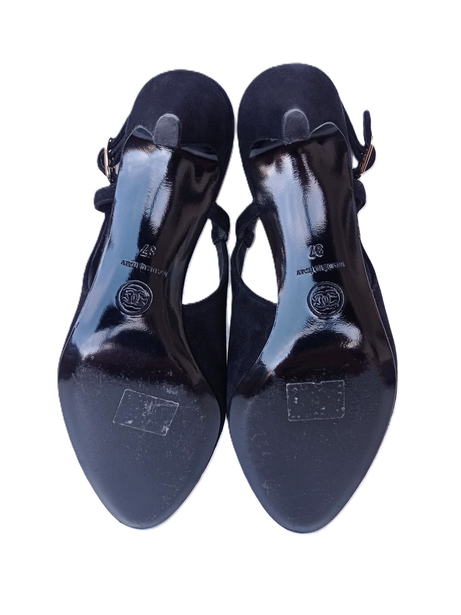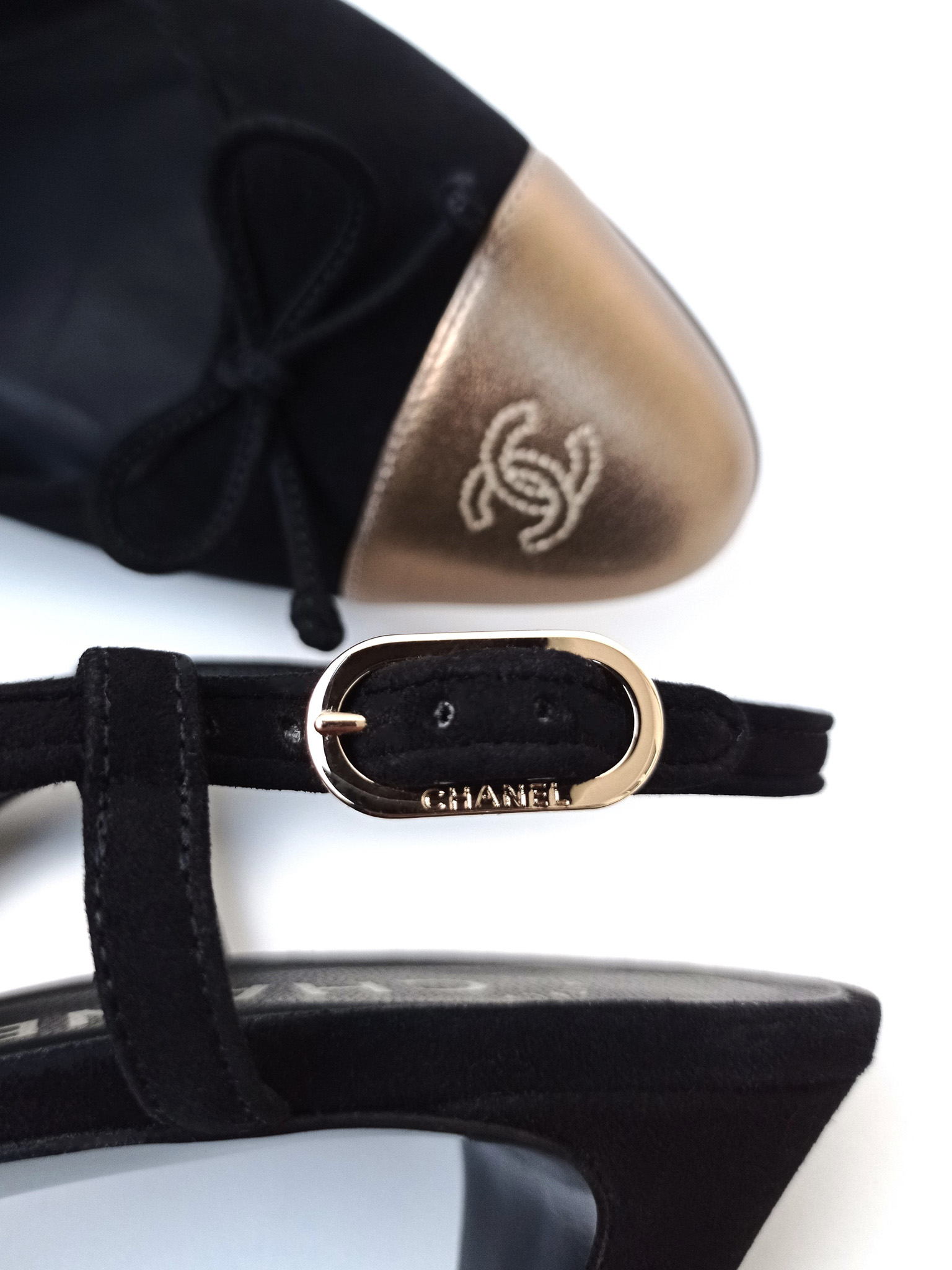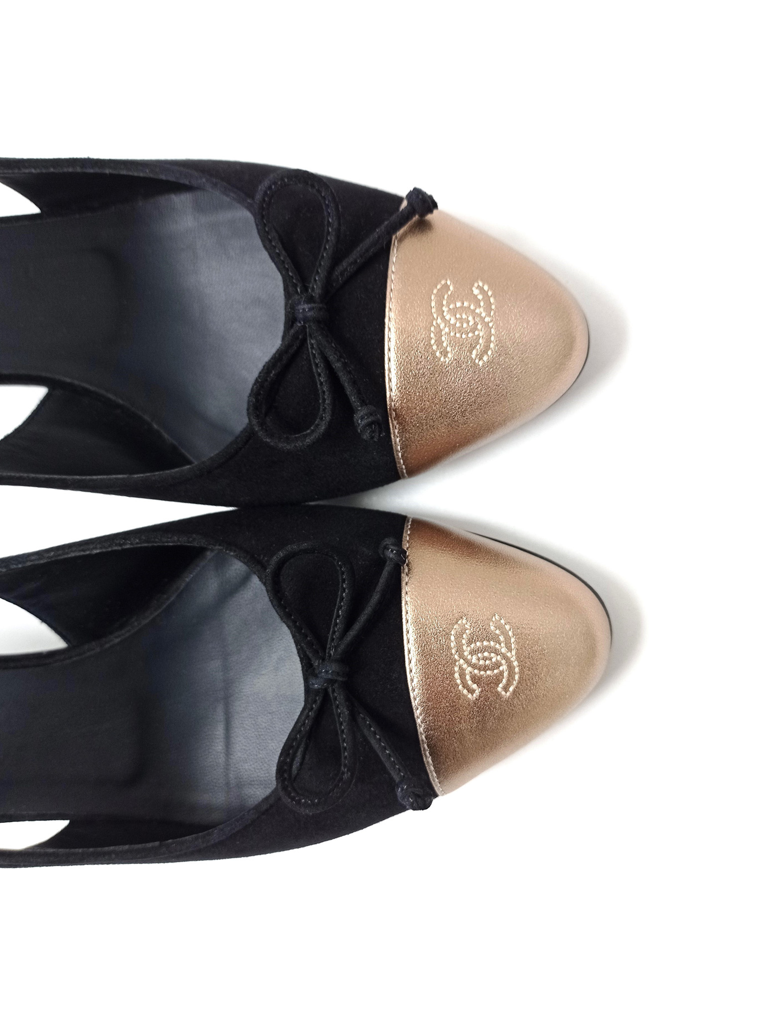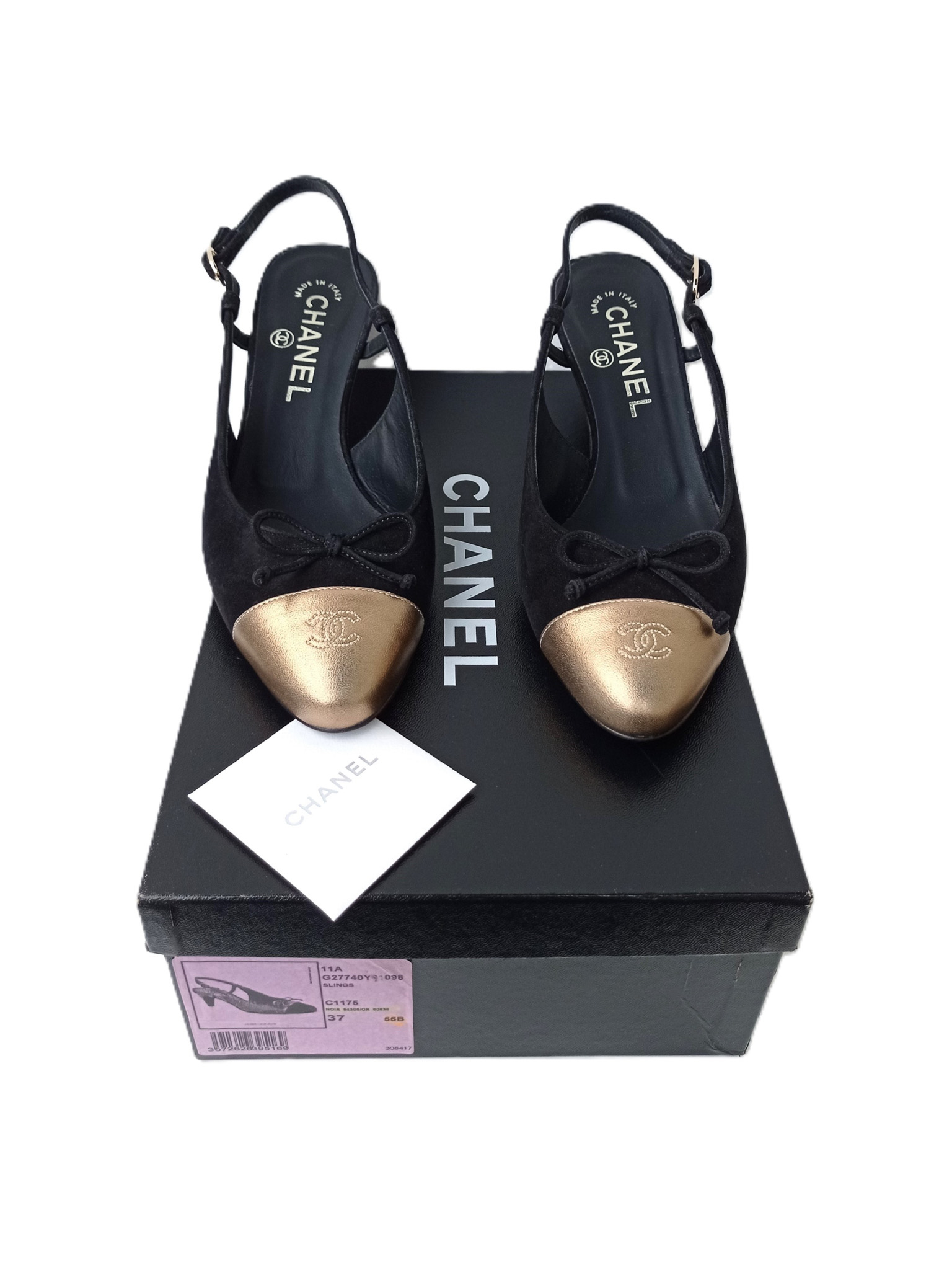 "Model: Slingback. Czółenka wykonane z łączonych skór: czarnego zamszu oraz skóry licowej w złotym kolorze z haftowanym logo CC na przodzie, zapinane na złotą sprzączkę z grawerem marki, skórzana wkładka oraz podeszwa, w zestawie z pudełkiem. Rozmiar 37, dł. wkładki 24cm, wys. obcasa 6cm. Stan bardzo dobry, użyte tylko jeden raz."