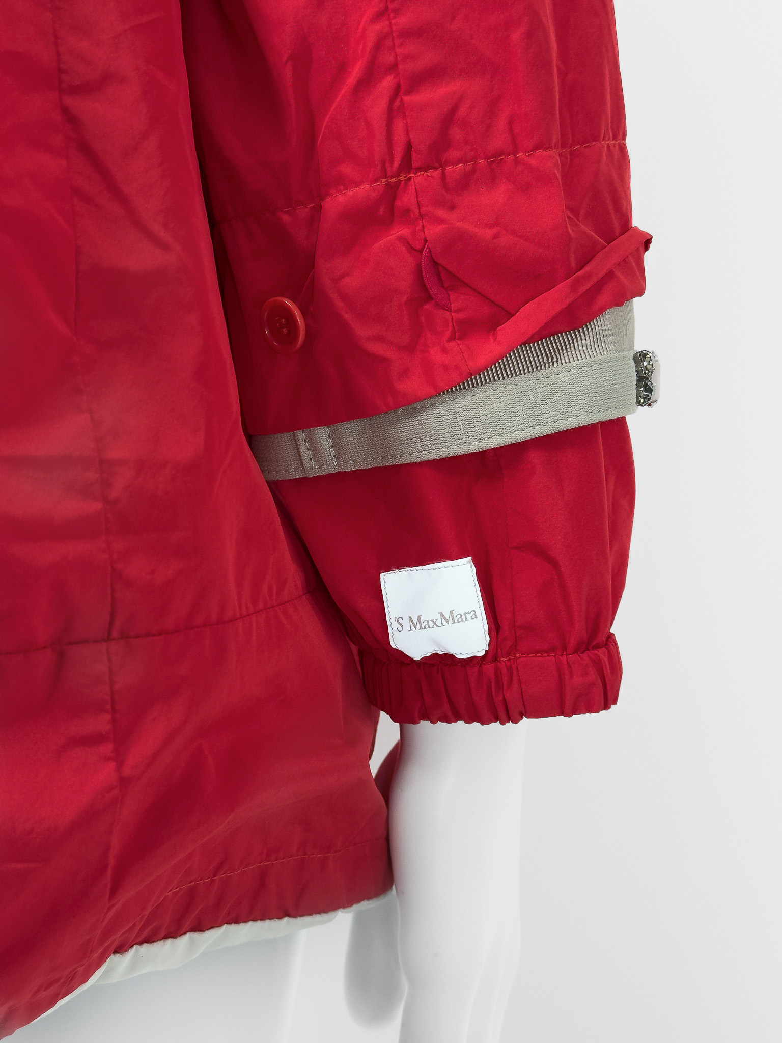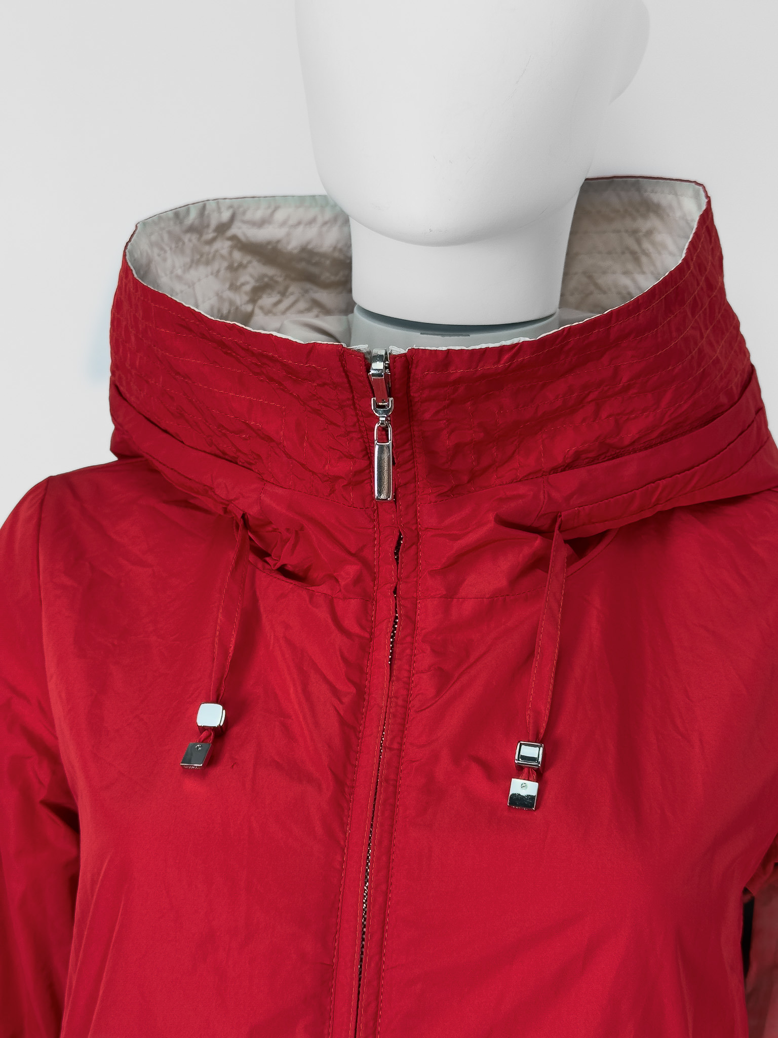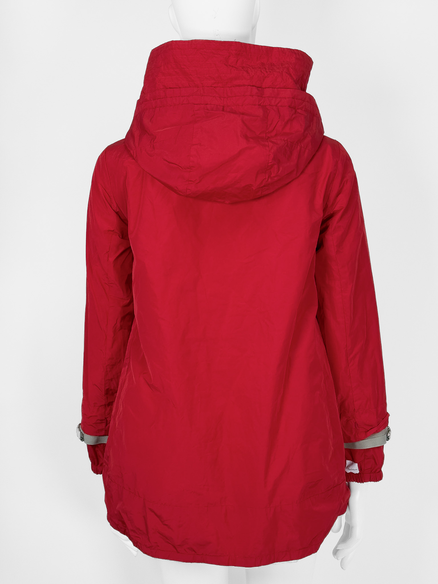 "Czerwono - szara dwustronna ortalionowa kurtka, z kapturem, zapinana na dwa srebrne suwaki, odpinane wstawki przy mankietach wysadzane połyskującymi różowymi kamieniami, regulowana w talii, dwie kryte kieszenie po bokach. Stan bardzo dobry. Rozmiar z metki IT 38. Skład: 100% poliester. Wymiary: szerokość mierzona od pachy do pachy 50cm, długość całkowita 70cm."