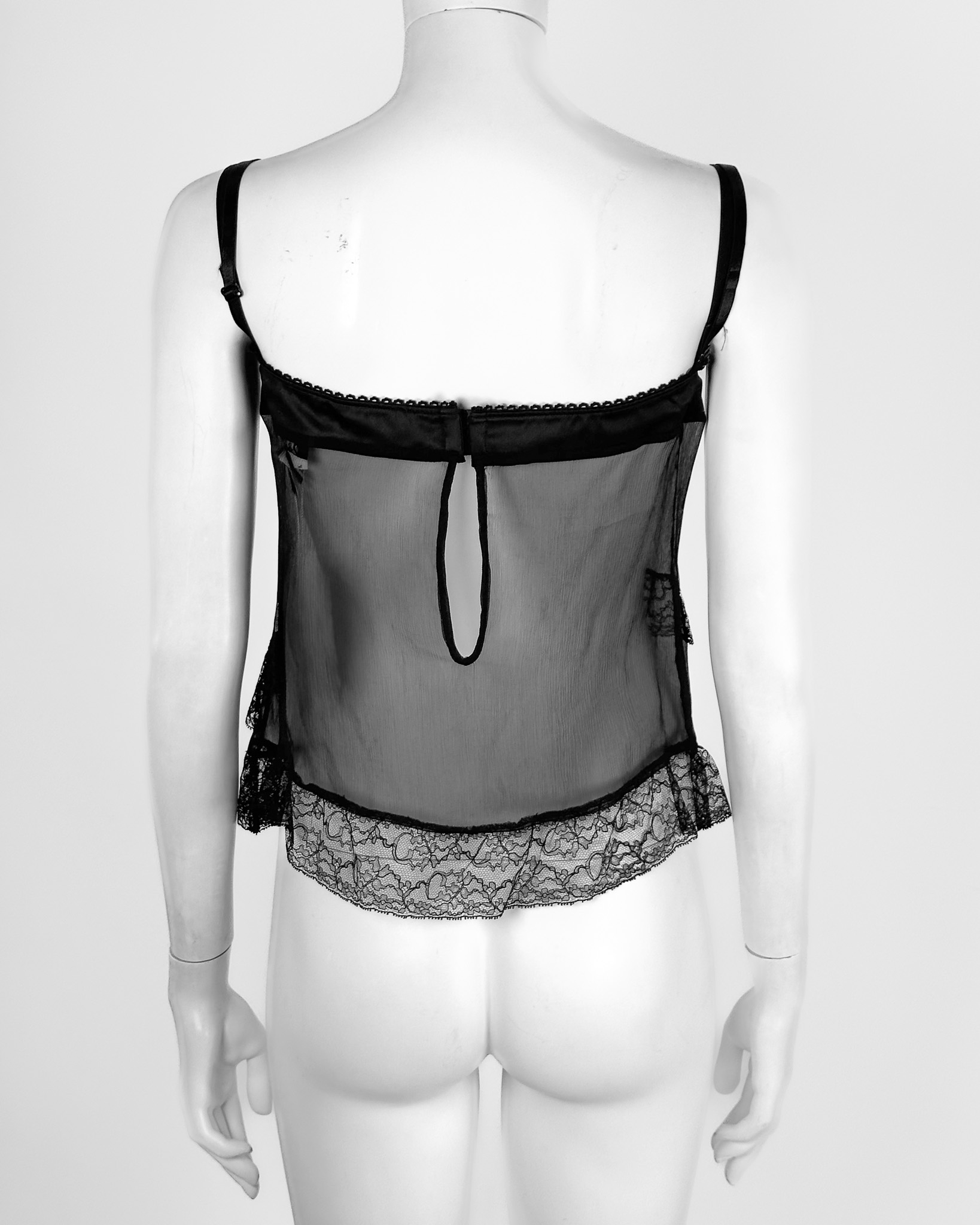 "Czarna halka ozdobiona koronką, krótka, cienkie regulowane ramiączka, częściowo transparentna, biust wykończony satynowym materiałem, prosty dekolt z wiązaną kokardą, wszyte fiszbiny, regulowana z tyłu, zapinana na dwie kryte czarne haftki. Rozmiar z metki IT 42. Wycięta metka ze składem."