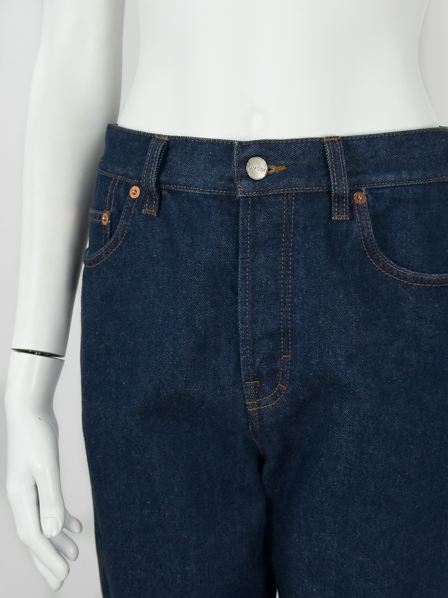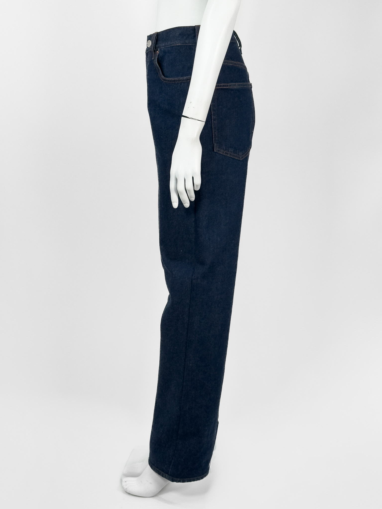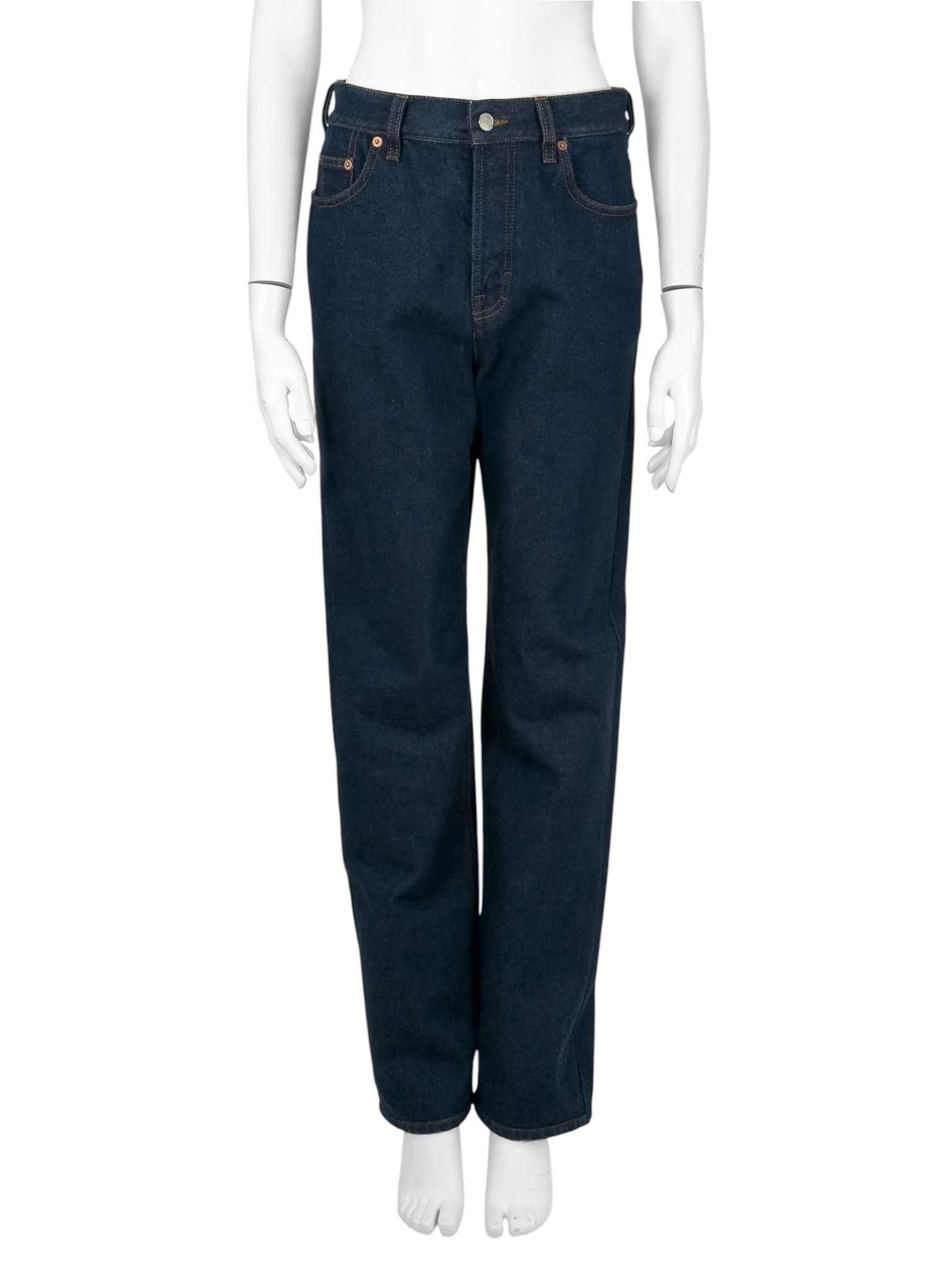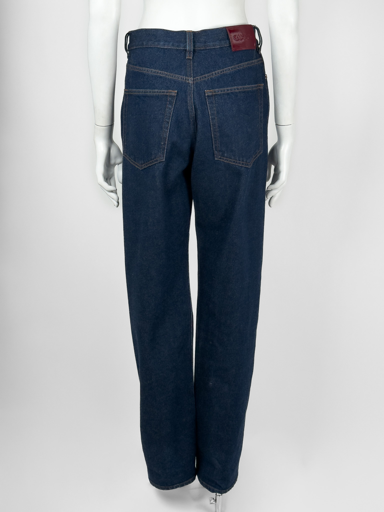 "Ciemno - granatowe jeansy, brązowe przeszycia, miedziane okucia oraz srebrny guzik, z tyłu bordowe logo marki, wysoki stan, długa nogawka. Rozmiar z metki 26. Skład: 100% bawełna. Wymiary: szerokość w pasie 38cm, długość mierzona od zewnętrznej strony nogawki 112cm."