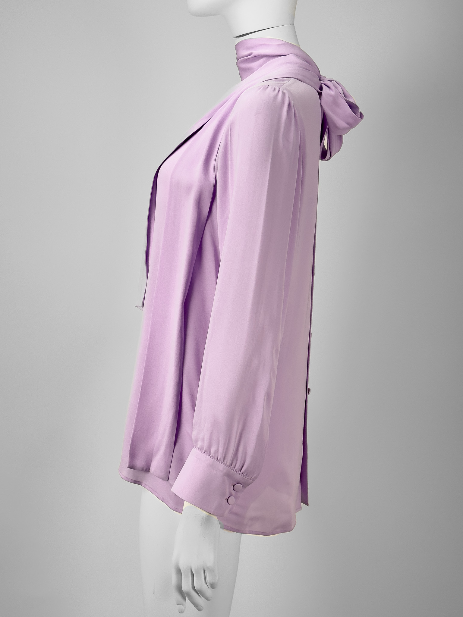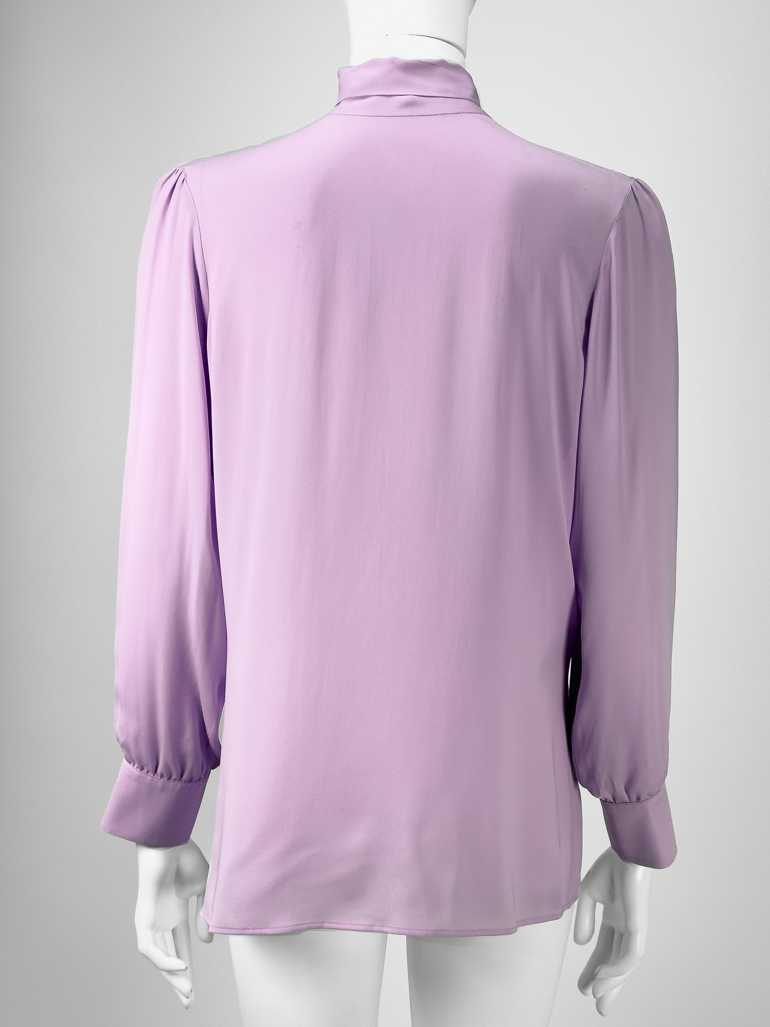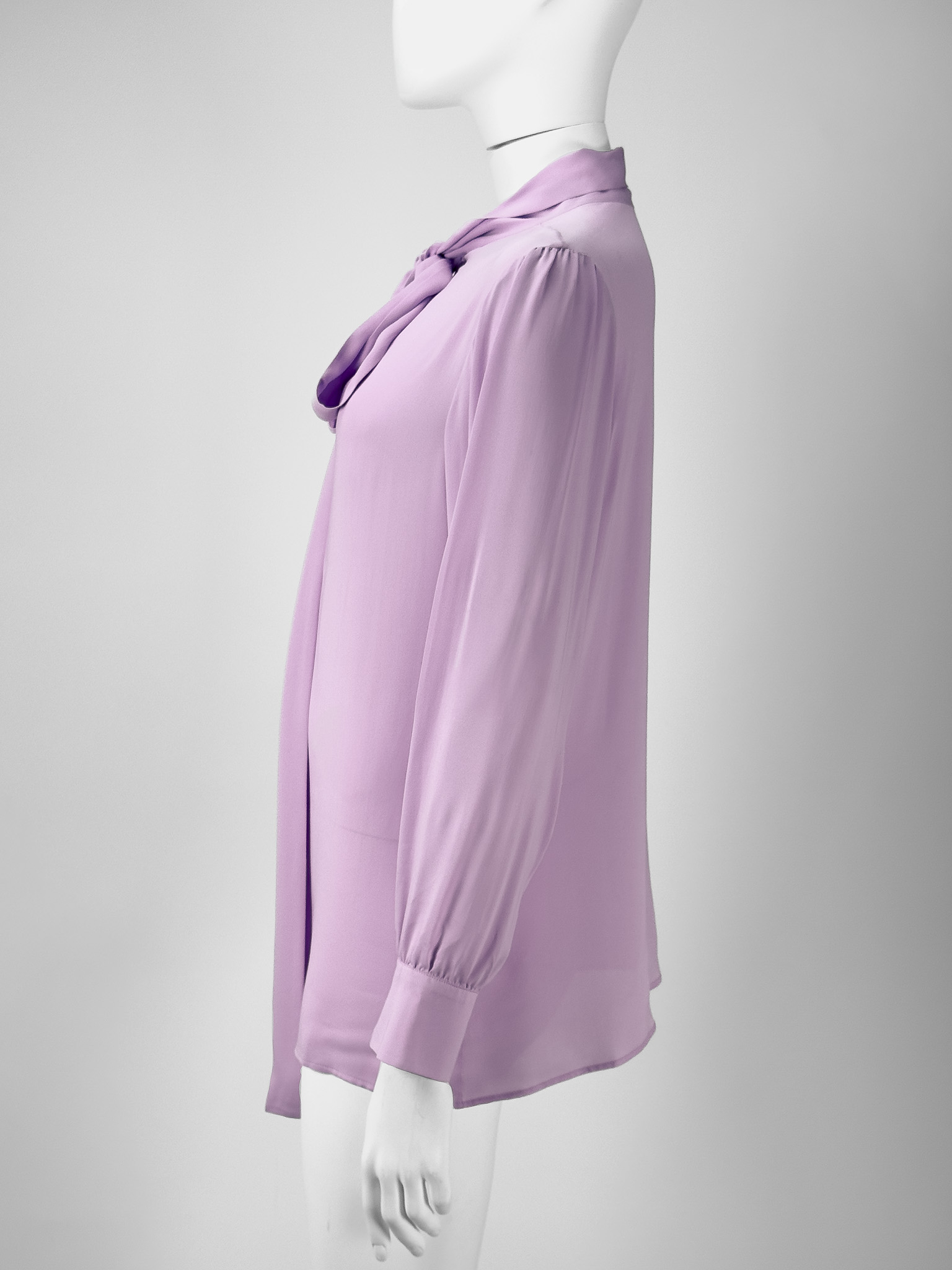 "Liliowa jedwabna koszula, wiązana w okolicy dekoltu, zapinana na guziki, bufiaste rękawy, rozpinane mankiety. Stan bardzo dobry. Rozmiar z metki IT 42. Skład: 100% jedwab. Wymiary: szerokość mierzona od pachy do pachy 48cm, długość całkowita 68cm."