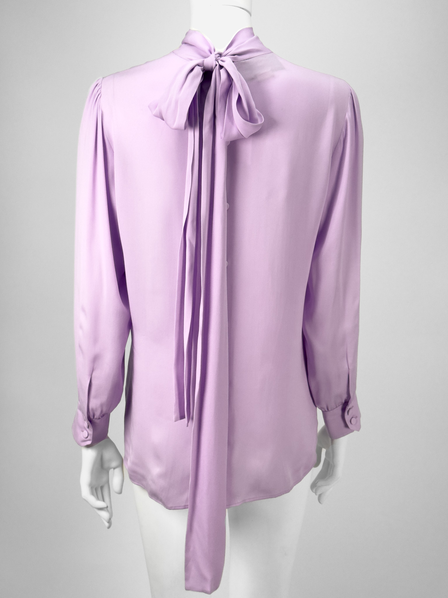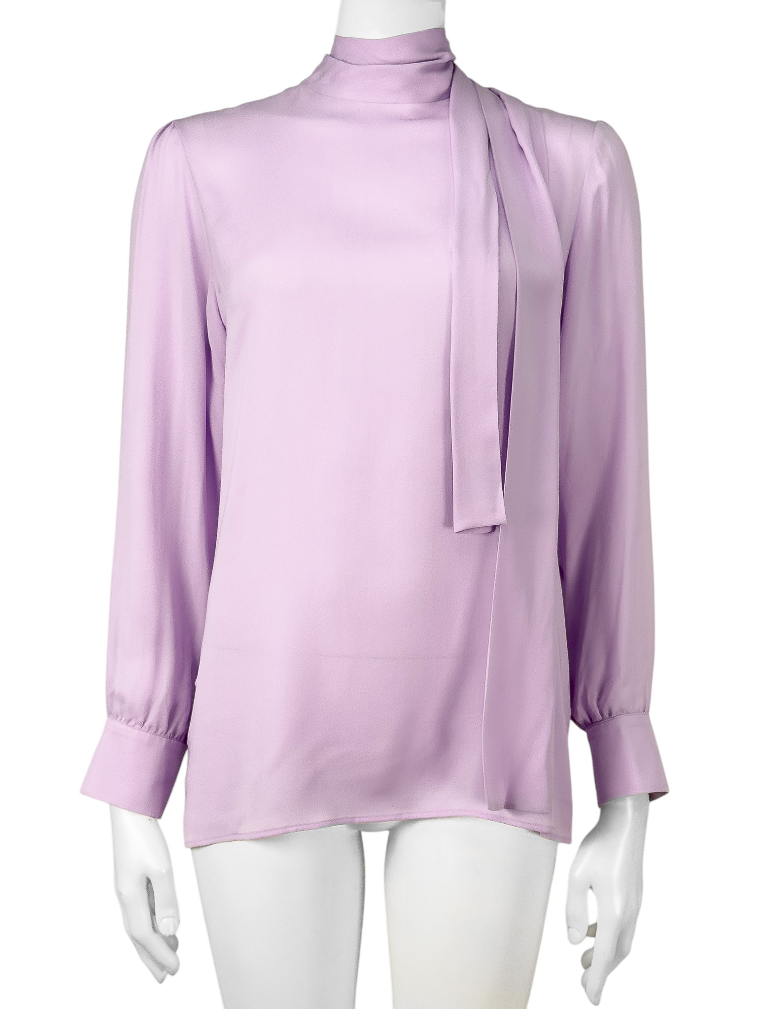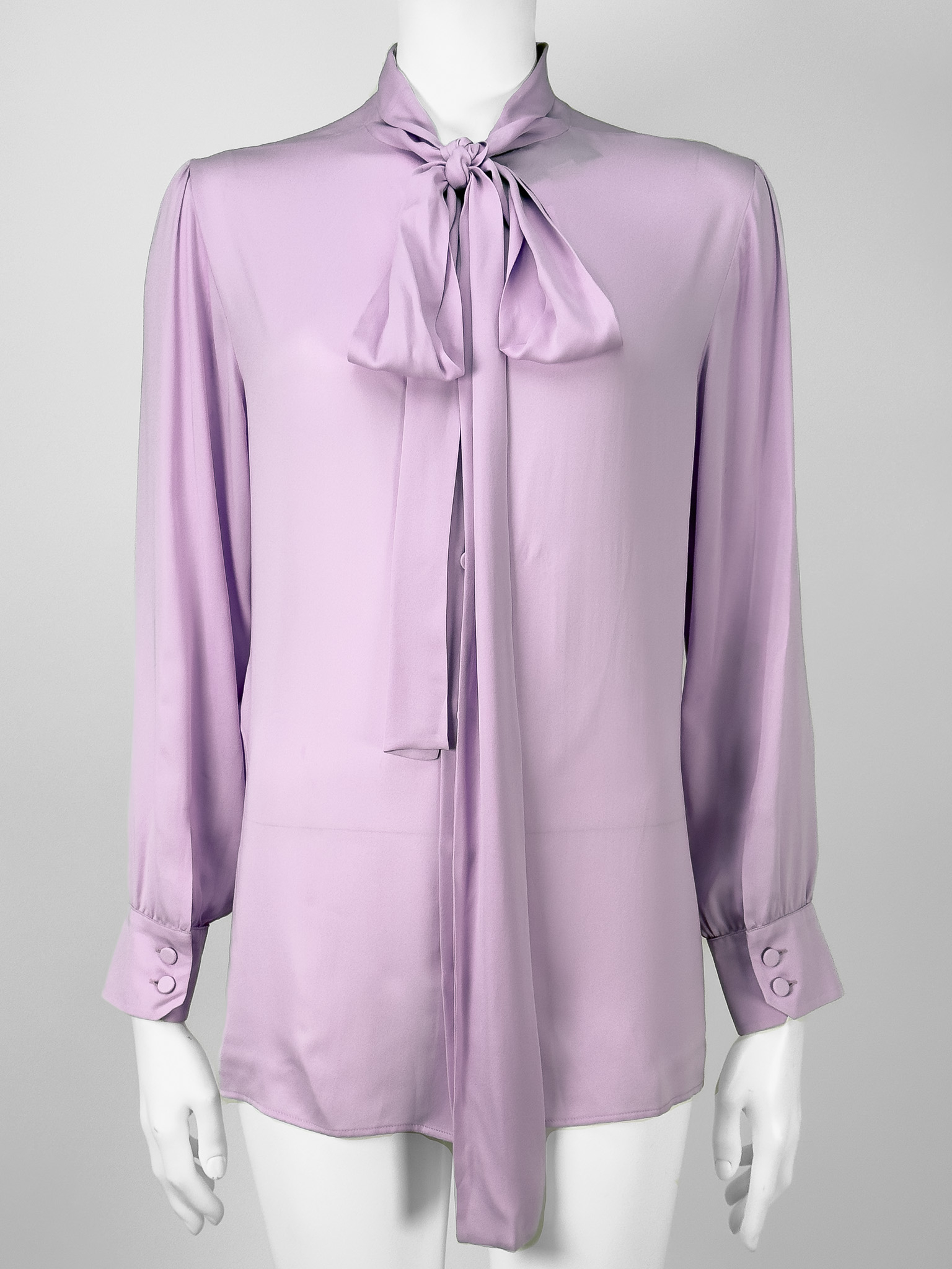 "Liliowa jedwabna koszula, wiązana w okolicy dekoltu, zapinana na guziki, bufiaste rękawy, rozpinane mankiety. Stan bardzo dobry. Rozmiar z metki IT 42. Skład: 100% jedwab. Wymiary: szerokość mierzona od pachy do pachy 48cm, długość całkowita 68cm."