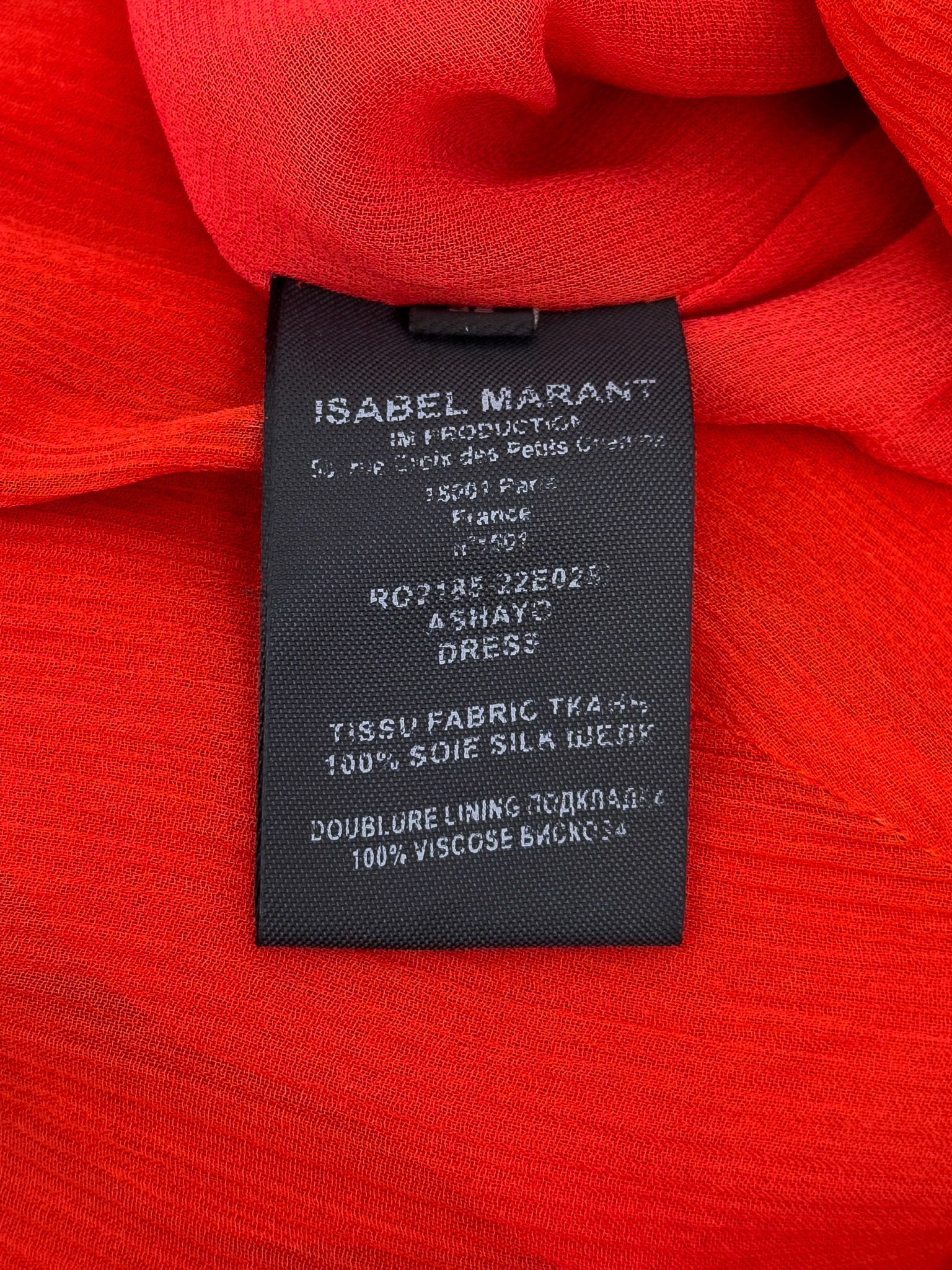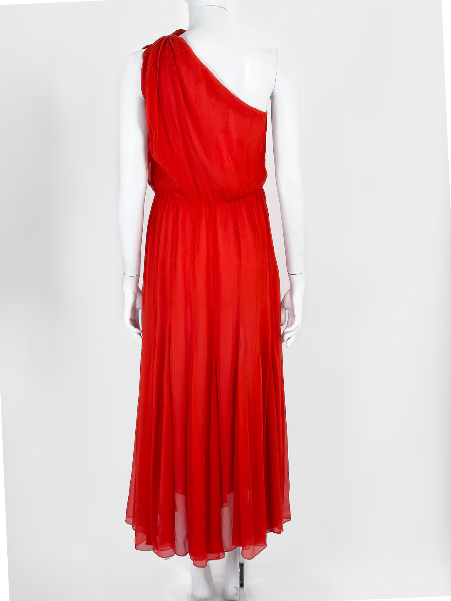 "Jedwabna czerwona sukienka ozdobiona wiązaniem na ramieniu, bez rękawów, długość midi, taliowana, delikatnie rozkloszowany dół, w zestawie z metką. Rozmiar z metki FR 38. Skład: 100% jedwab; podszewka: 100% wiskoza. Wymiary: szerokość mierzona od pachy do pachy 47cm, długość całkowita 150cm."