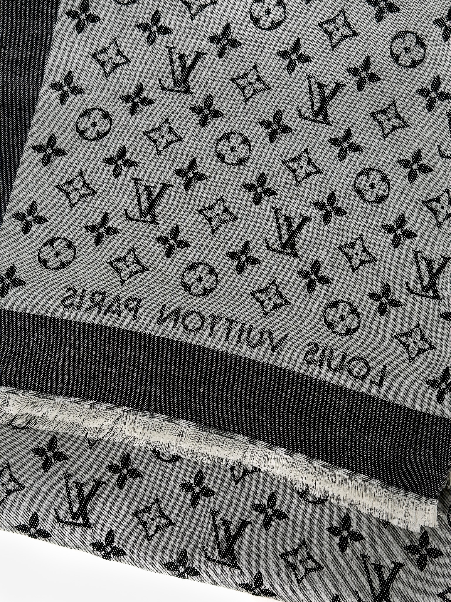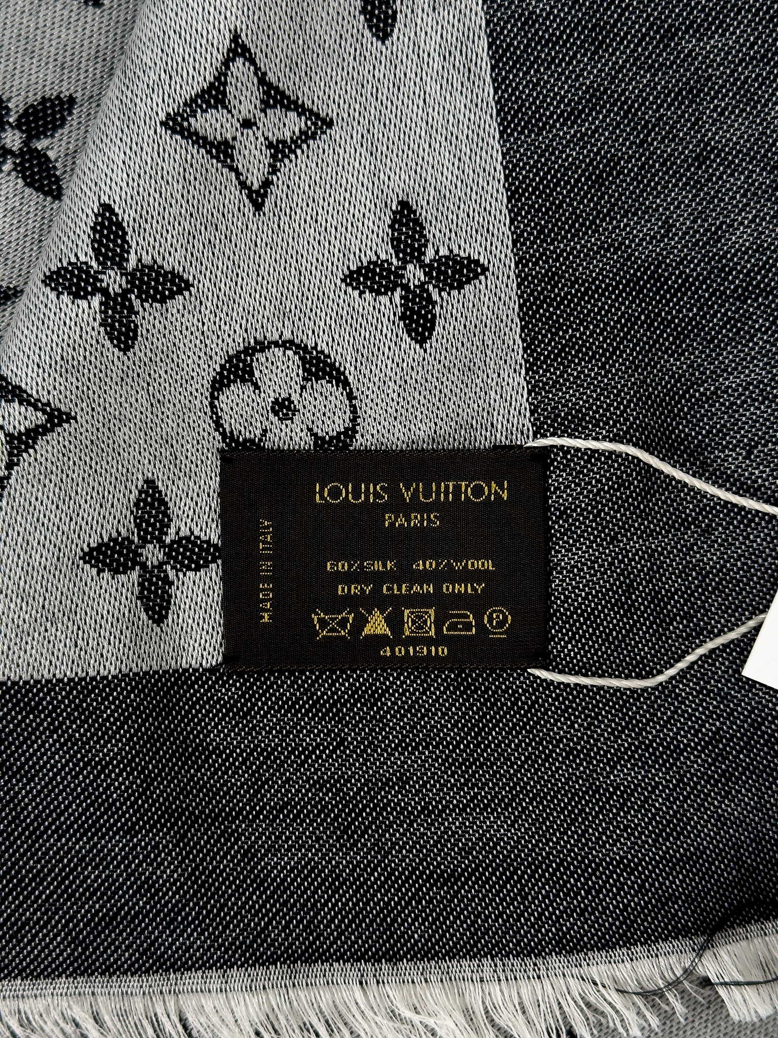 "Szara jedwabno-wełniana chusta w czarne logo marki, zakończona krótkimi frędzlami, logo marki przy jednym rogu. Stan bardzo dobry, posiada drobne zaciągnięcia. Skład: 60% jedwab, 40% wełna. Wymiary: 144cm x 138cm."