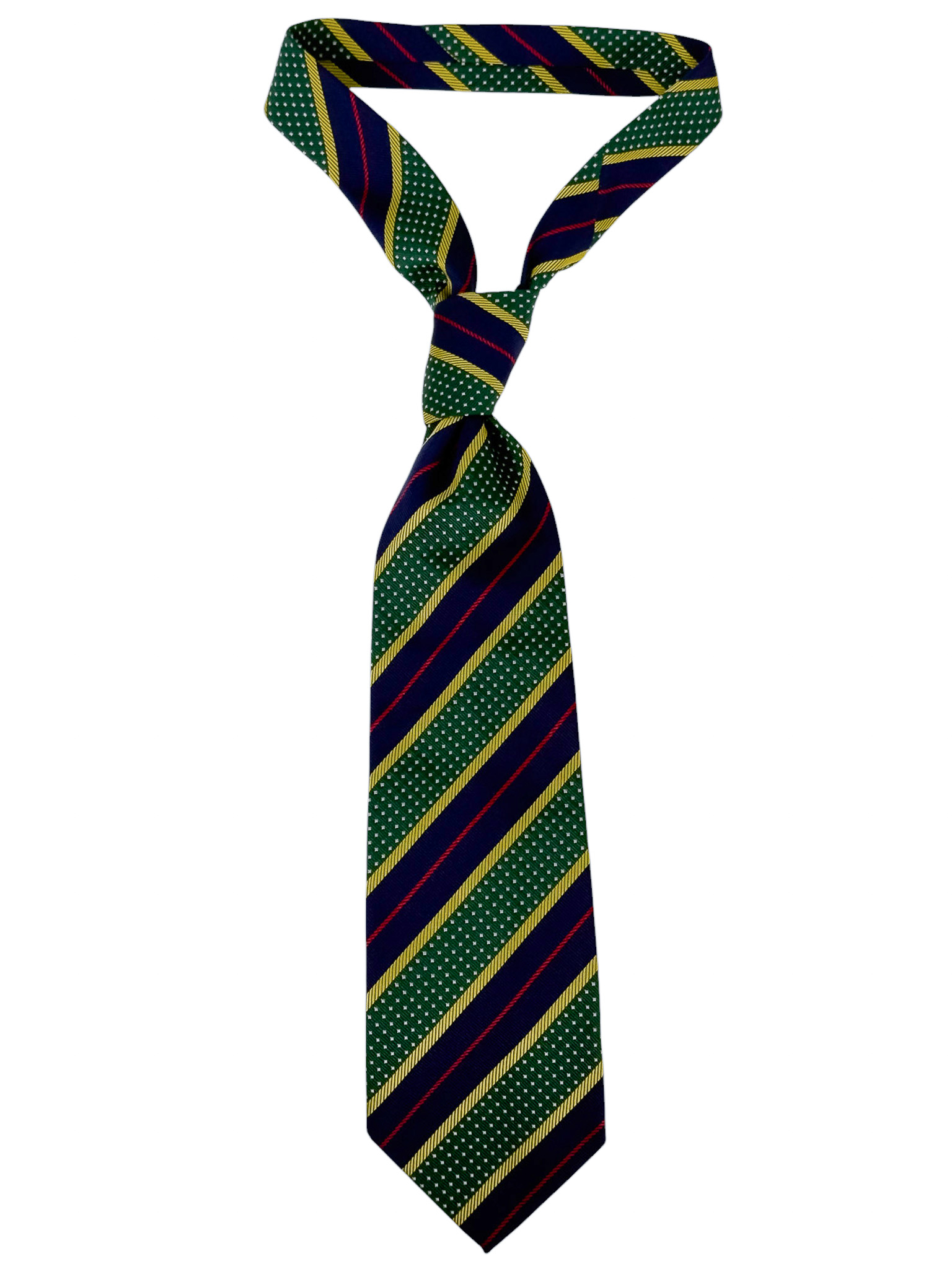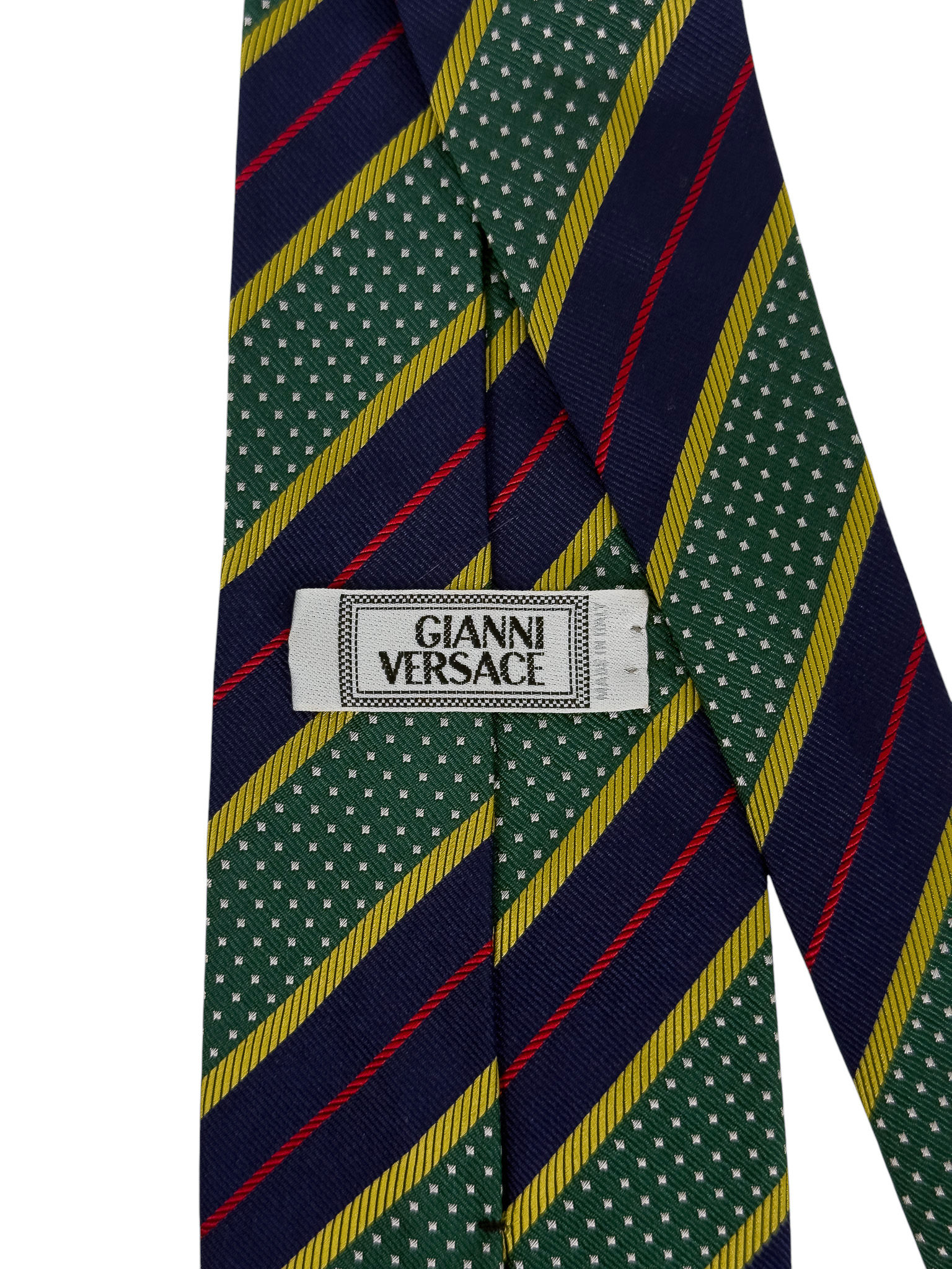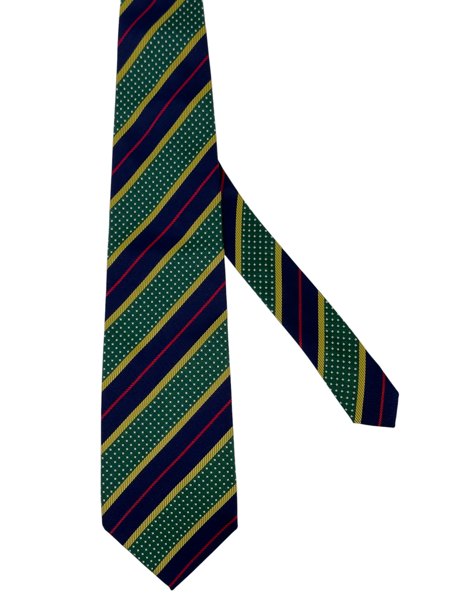 "Wielobarwny jedwabny krawat w odcieniach zieleni, granatu, żółci oraz czerwieni, w motyw pasków ułożonych na skos. Stan bardzo dobry. Skład: 100% jedwab."