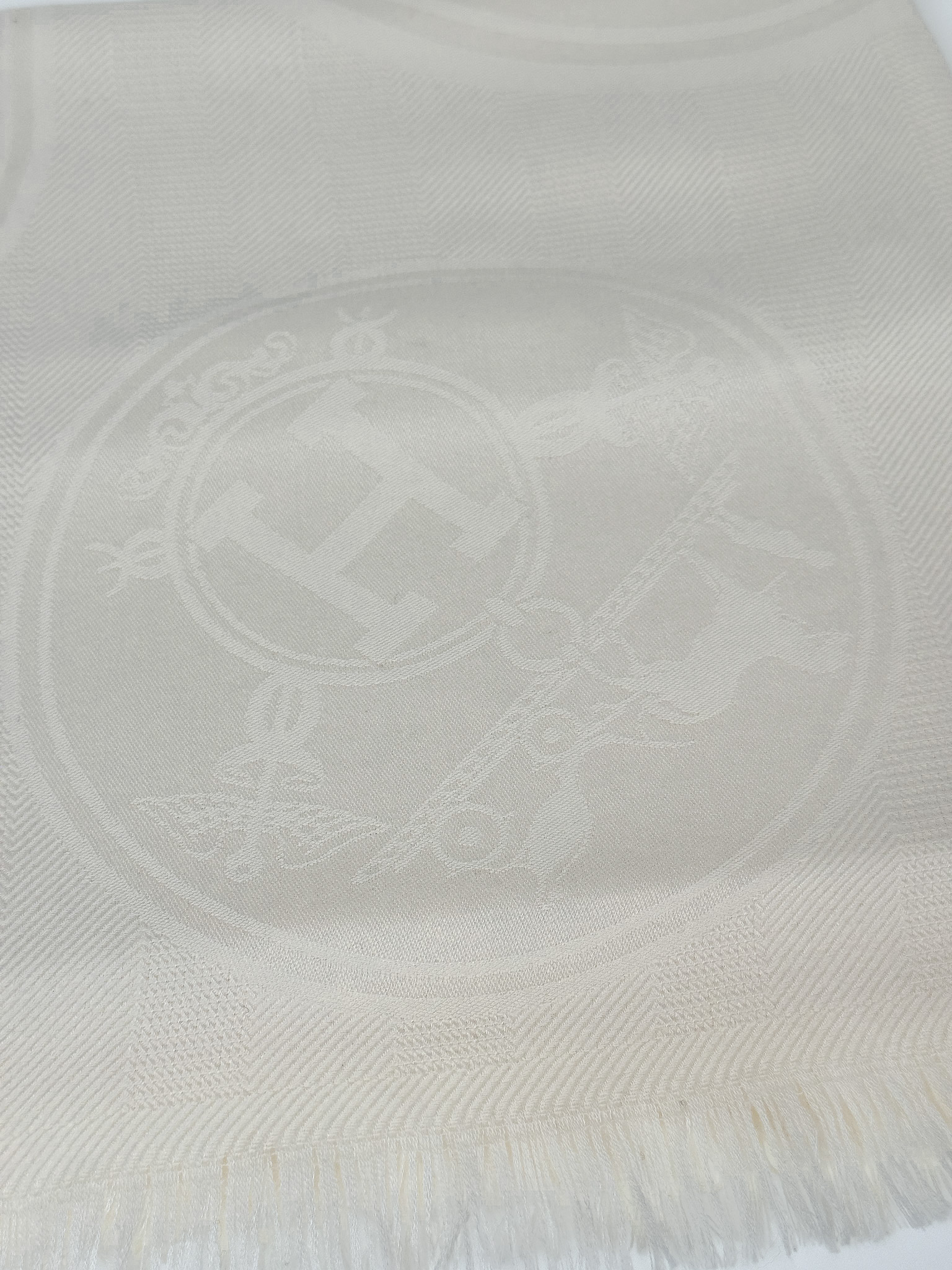 "model: New Libris stole. Kremowy kaszmirowo-jedwabny szal, we wzór marki. Skład: 85% kaszmir, 15% jedwab. Stan: bardzo dobry. Wymiary: 75cm x 212cm."