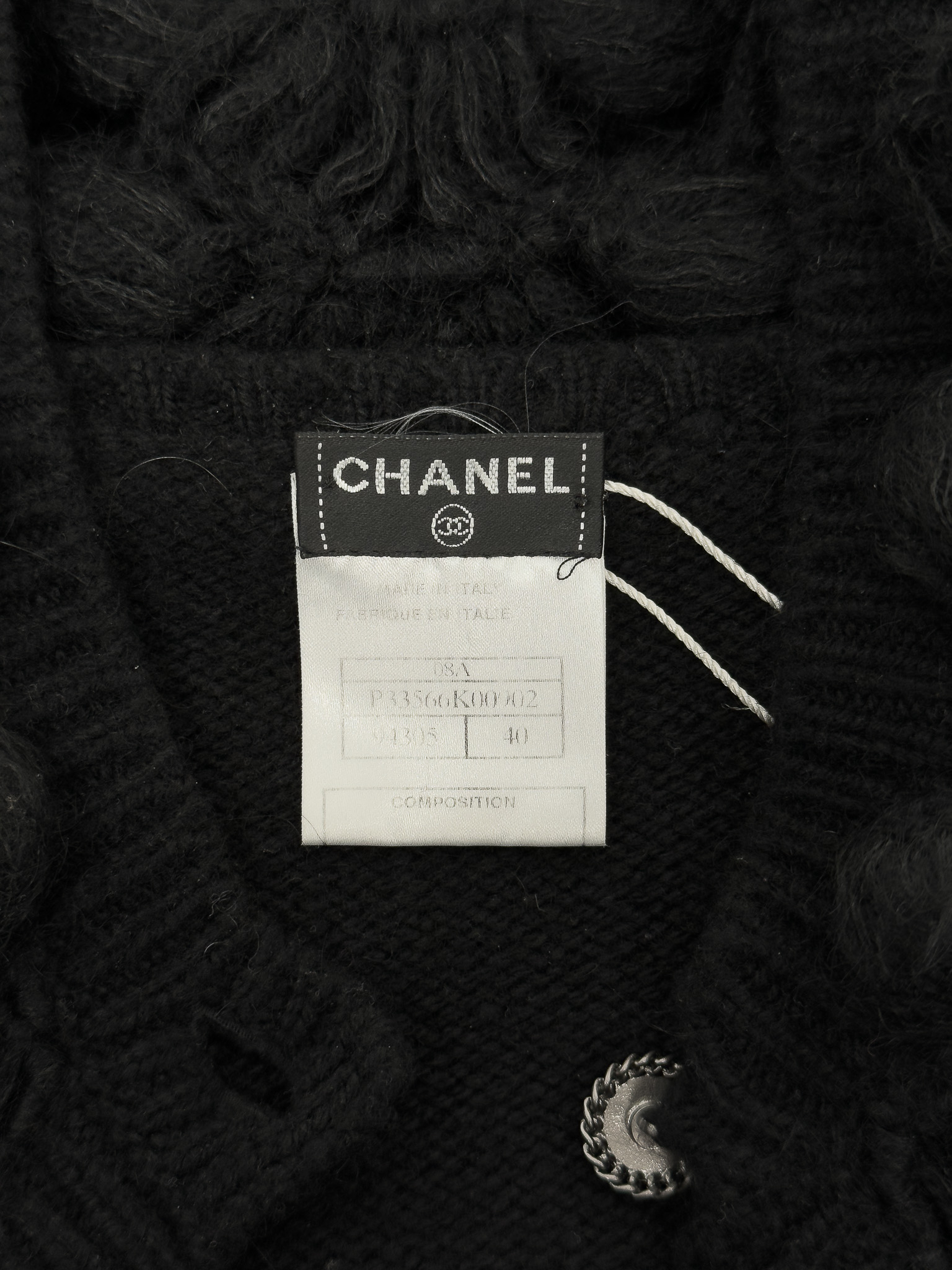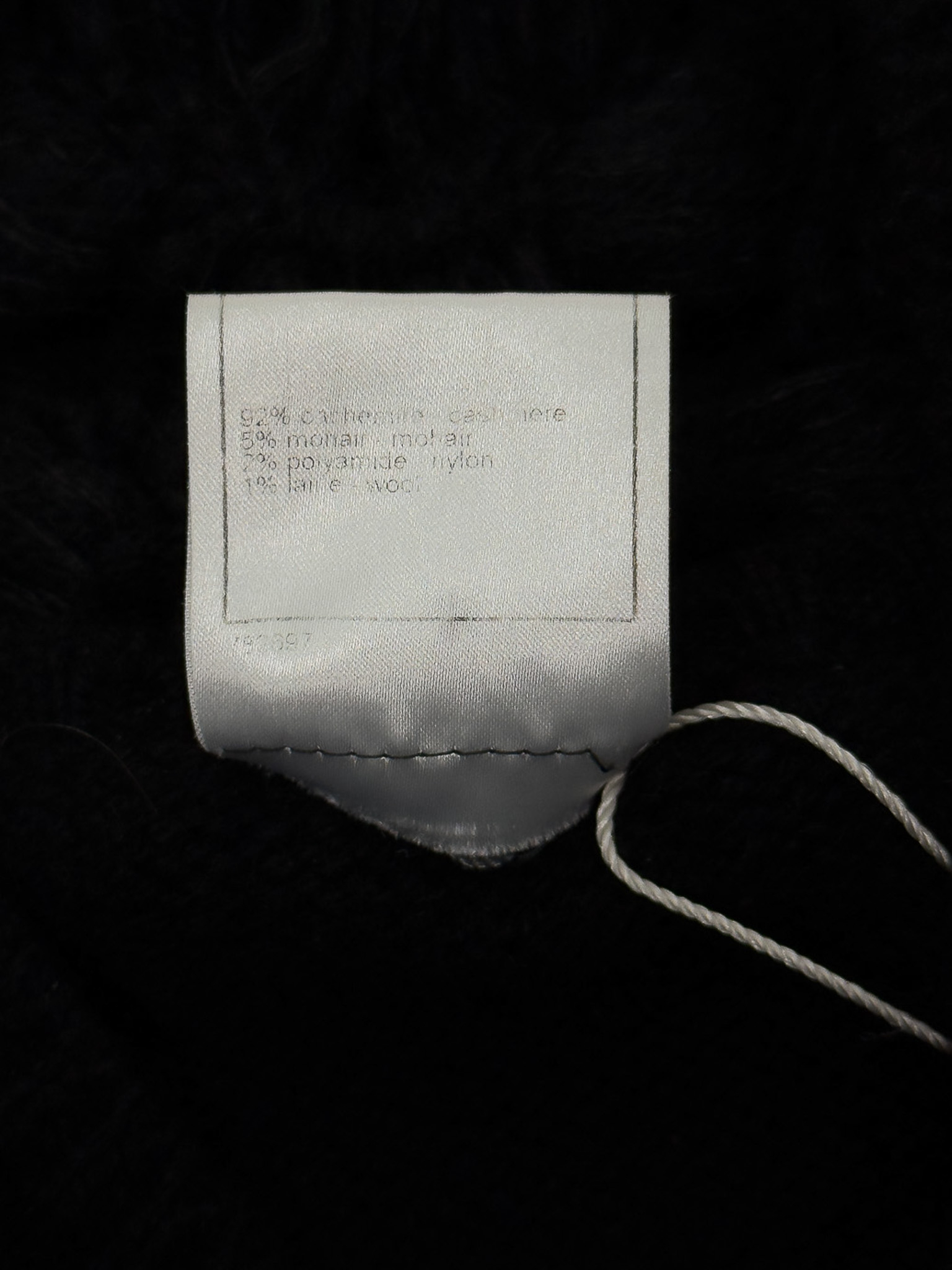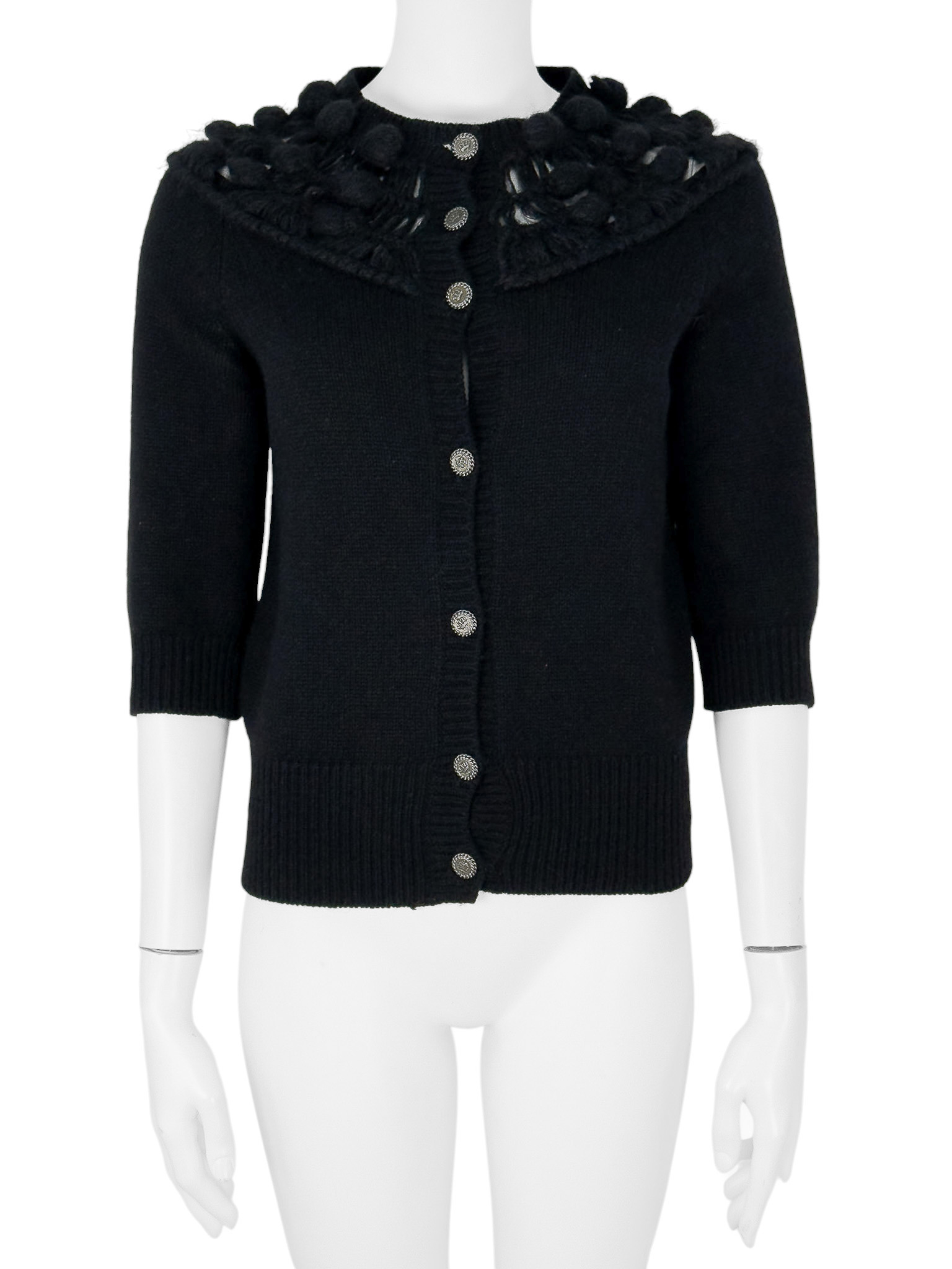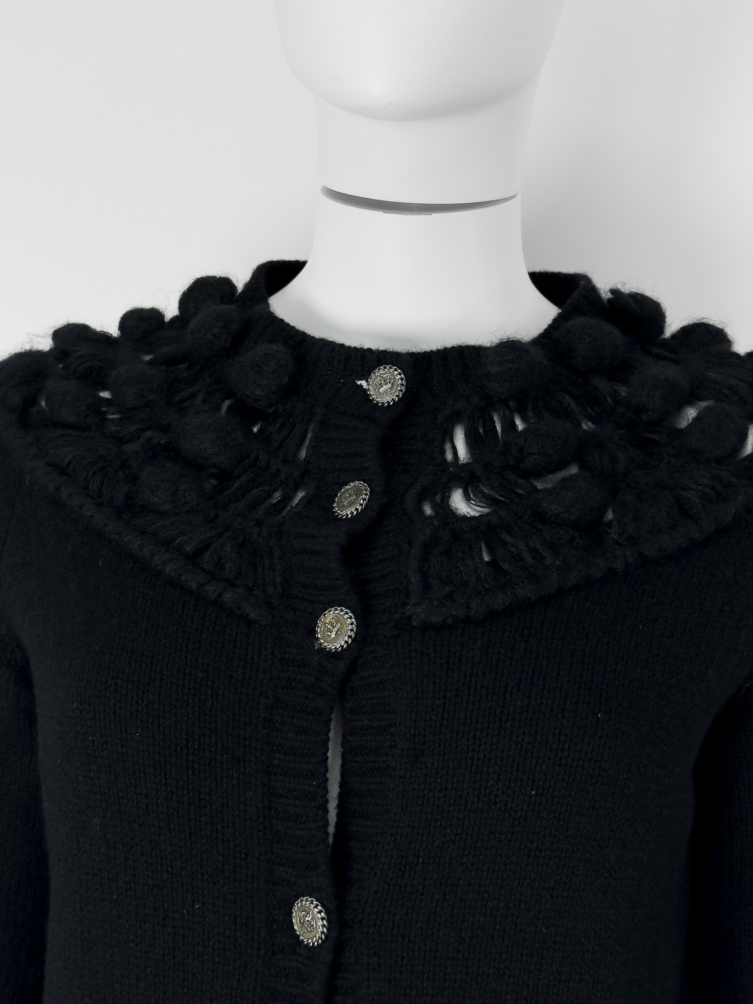 "Czarny kaszmirowy kardigan z domieszką moheru w składzie, zapinany na guziki z grafiką korony z logo marki, ażurowy w górnej części ozdobiony naszytymi kulkami, zaokrąglony dekolt, rękaw o długości 3/4, wykończony ściągaczem. Stan bardzo dobry. Rozmiar z metki IT 40. Skład: 92% kaszmir, 5% moher, 2% poliamid, 1% wełna. Wymiary: szerokość mierzona do pachy do pachy 44cm, długość całkowita 58cm."