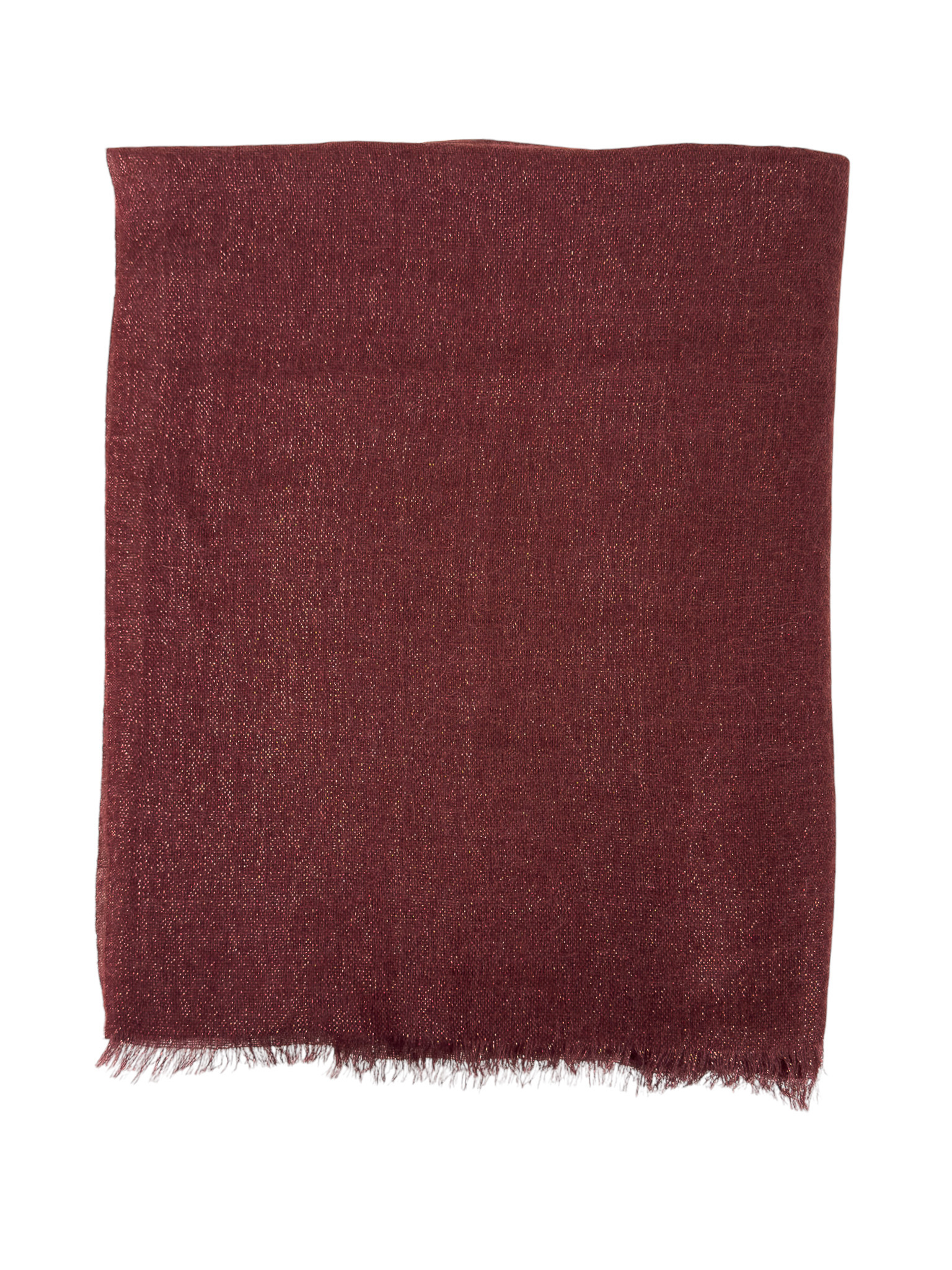 "Bordowy szal z błyszczącą nitką, surowo wykończony. Kaszmir. Ucięta metka z składem procentowym. Wymiary: 90cm x 206cm."