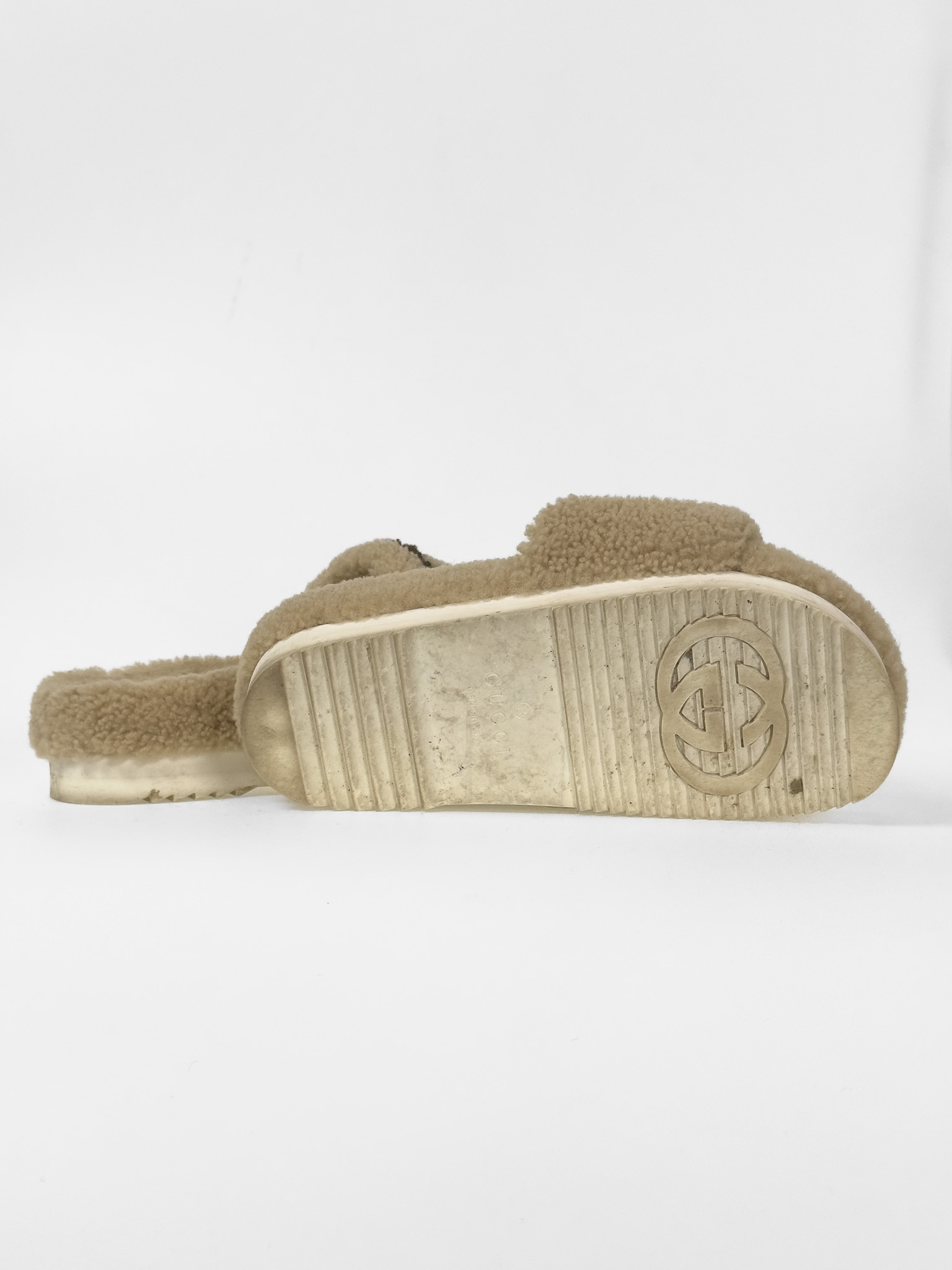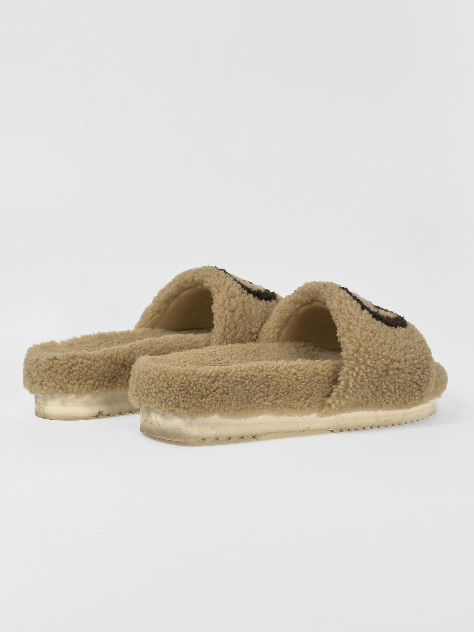 "Beżowe futrzane klapki ozdobione brązowym logo marki na przodzie, zaokrąglone noski, biała gumowa ząbkowana wyższa podeszwa, w zestawie z workami przeciwkurzowymi. Stan dobry, posiadają ślady użytkowania na wkładce, zabrudzenia na materiale oraz podeszwie. Rozmiar 38."