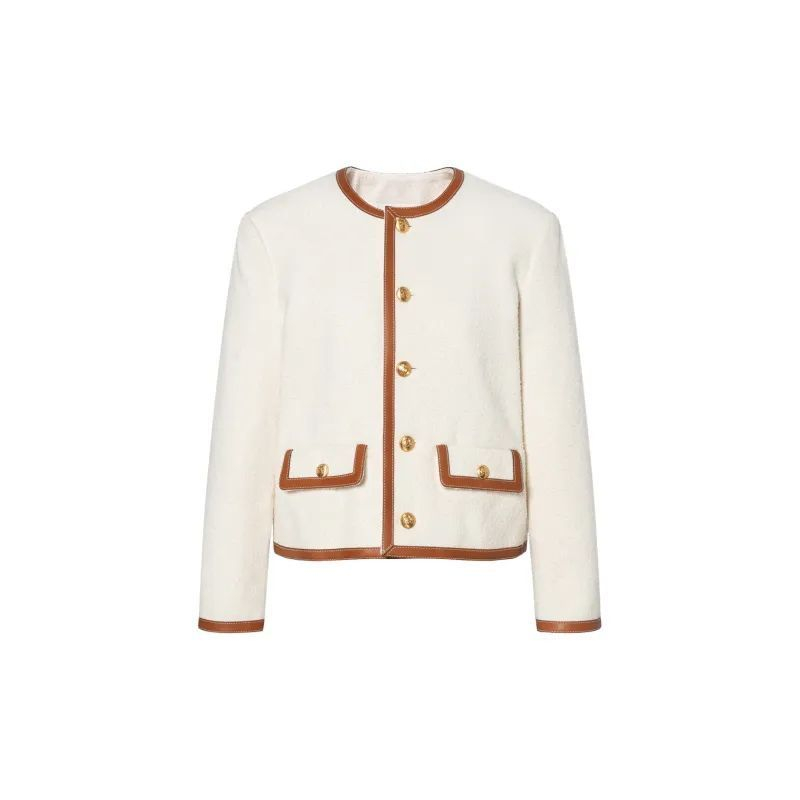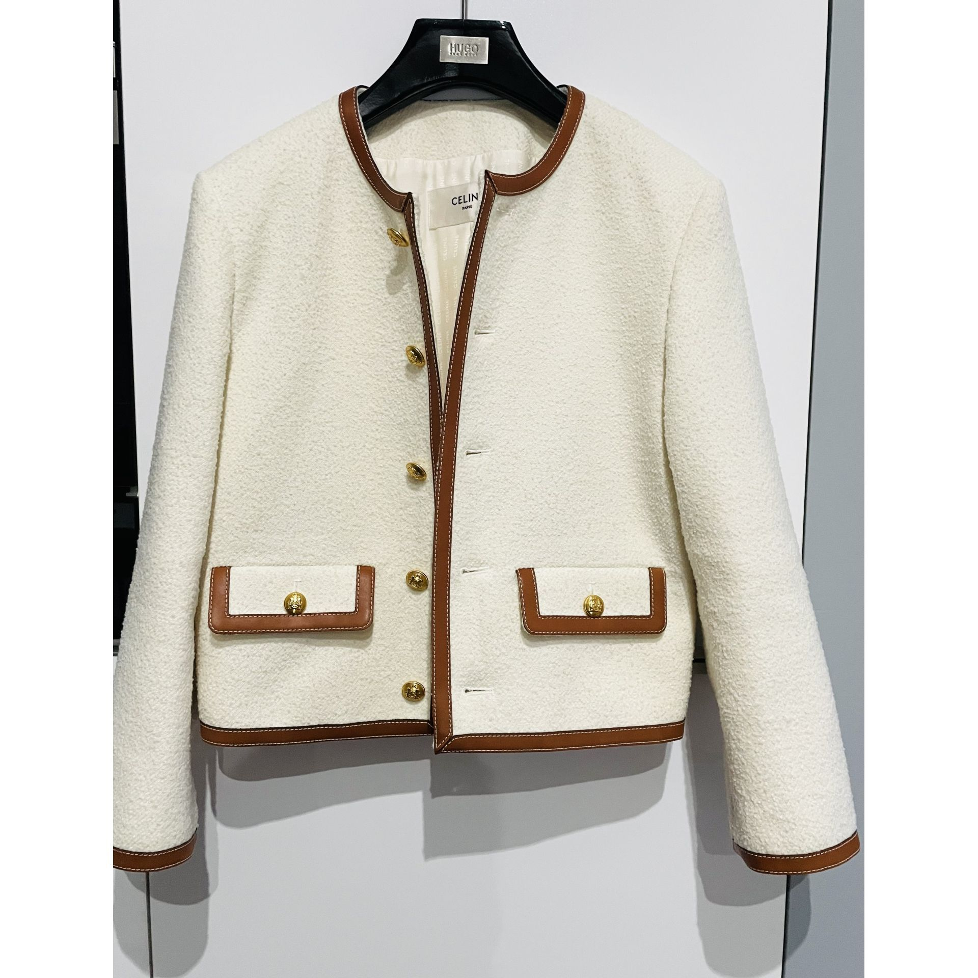 "CELINE - MARYNARKA W KOLORZE OFF WHITE/ECRU NA LOGOWANEJ PODSZEWCE - KLASYCZNY PUDEŁKOWY FASON. MATERIAŁ POSIADA CIEKAWĄ FATURĘ, WYKOŃCZONY BEŻOWĄ SKÓRKĄ, ZŁOTE GUZIKI. ROZMIAR M. CENY TYCH ŻAKIETÓW TO 15 TYS PLN. STAN BARDZO DOBRY."