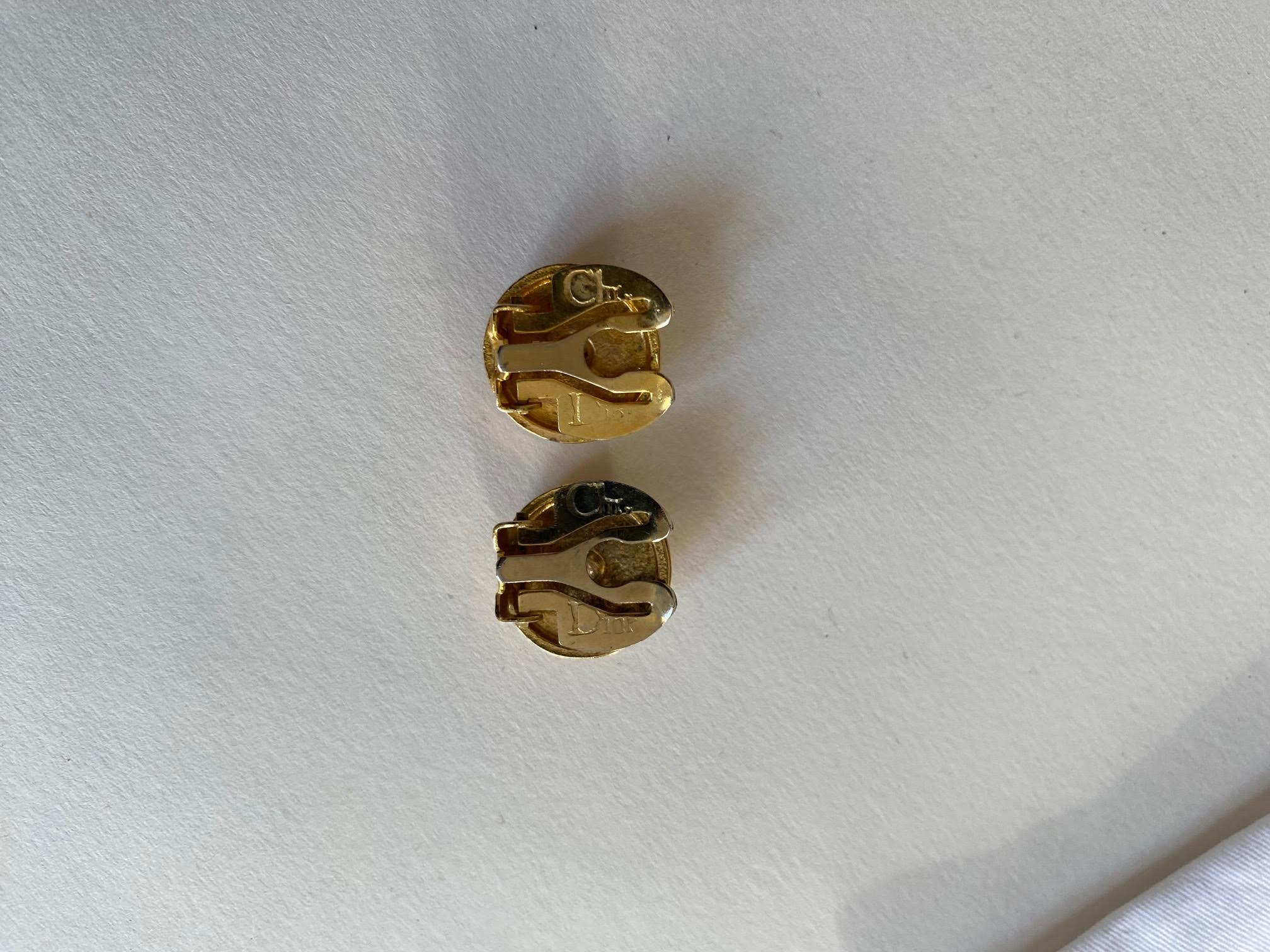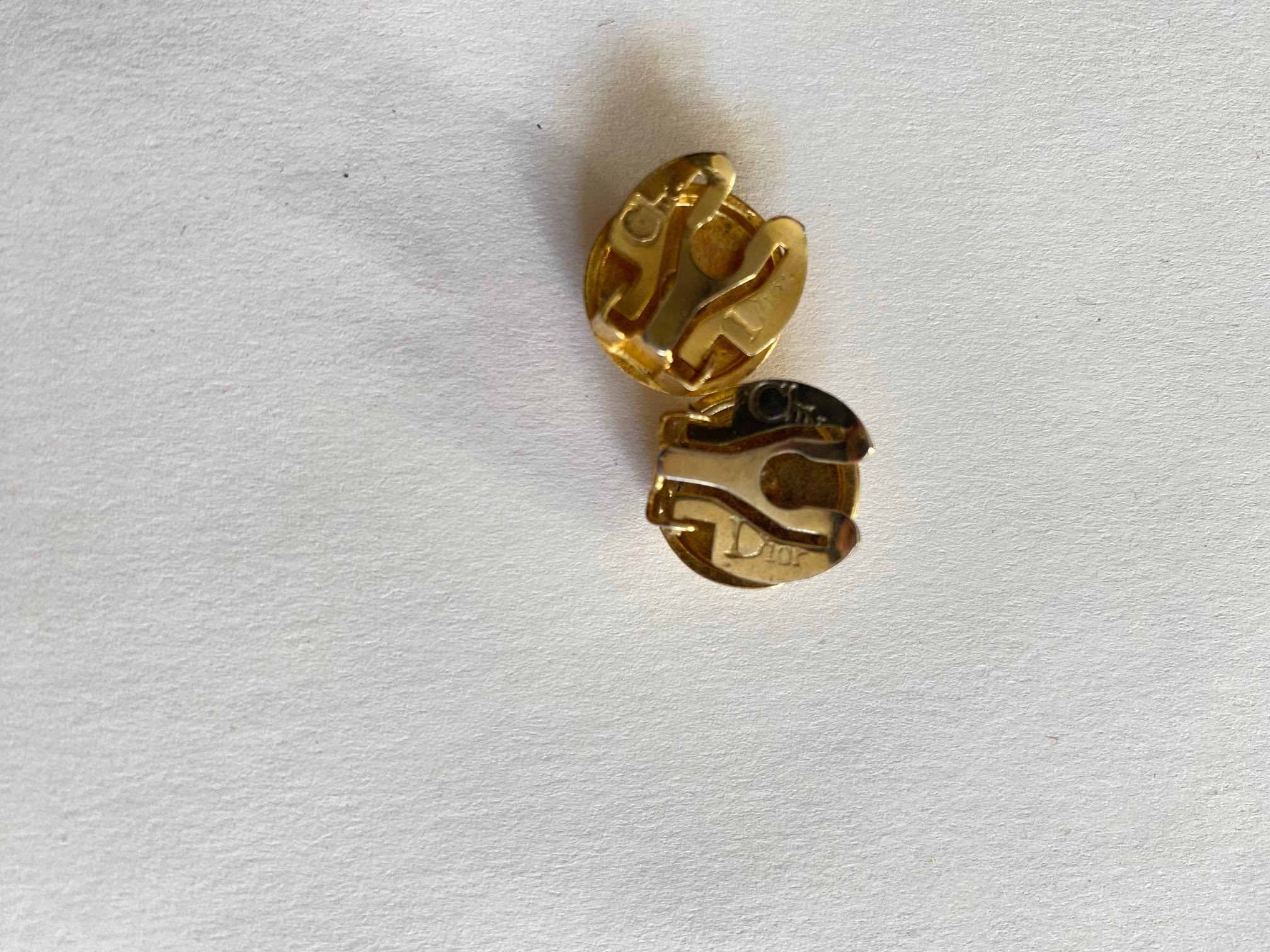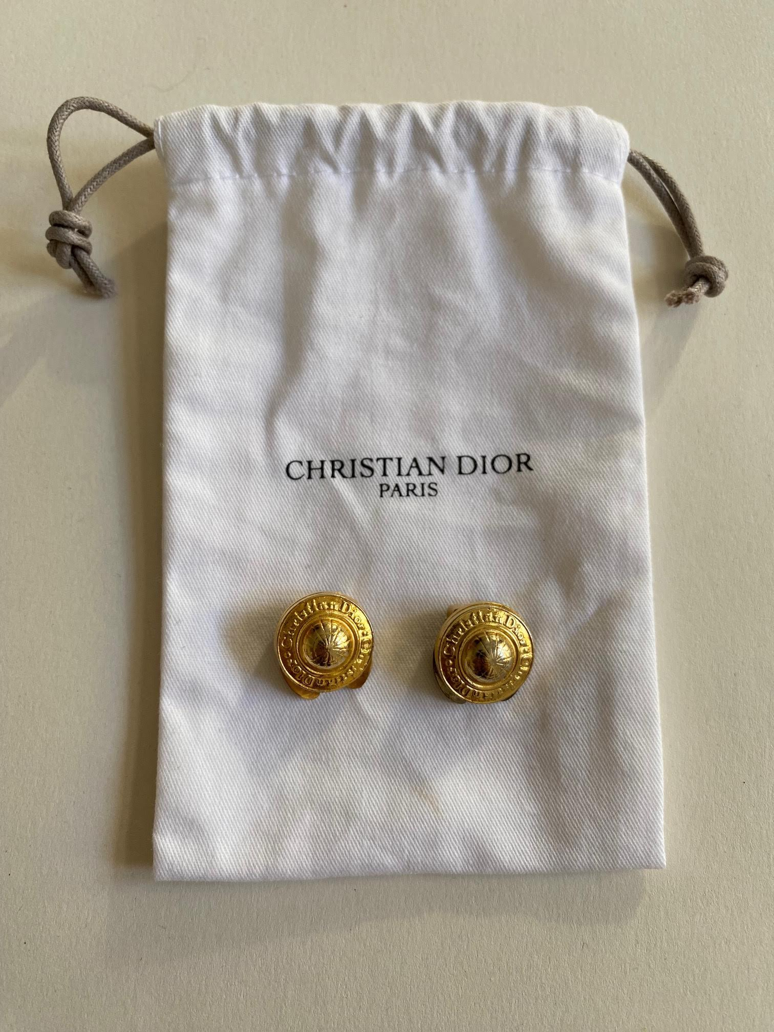 "Złote klipsy ozdobione logowaniem, okrągły kształt, w zestawie z woreczkiem. Wymiary: średnica 1,5 cm."