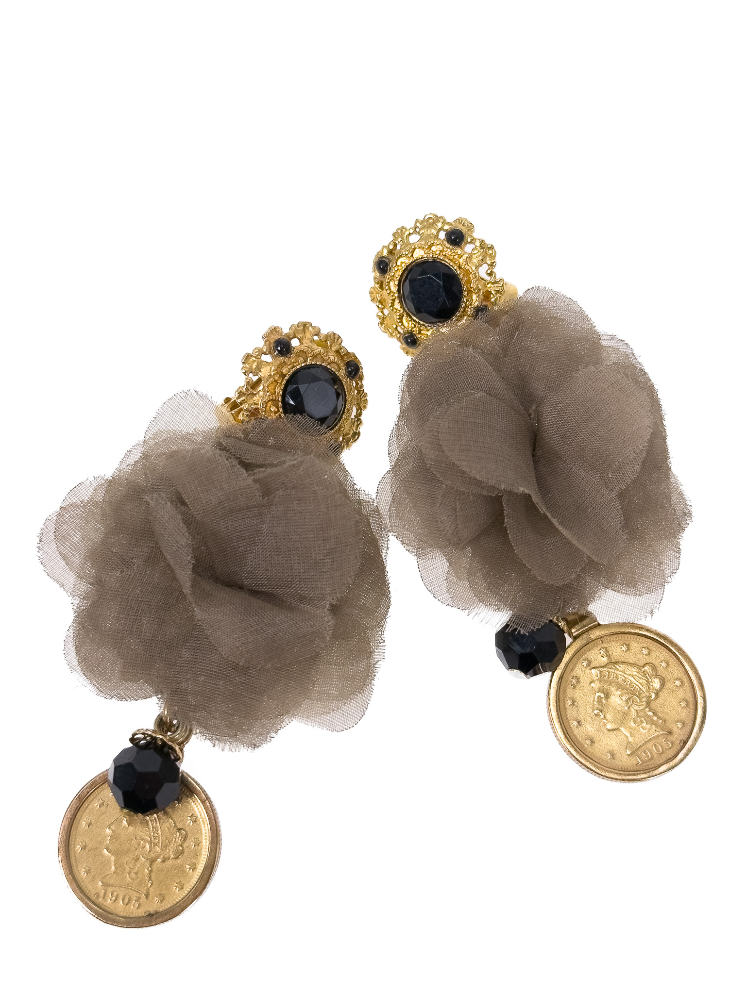 "Złote klipsy, długie, wiszące rozety z ozdobnym czarnym kamieniem na środku oraz czterema małymi po bokach. U dołu większa rozeta zdobiona szyfonem ułożonym na kształt róży. Klipsy zakończone są monetą wykonaną na wzór amerykańskich monet. Z tyłu u góry widnieje wybite logo marki."