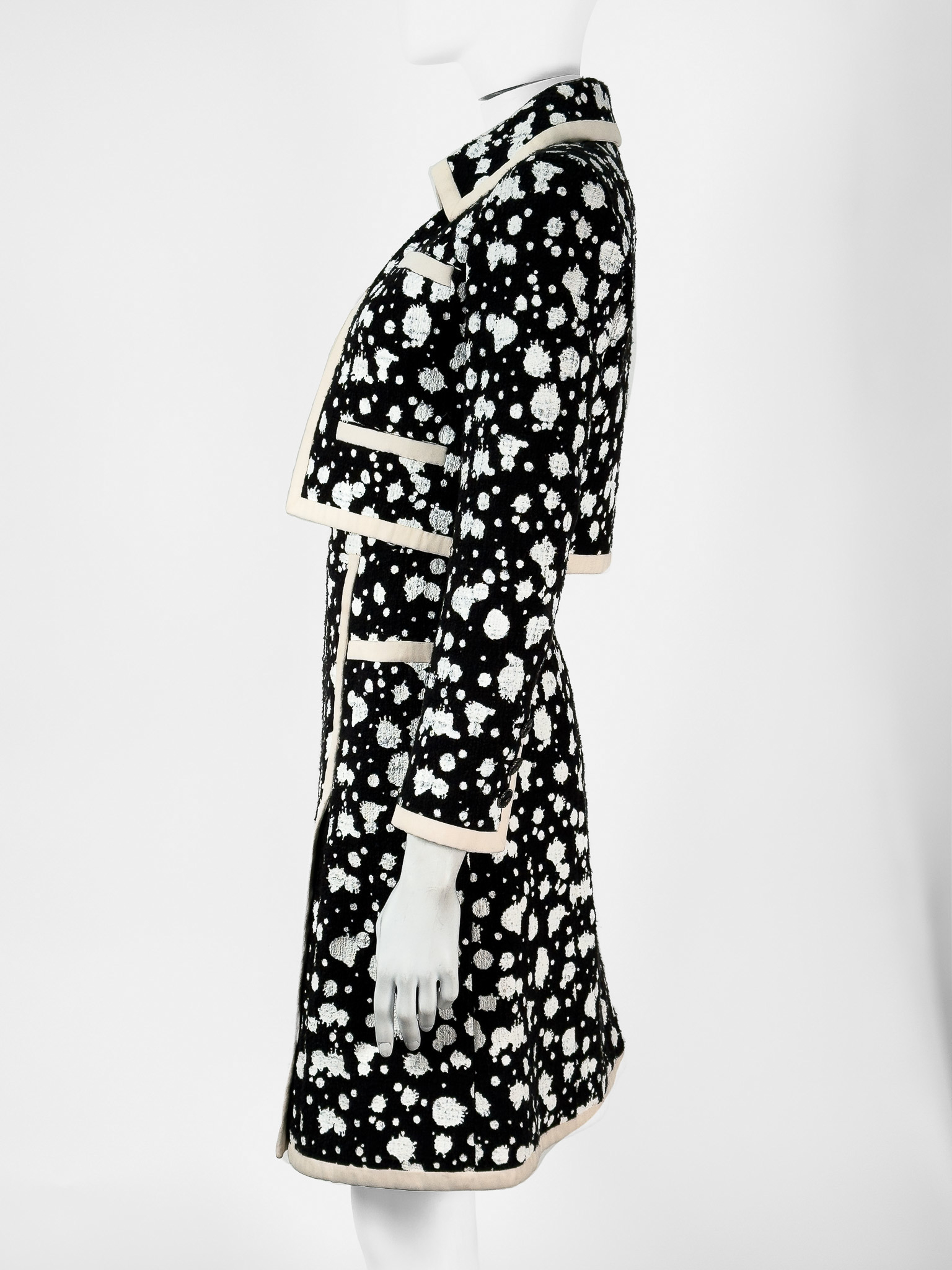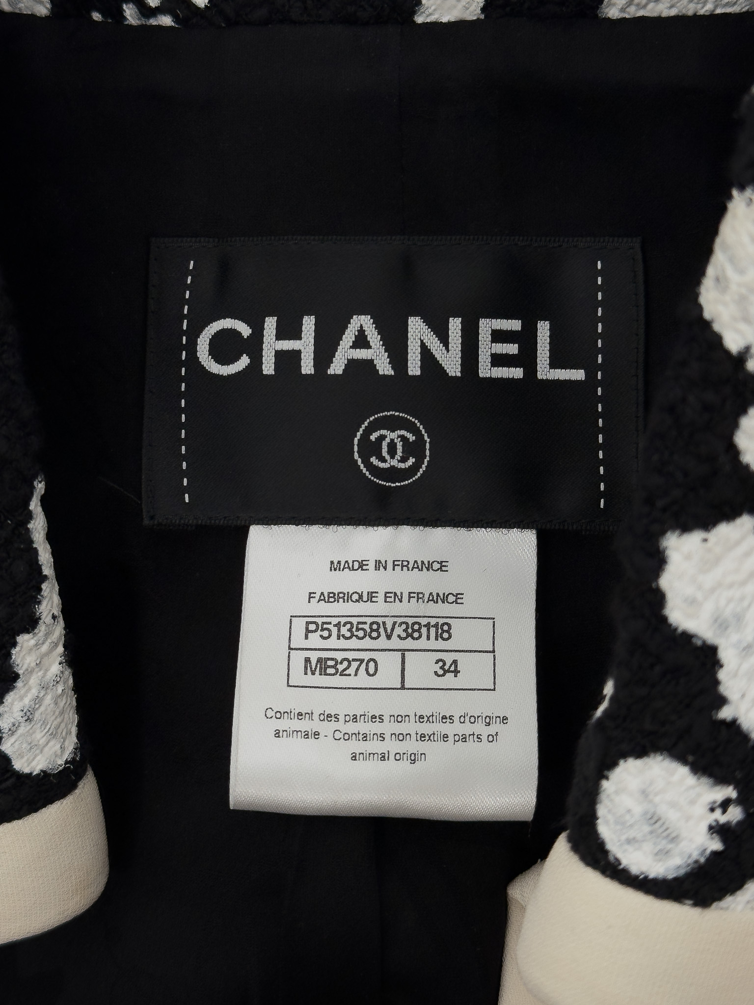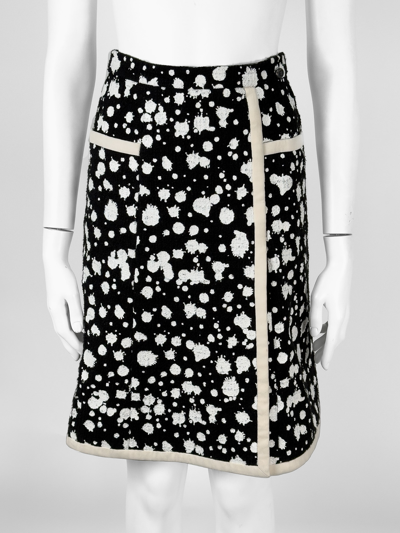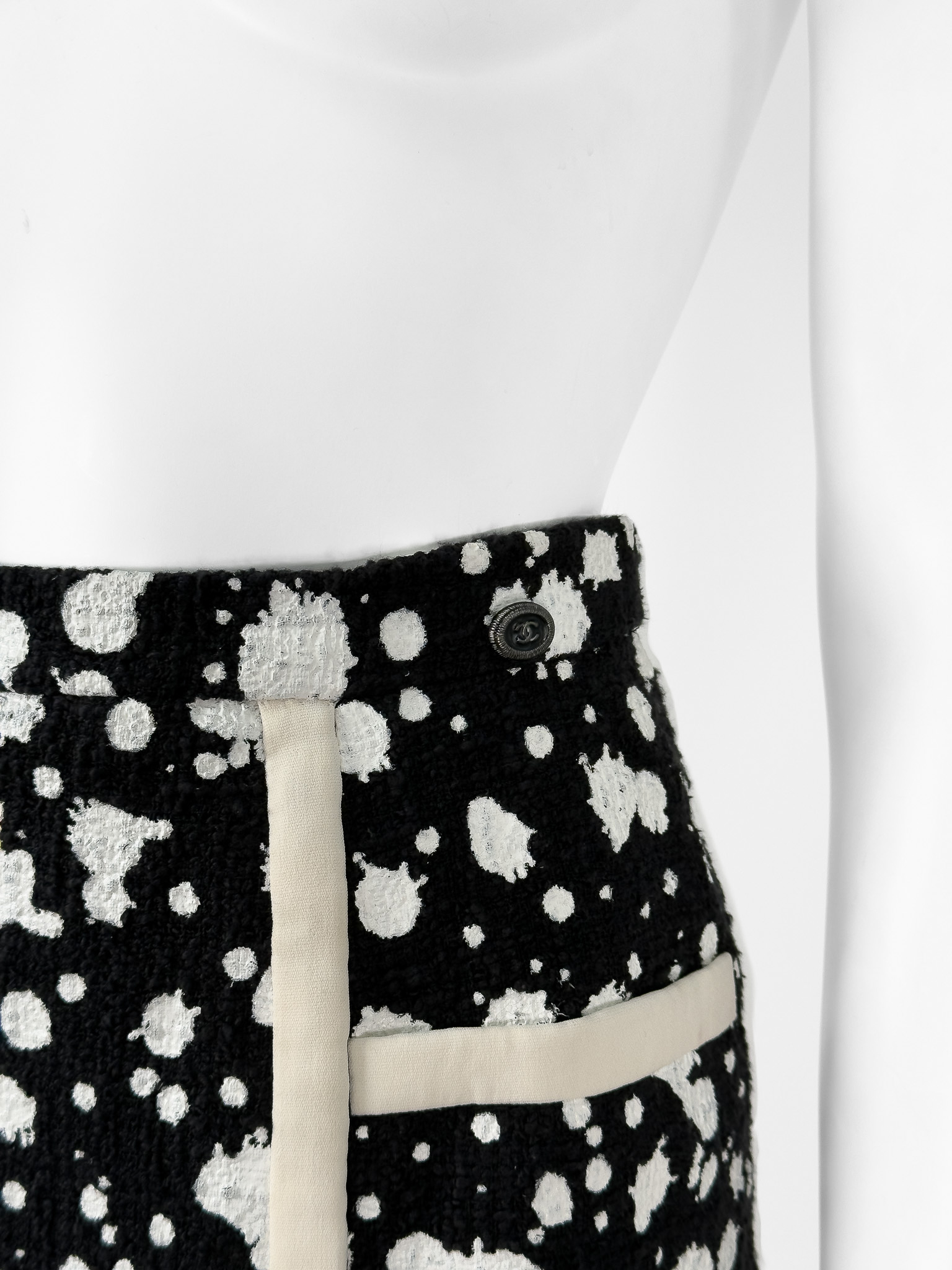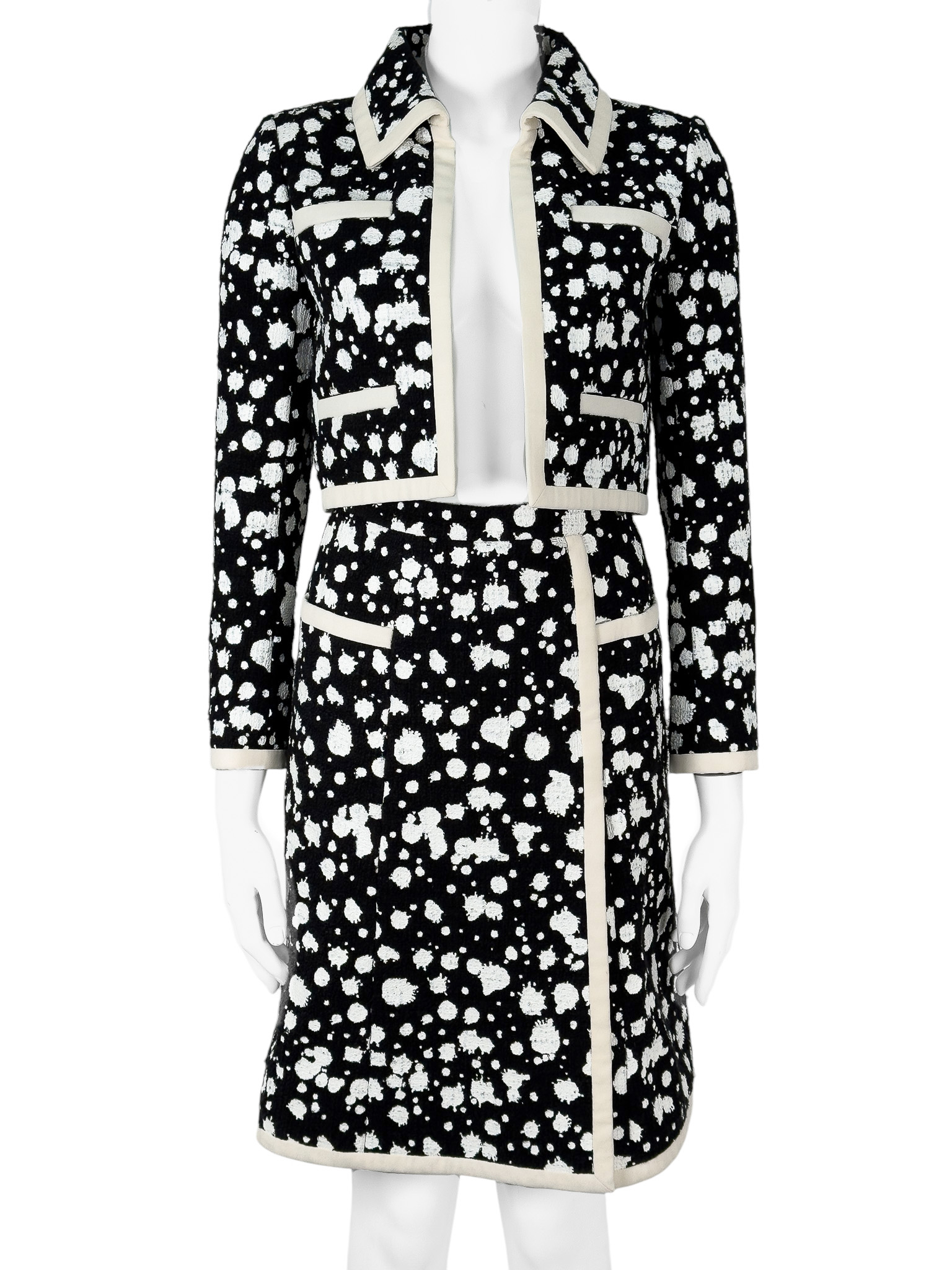 "Komplet: żakiet + spódnica. Czarny komplet we wzór białych plamek, wykończony kremową lamówką. Żakiet o krótszym kroju, niezapinany. Spódnica z wyższym stanem oraz rozporkiem na skos. Rozmiar z metki FR 34. Skład: 90% bawełna, 10% wiskoza, podszewka: 100% jedwab. Stan: bardzo dobry. Kolekcja SS2015. Wymiary żakietu: szerokość mierzona od pachy do pachy 44cm, długość całkowita 39cm; wymiary spódnicy: szerokość w pasie 32cm, długość całkowita 59cm."