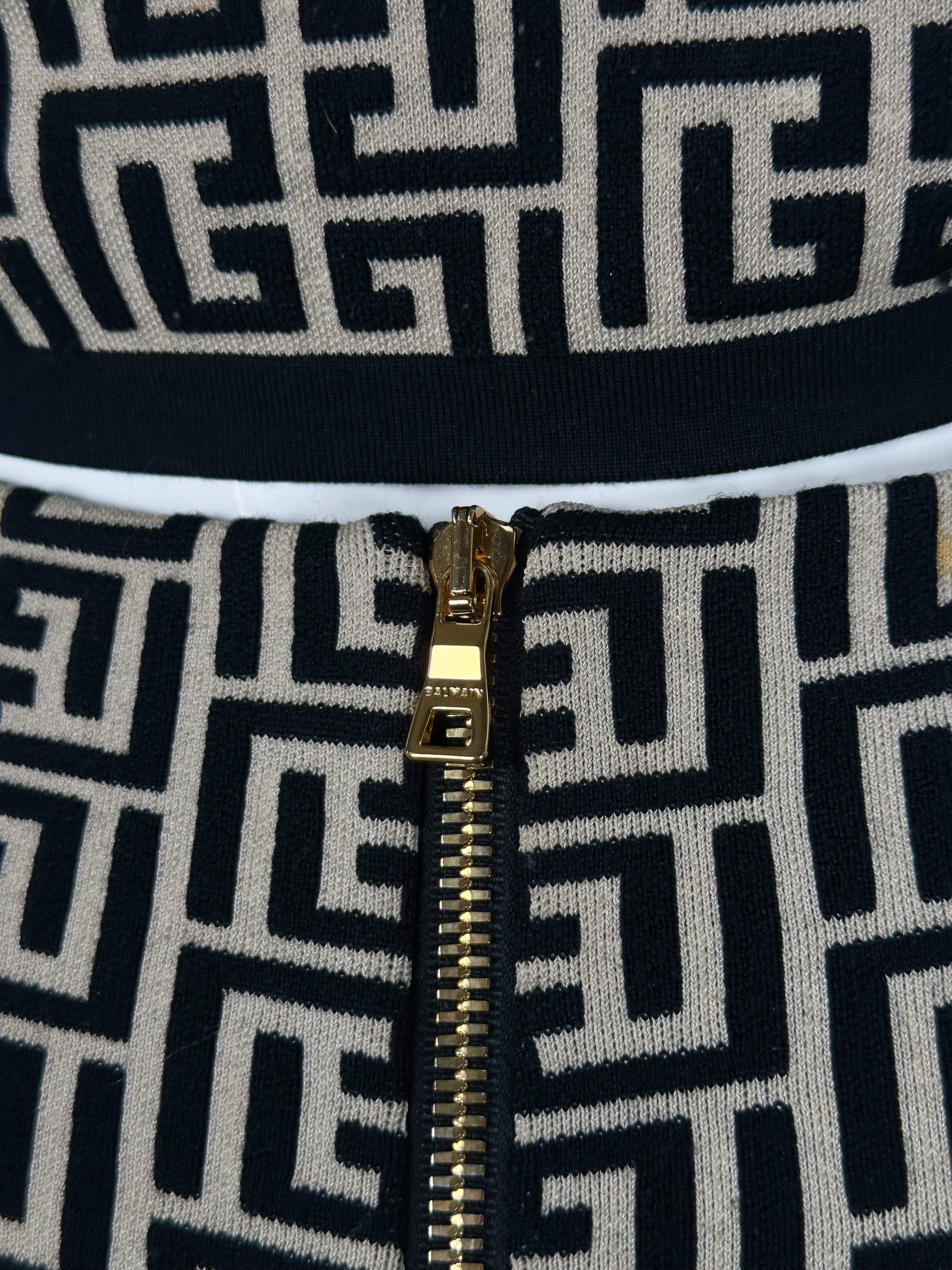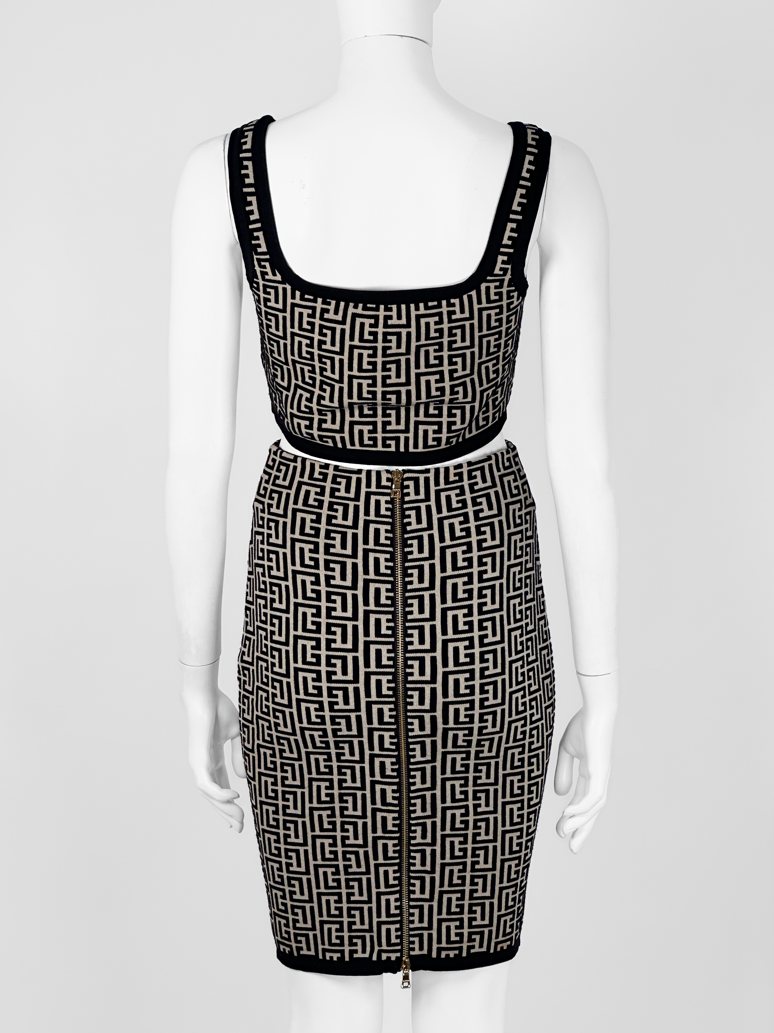 "Beżowo-czarny dopasowany komplet w monogram marki, top + spódnica; Krótki top na ramiączkach wykończony czarną lamówką, ołówkowa spódnica, długość przed kolano, zapinana w tylnej części na dwa złote logowane suwaki. Stan bardzo dobry. Rozmiar topu IT 36, rozmiar spódnicy IT 34. Skład topu: 56% wełna dziewicza, 22% wiskoza, 21% poliamid, 1% elastan; skład spódnicy: 55% wełna dziewicza, 24% wiskoza, 19% poliamid, 2% elastan. Wymiary topu: szerokość mierzona od pachy do pachy 41cm, długość całkowita 37cm; wymiary spódnicy: szerokość w pasie 30cm, długość całkowita 55cm."