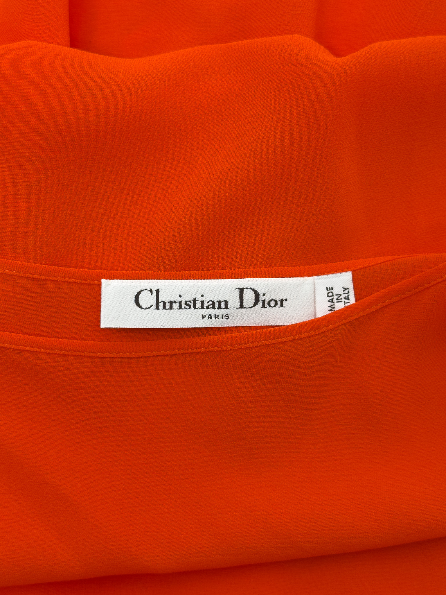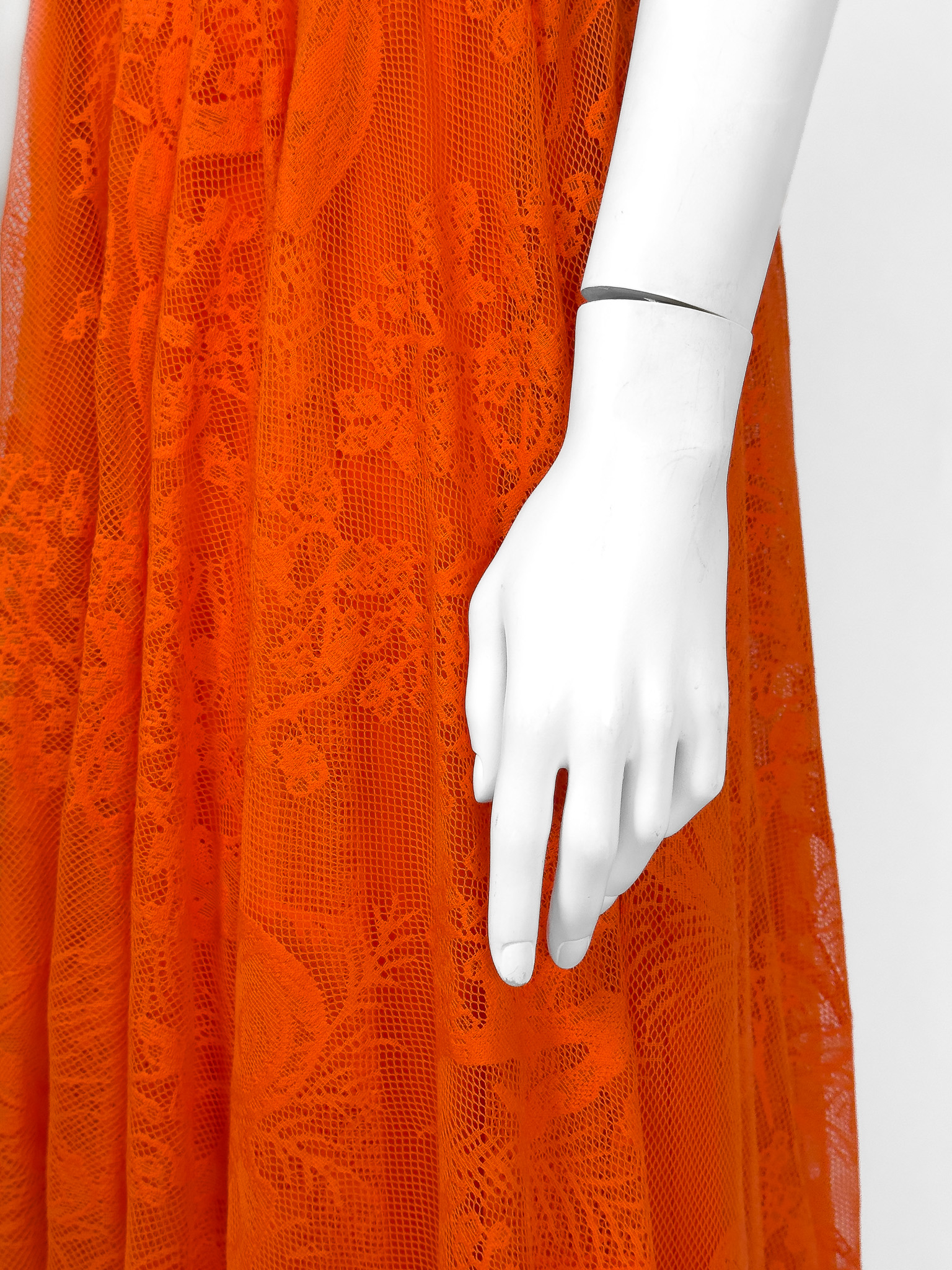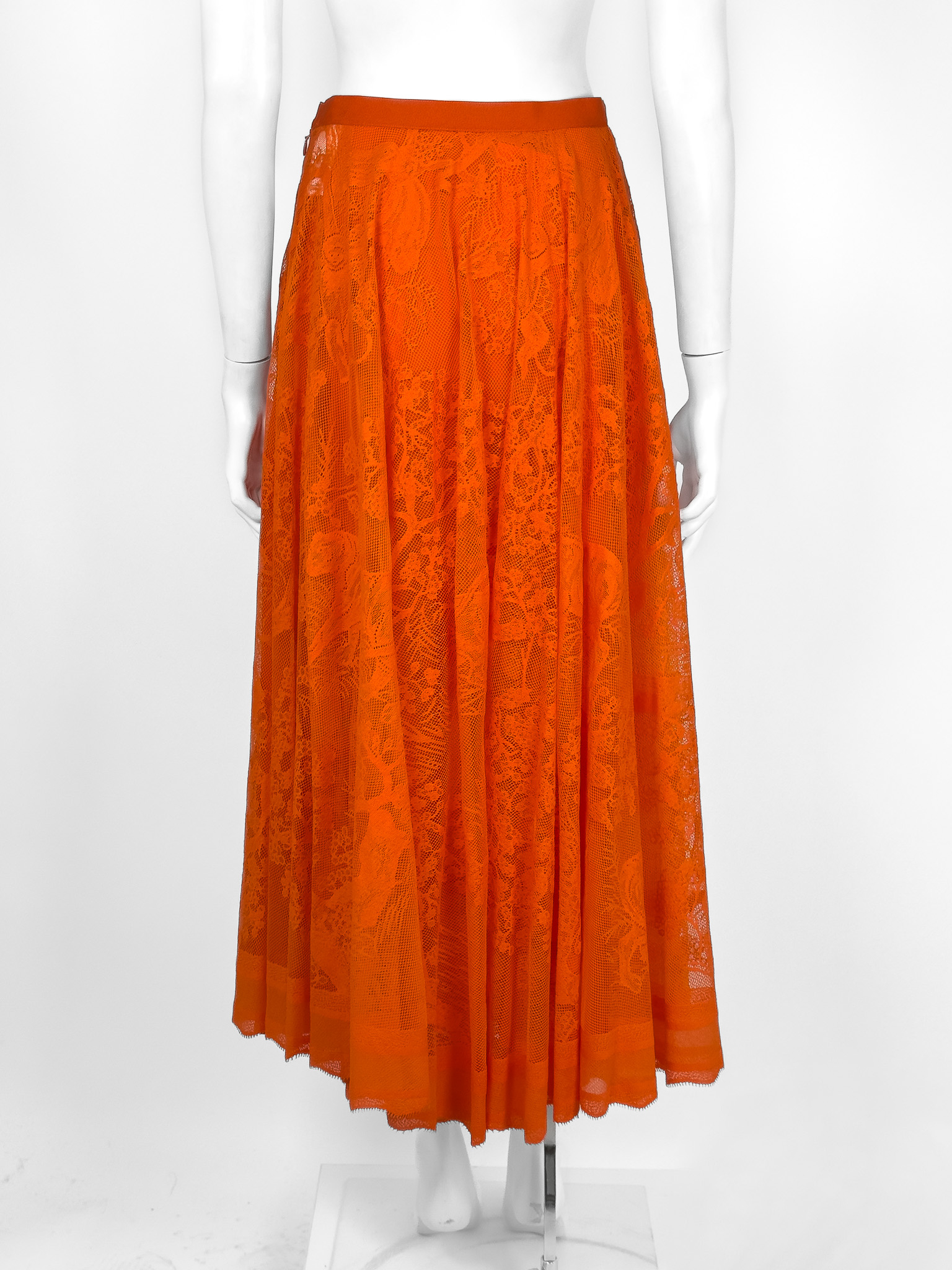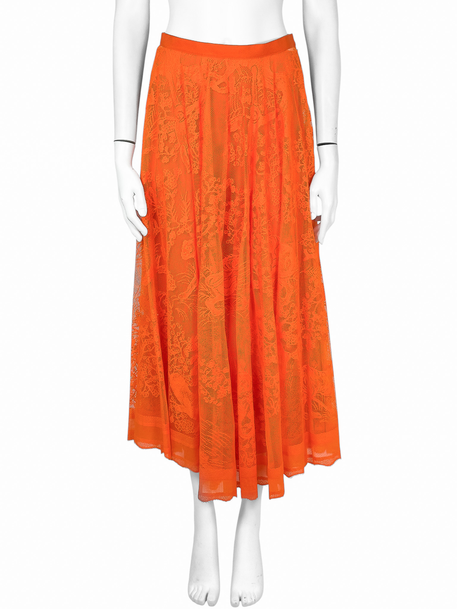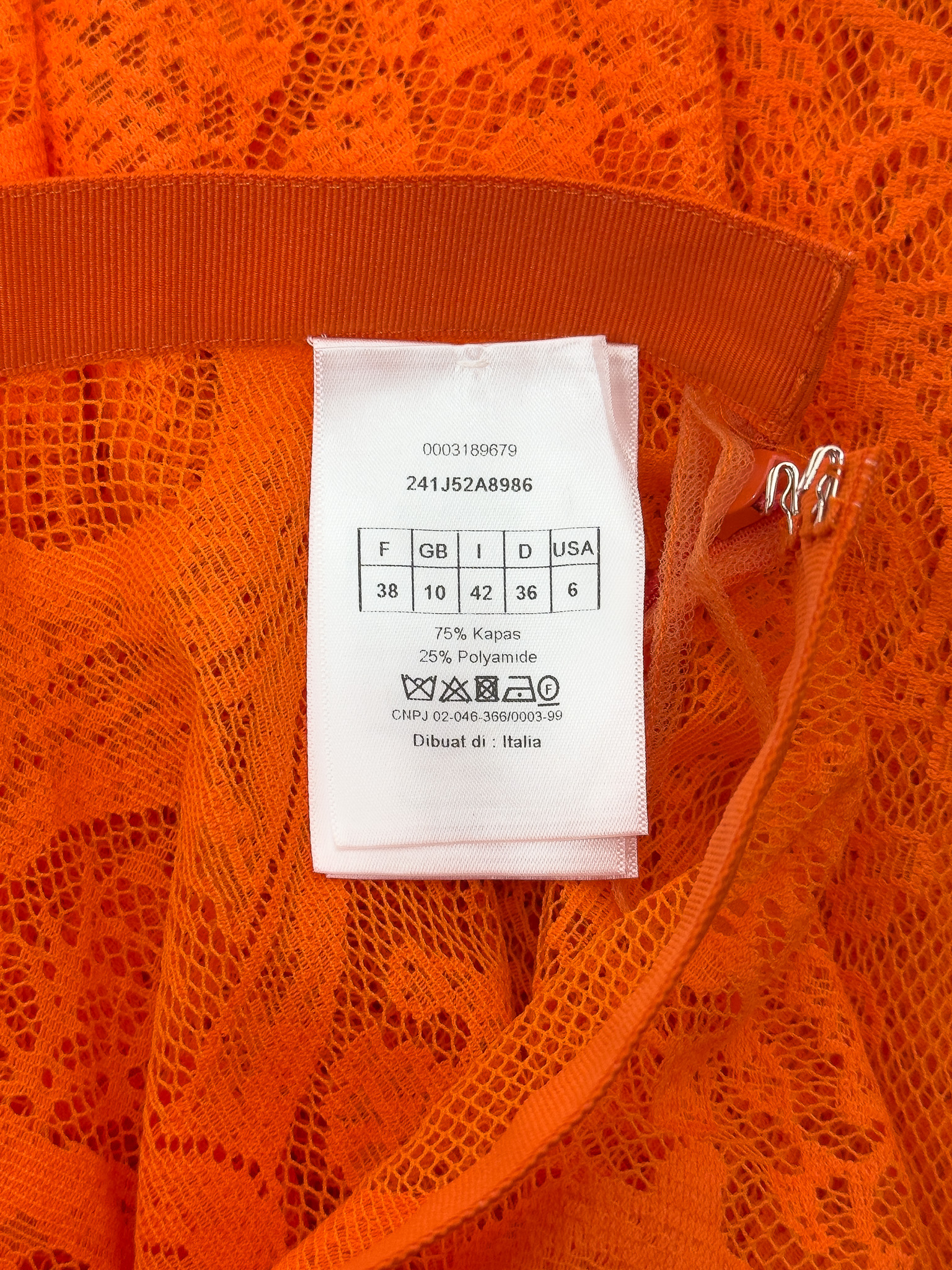 "Kolekcja: Dioriviera capsule 2022. Pomarańczowa, koronkowa spódnica, długość za kolano, posiada halkę. Rozmiar z metki: IT42. Skład: 75% bawełna, 25% poliamid. Stan: bardzo dobry. Wymiary: szerokość w pasie 35cm, długość całkowita 90m."