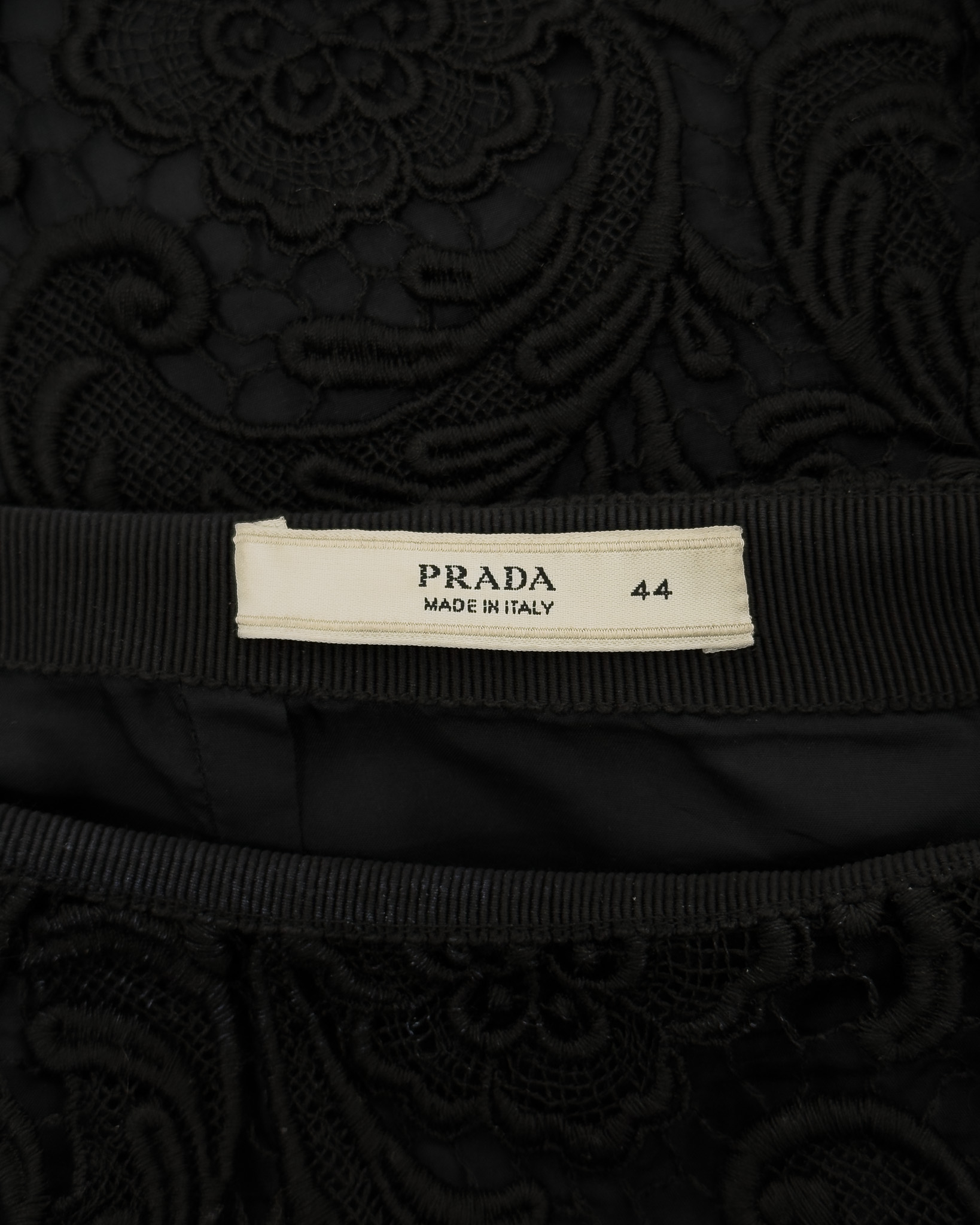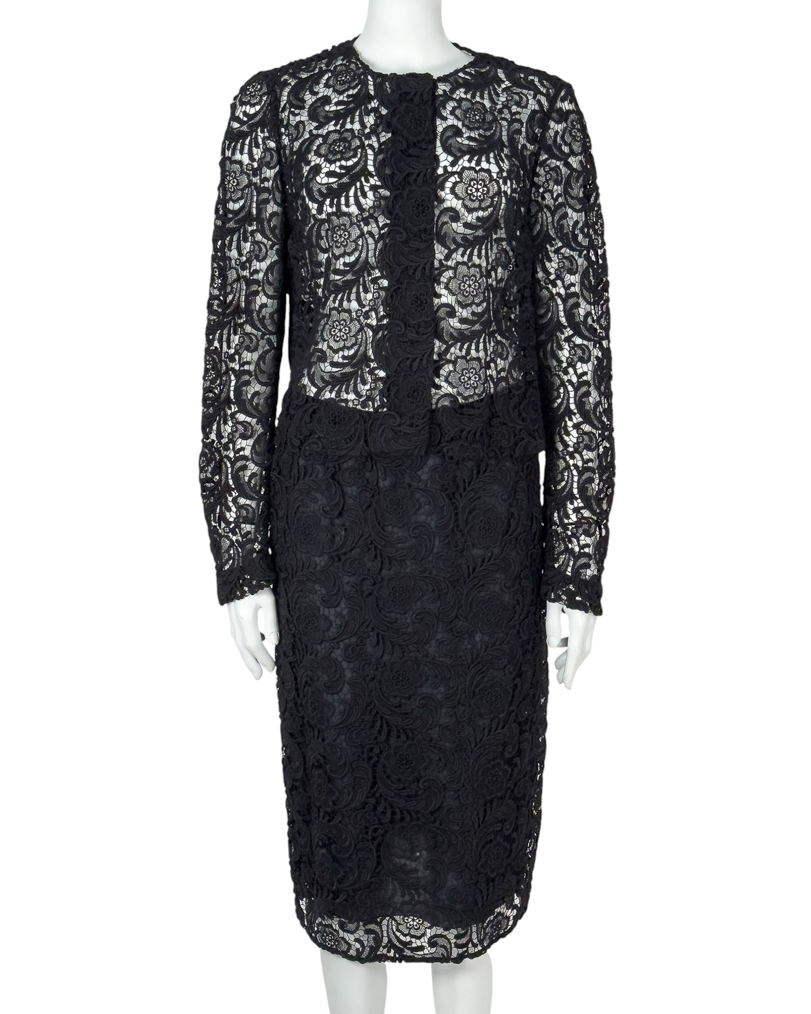 "Czarny, koronkowy komplet: spódnica i bolerko. Bolerko zapinany na kryte zatrzaski. Spódnica długość za kolano. Rozmiar z metki IT 44. Skład: 90% bawełna. 10% poliester. Stan bardzo dobry. Wymiary bolerka: szerokość mierzona od pachy do pachy 53cm, długość całkowita 55cm; wymiary spódnicy: szerokość w pasie 38cm,  długość całkowita 79cm."