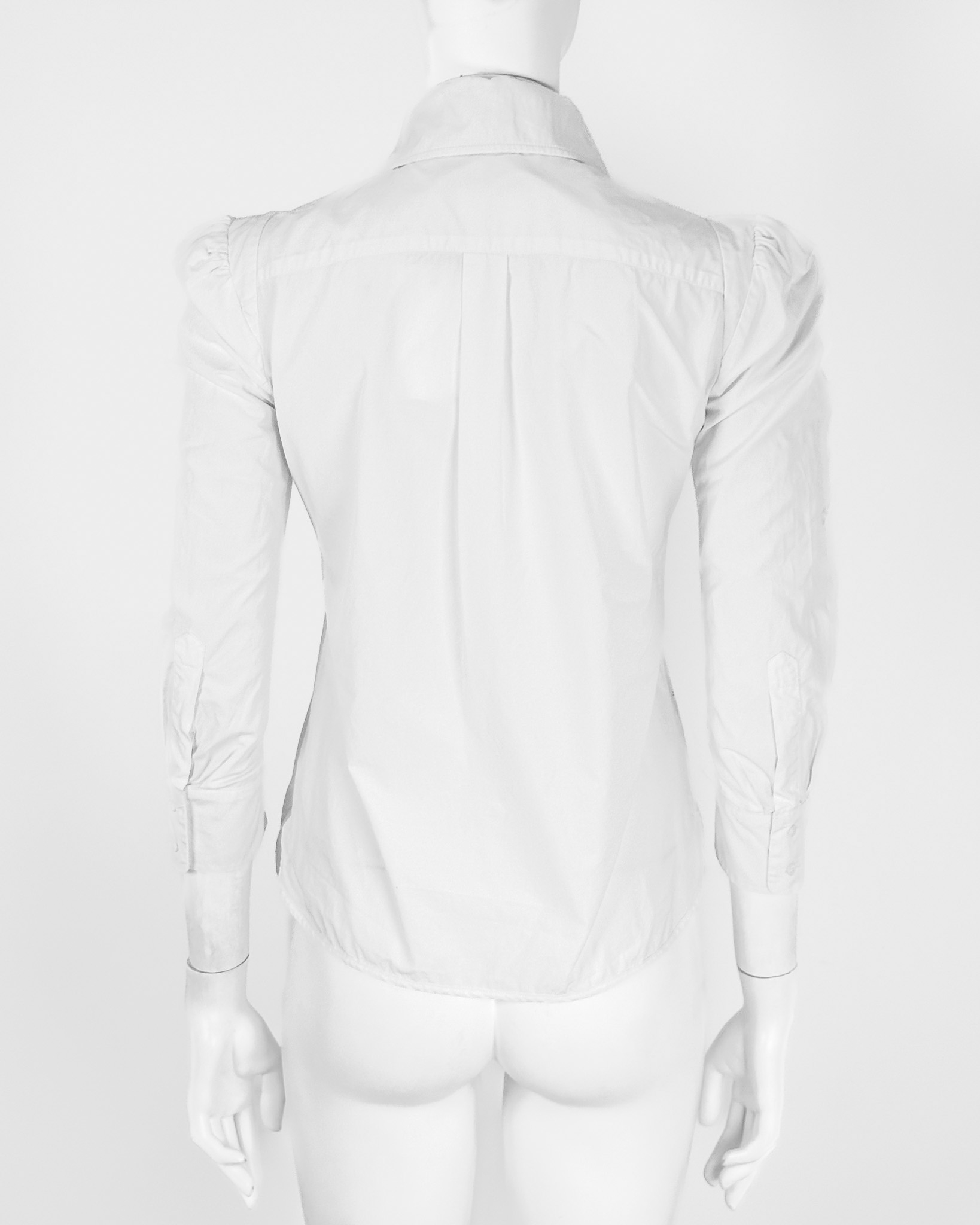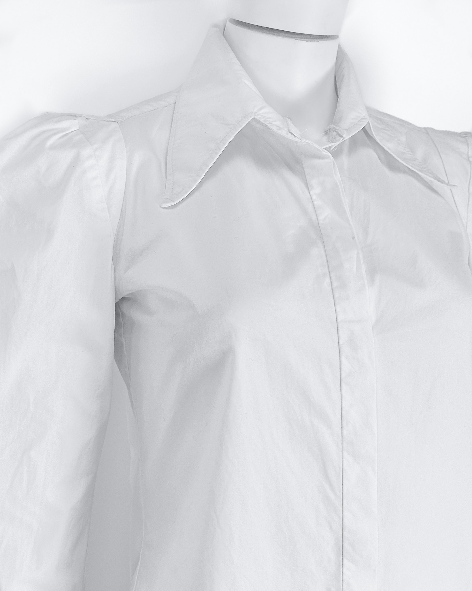 "Biała koszula zapinana na kryte guziki, duży szpiczasty kołnierzyk, bufiaste rękawy, dopasowany krój, taliowana, rozpinane mankiety, delikatne rozcięcia po bokach, zaokrąglony dół. Brak metki ze składem i rozmiarem. Rozmiarowo wypada jak XS/S."