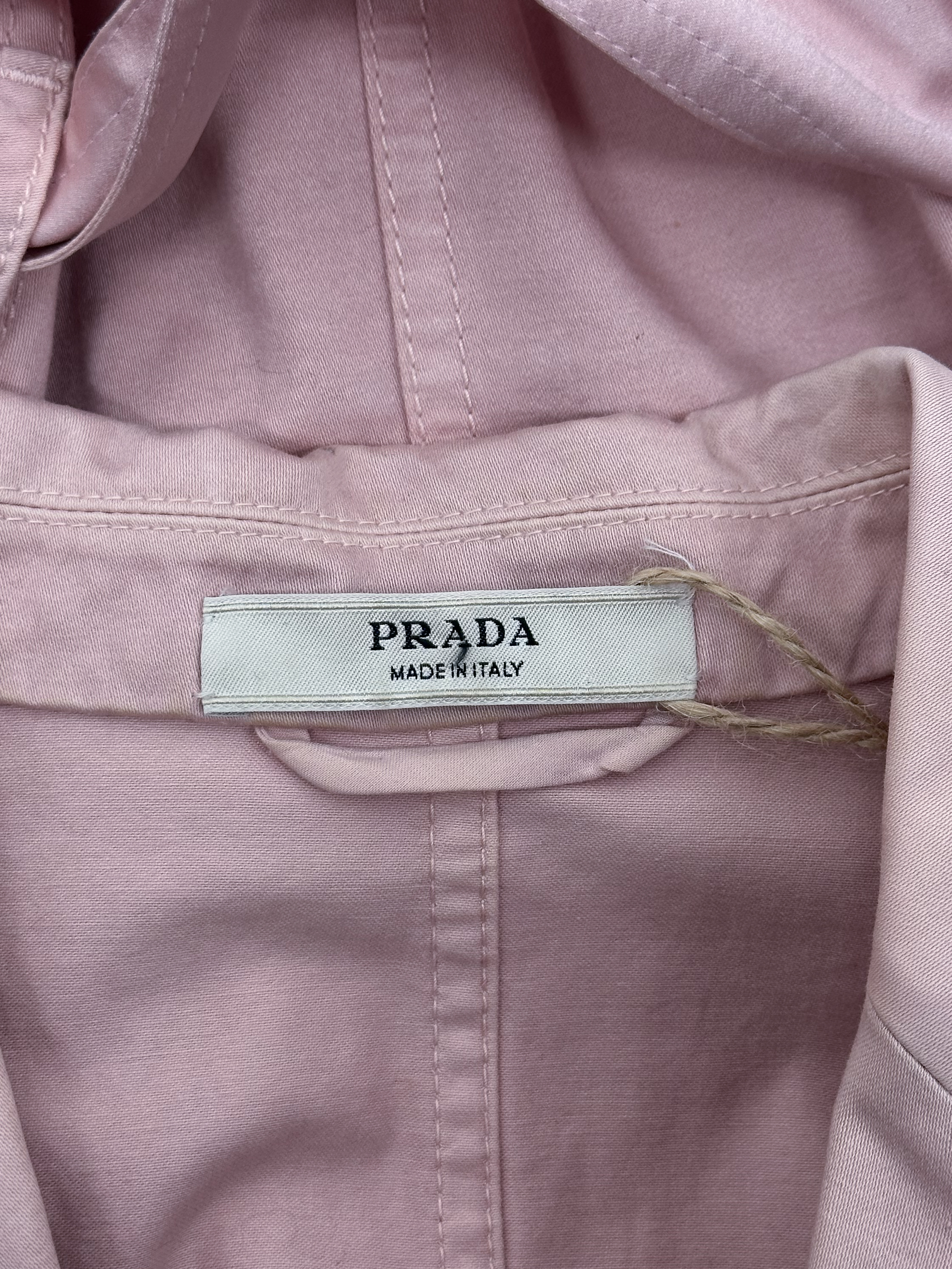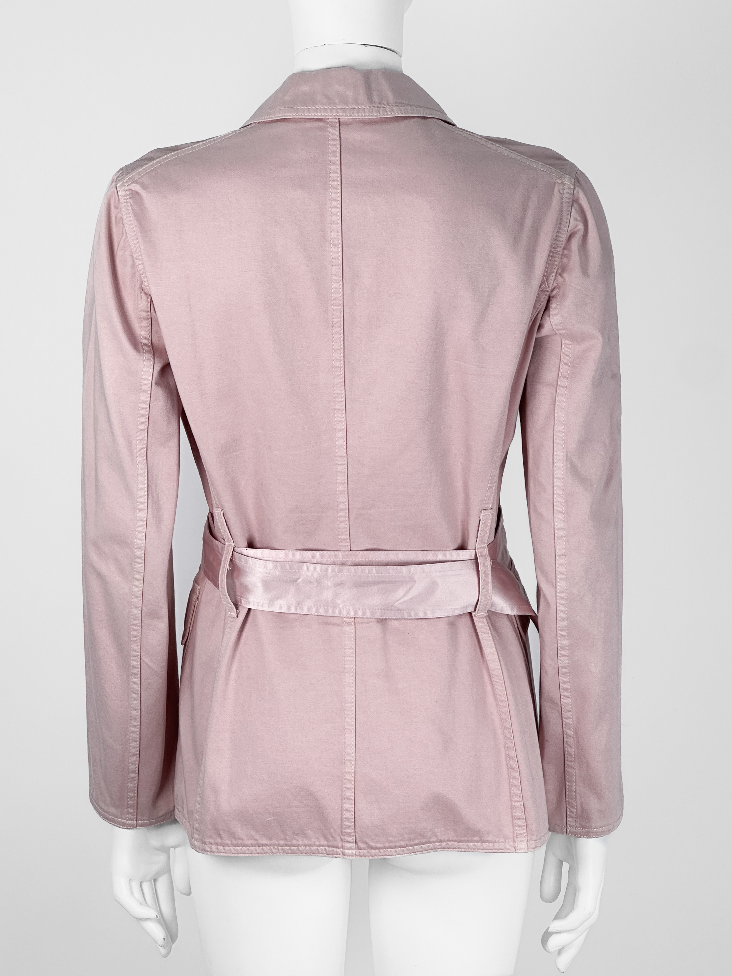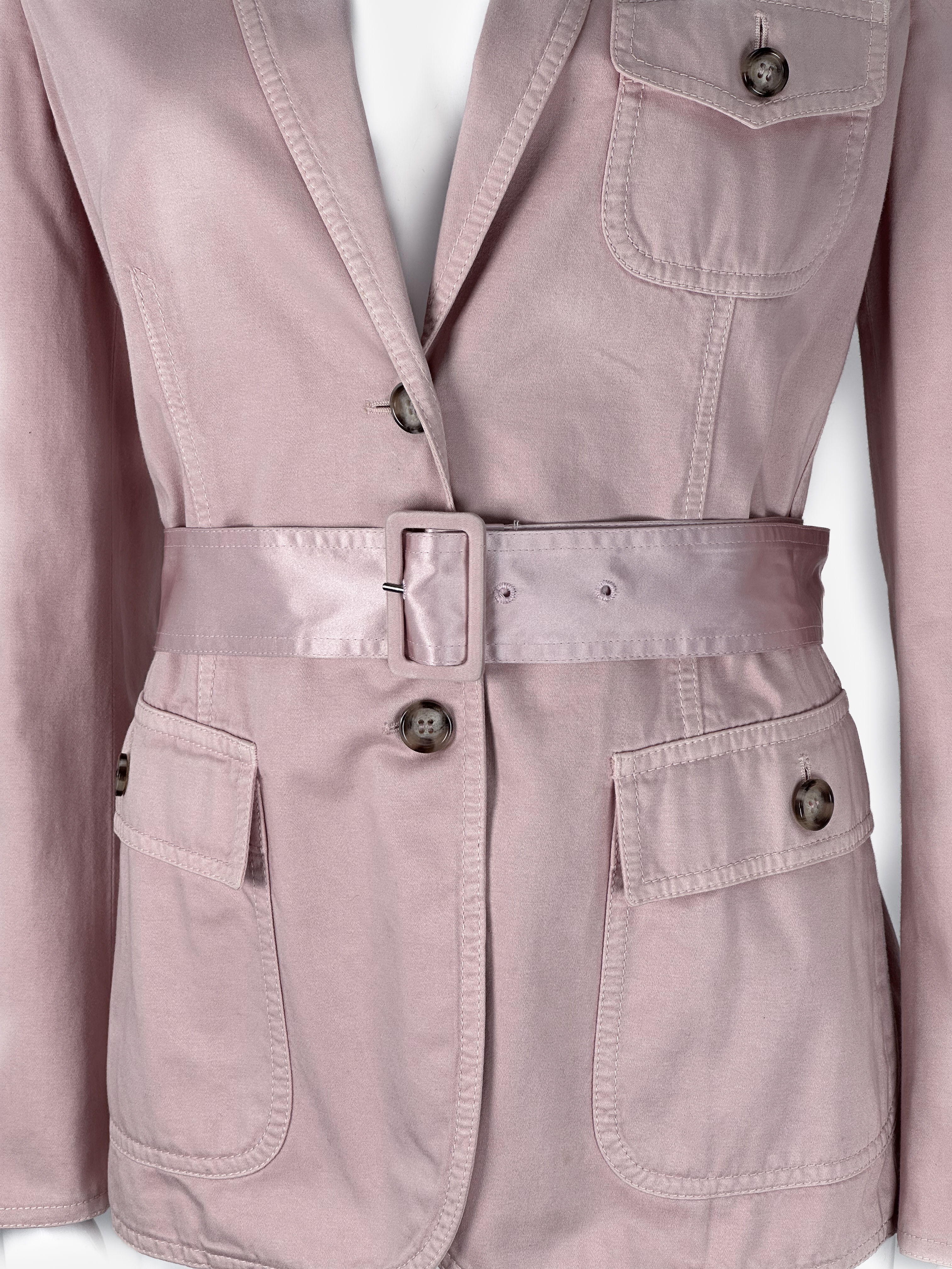"Kurtka/marynarka w kolorze różowym, pasek w talii, dekolt w szpic, trzy kieszenie na przodzie, zapinana na szylkretowe guziki. Stan bardzo dobry. Rozmiar z metki IT 44. Skład: 100% bawełna. Wymiary: szerokość mierzona od pachy do pachy 50cm, długość całkowita 69cm."