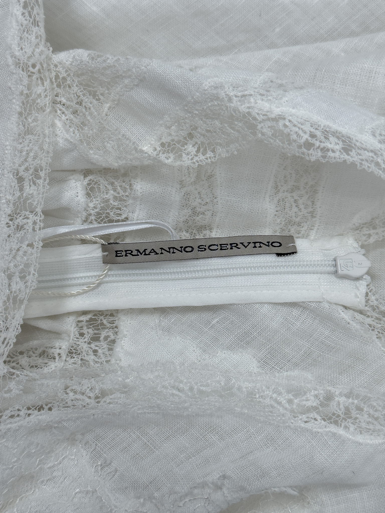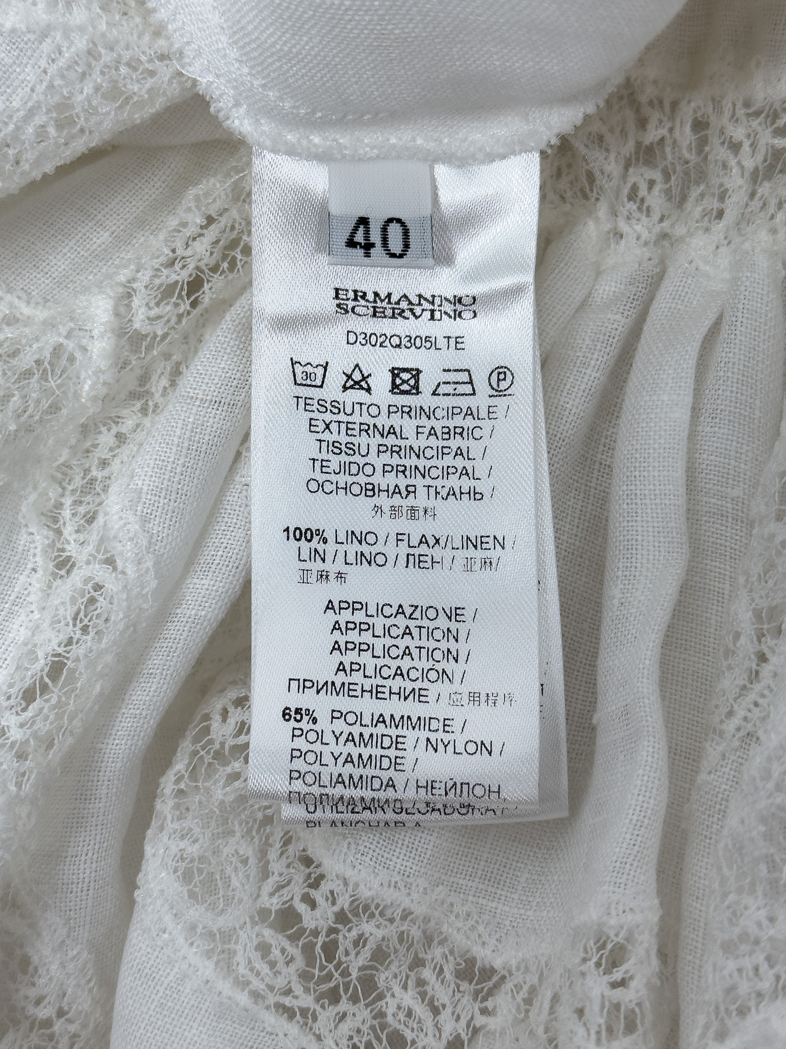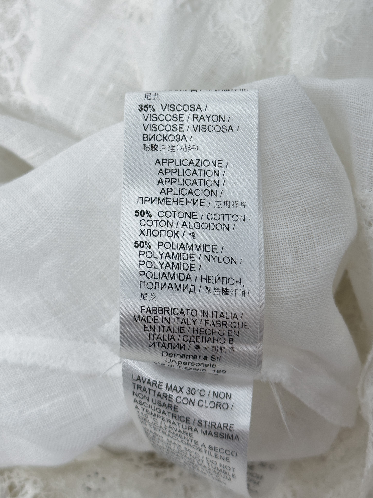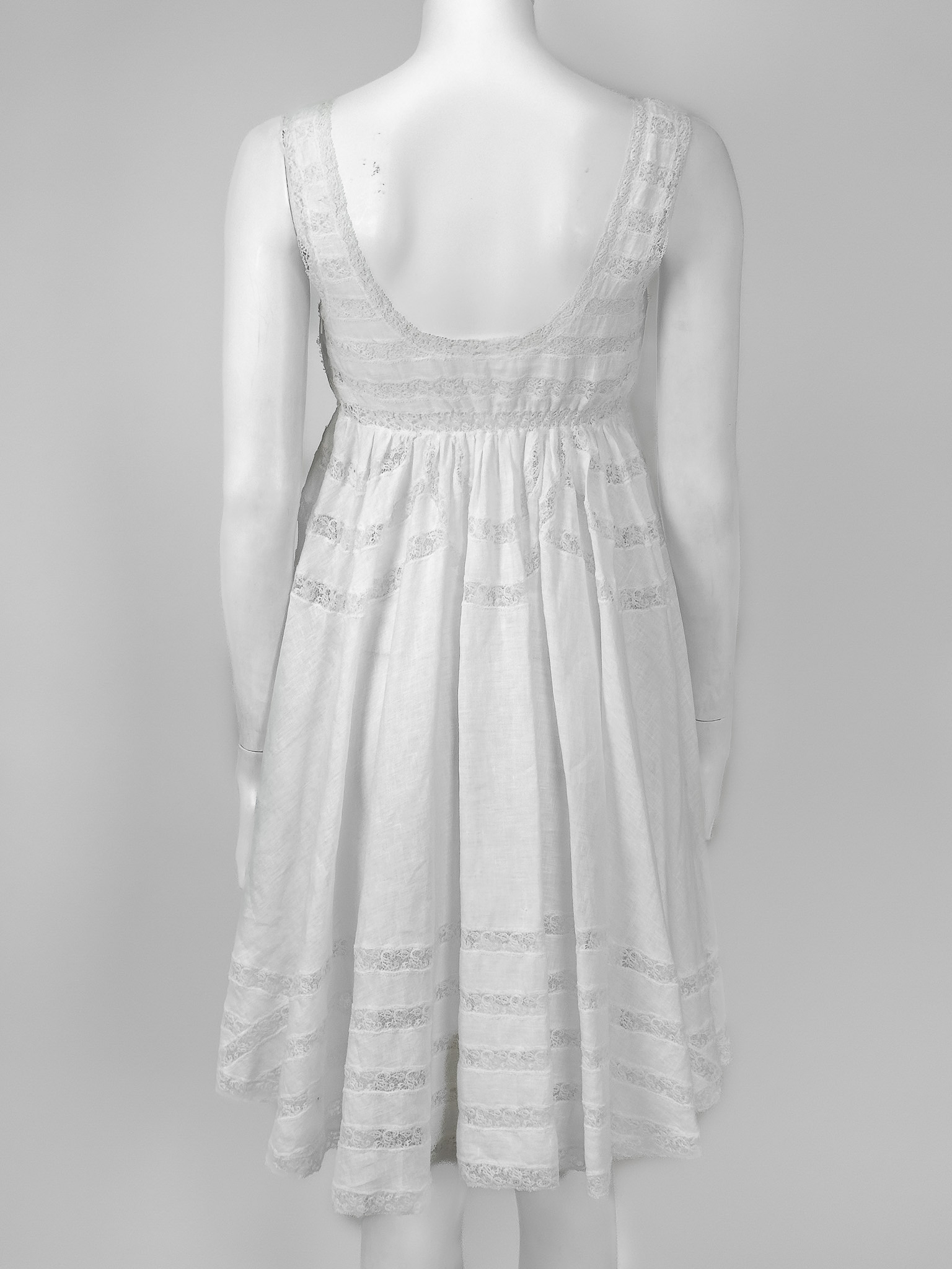 "Biała, lniana sukienka, koronkowe wstawki, zapinana z boku na zamek. Stan bardzo dobry. Rozmiar z metki IT 40. Skład: 100% len. Wymiary: szerokość mierzona od pachy do pachy 44cm, długość całkowita 88cm."