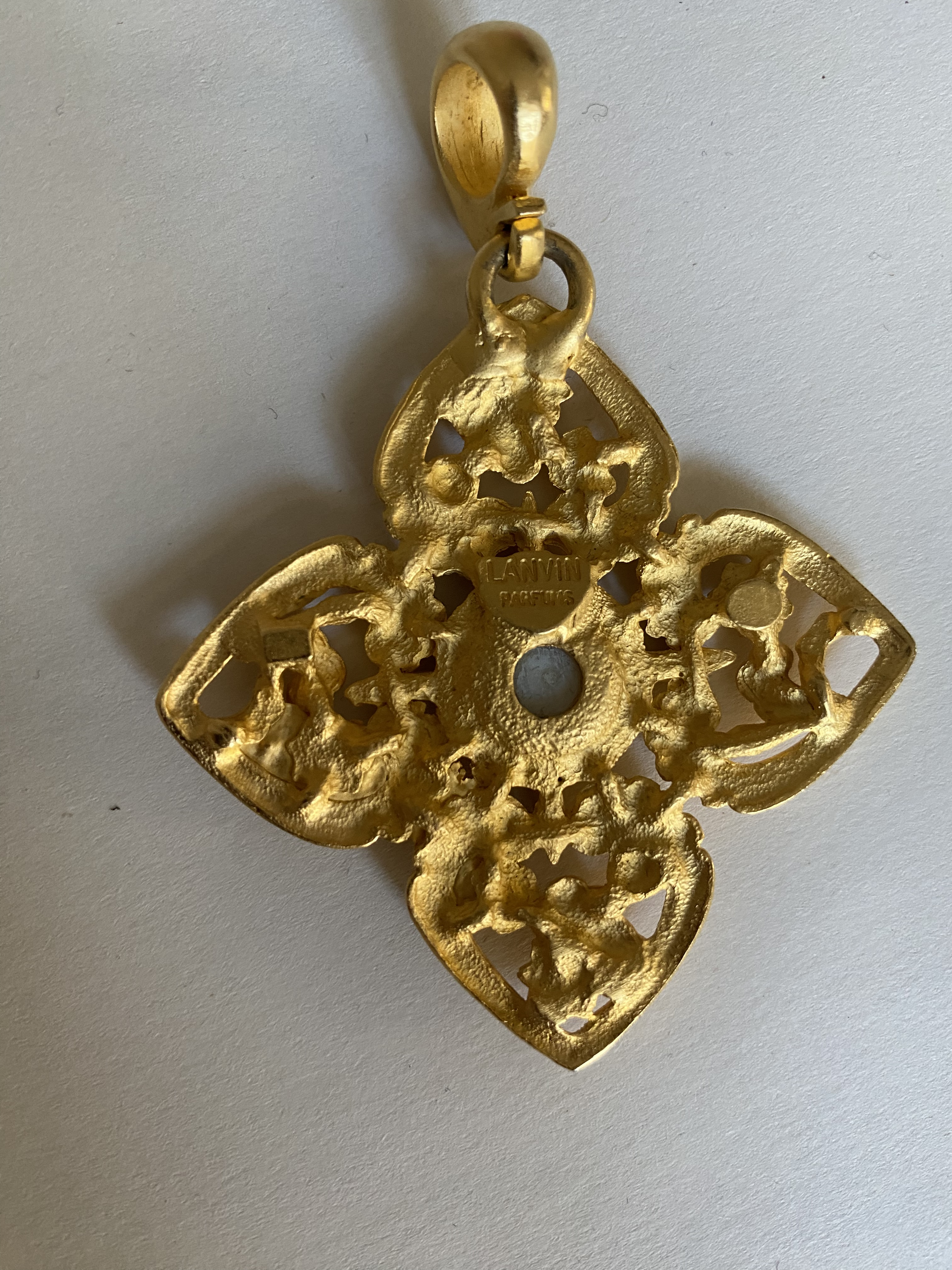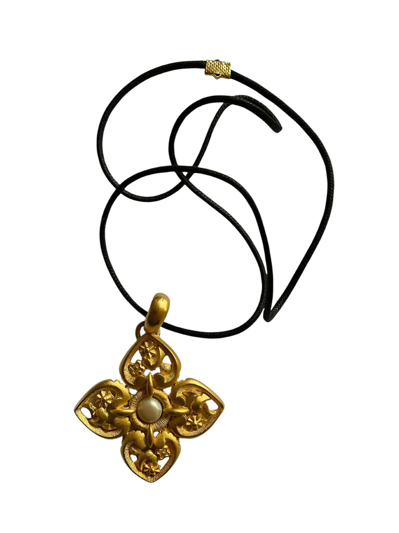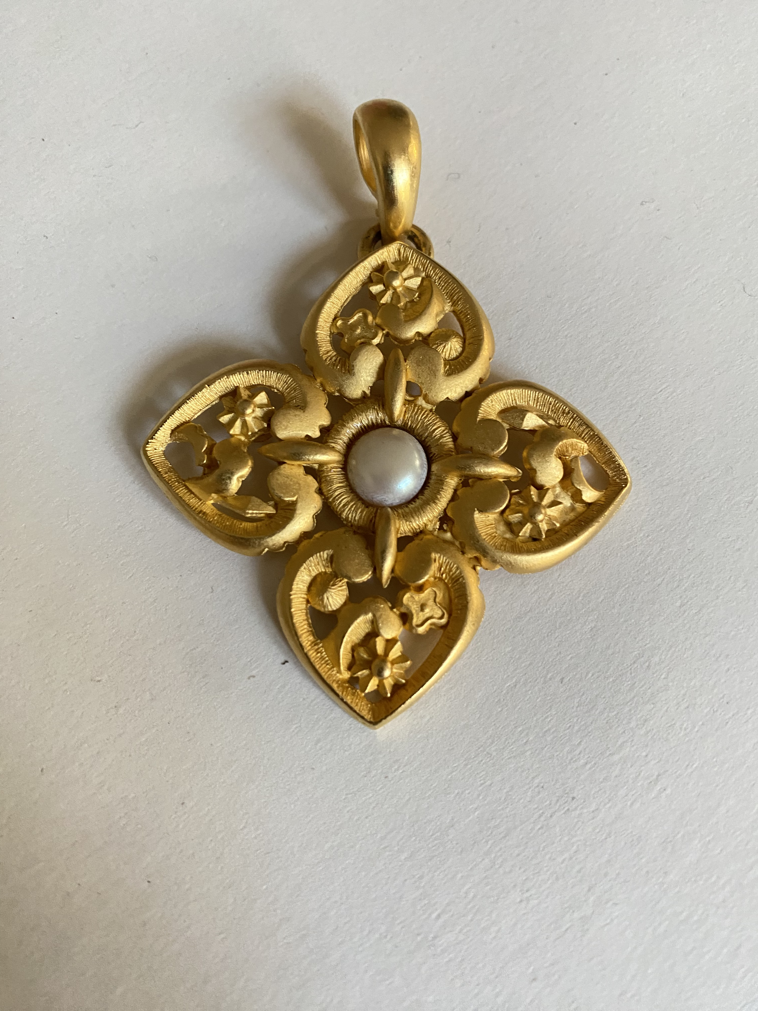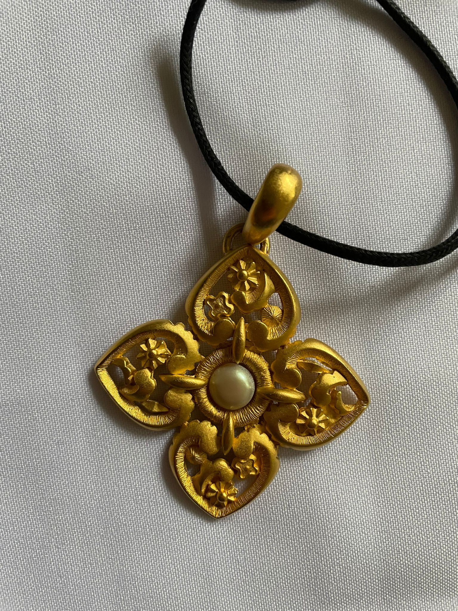 "Naszyjnik ozdobiony zawieszką w kształcie kwiatu z perłą w centralnej części. Wymiary: średnica zawieszki 6cm."
