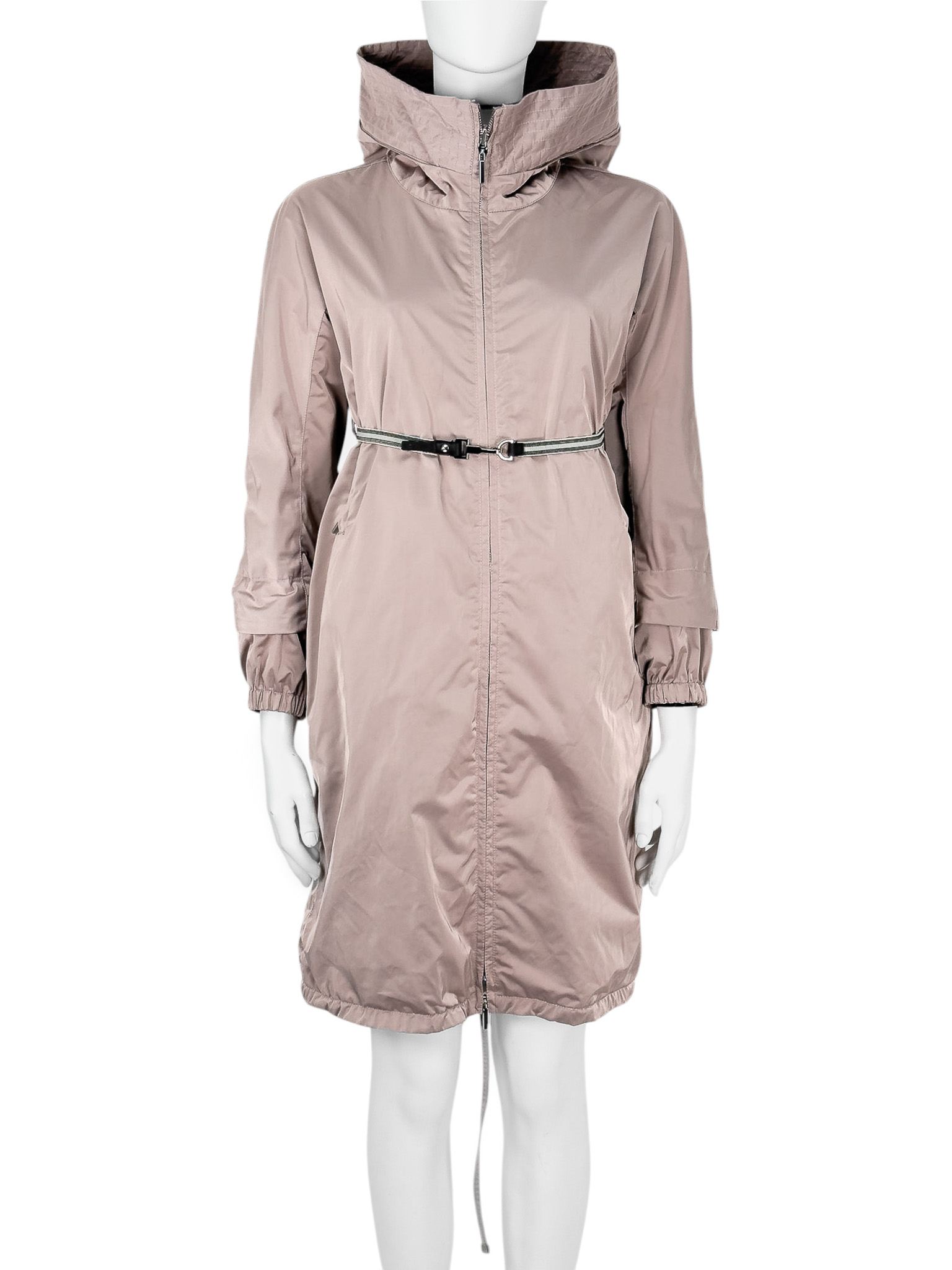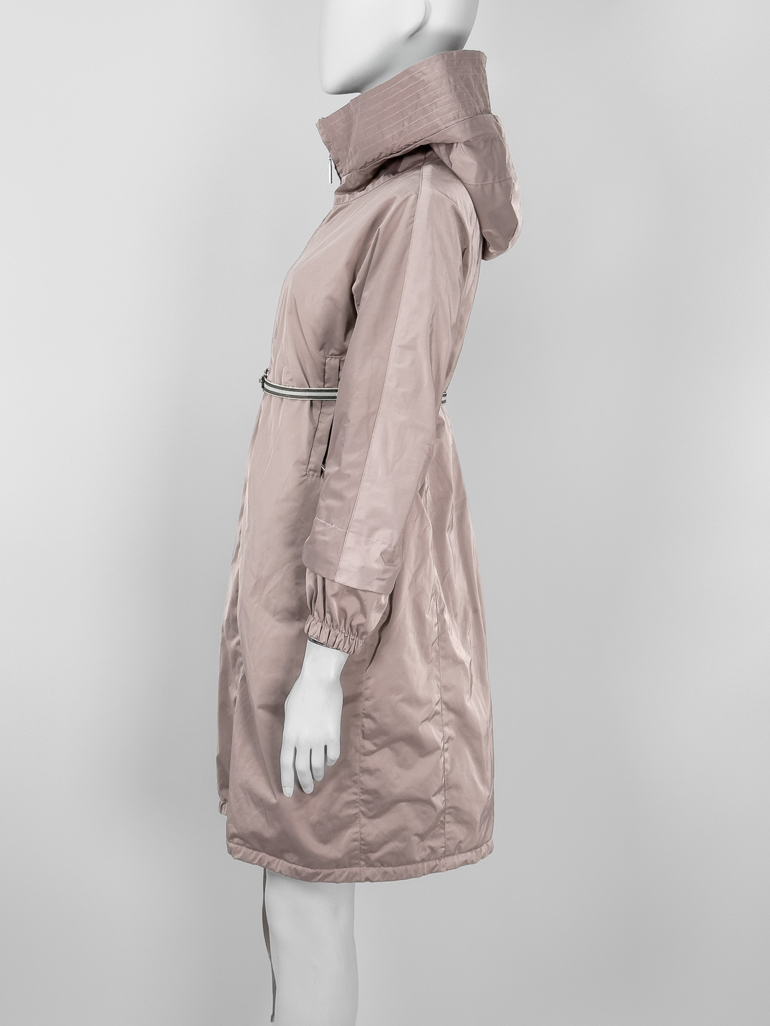 "Pudrowo-różowa ortalionowa kurtka za kolano, kaptur, zapinana na srebrne dwa suwaki, dwie kryte kieszenie po bokach, regulowana w talii, gumowy pasek w tylnej części, odpinane wstawki przy mankietach, wykończone ściągaczem. Rozmiar z metki IT 42. Skład: 100% poliester. Wymiary: szerokość mierzona od pachy do pachy 51cm, długość całkowita 93cm."