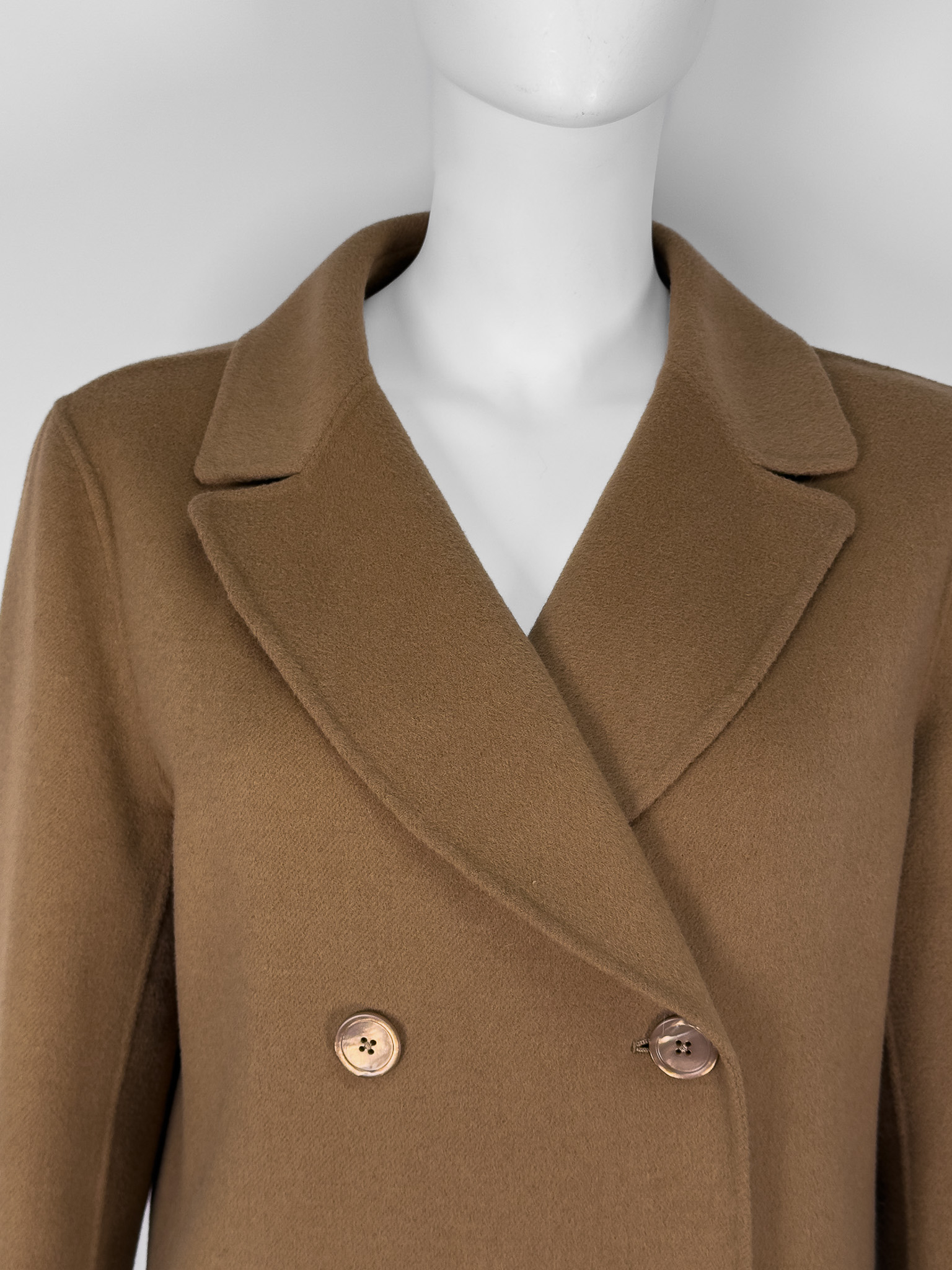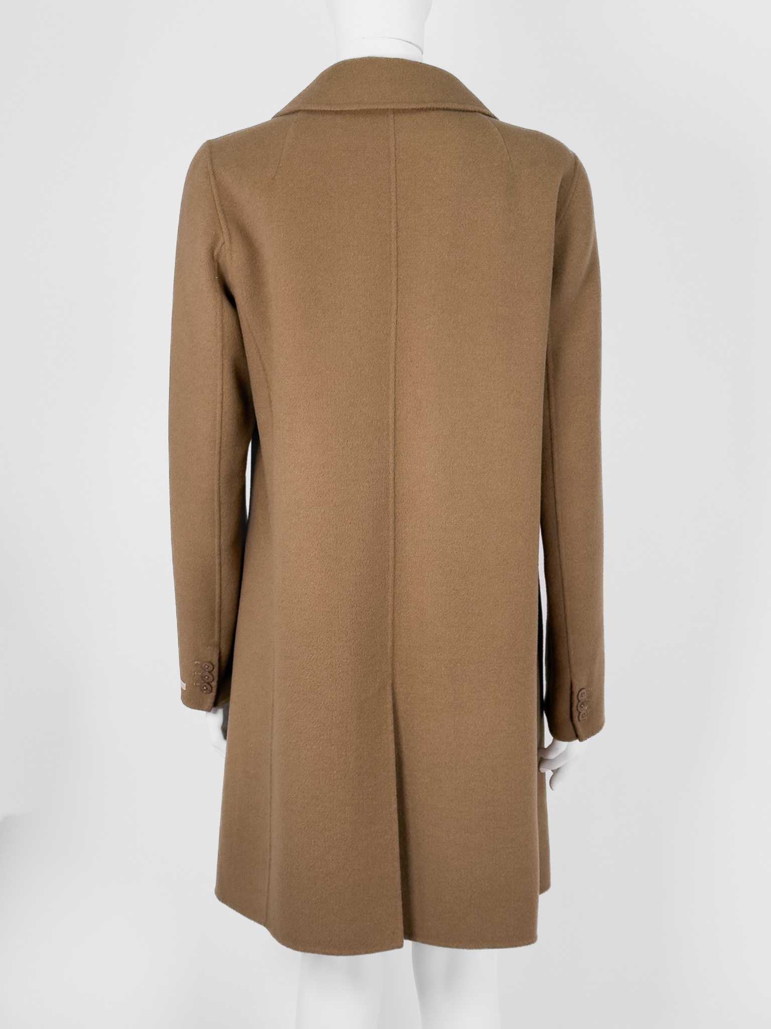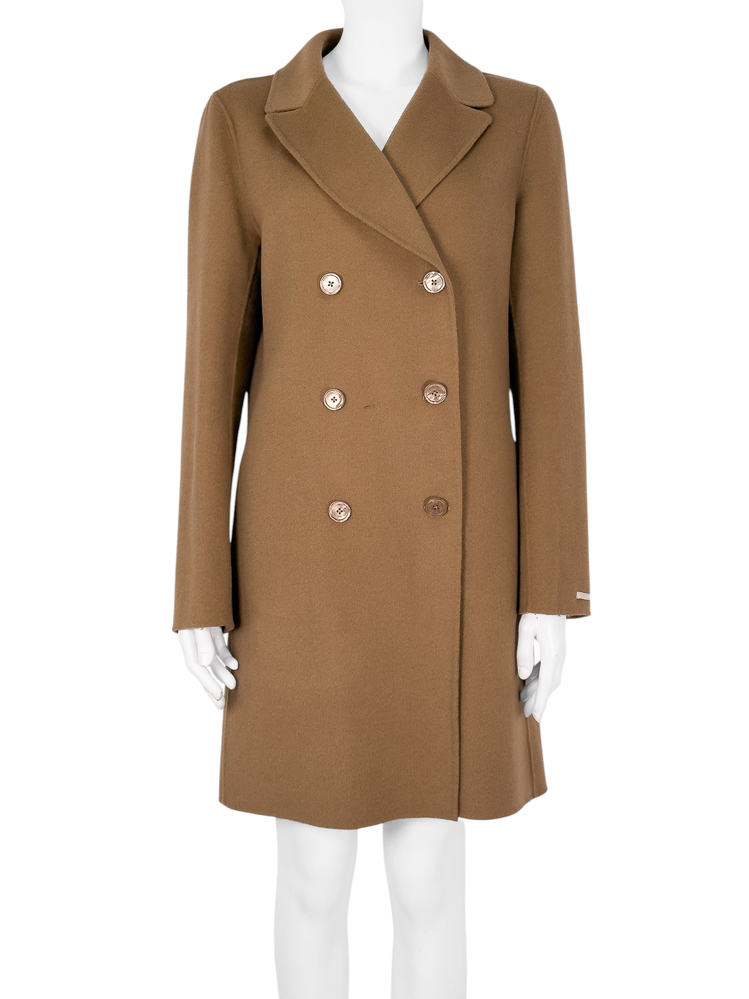 "Camelowy płaszcz bez podszewki, dwurzędowy, prosty krój, mankiety ozdobione guzikami, długość za kolano, rozporek w tylnej części. Stan bardzo dobry, posiada delikatną plamę na w okolicy guzików. Wycięte metki ze składem i rozmiarem. Wymiary: szerokość mierzona od pachy do pachy 54cm, długość całkowita 93cm."