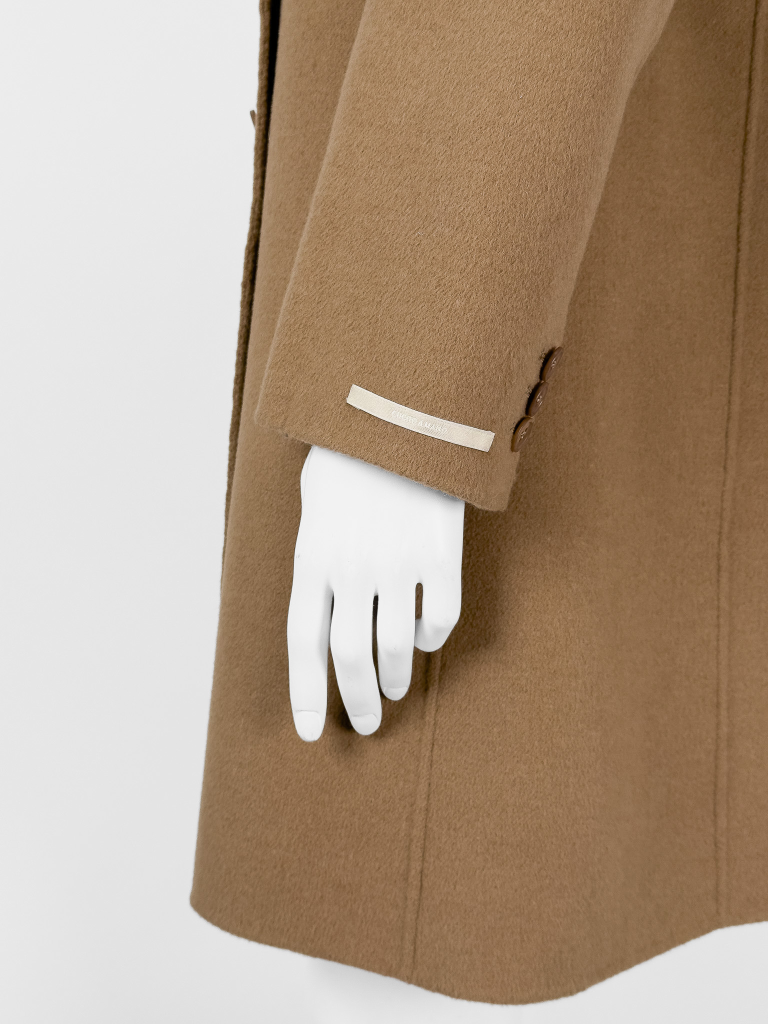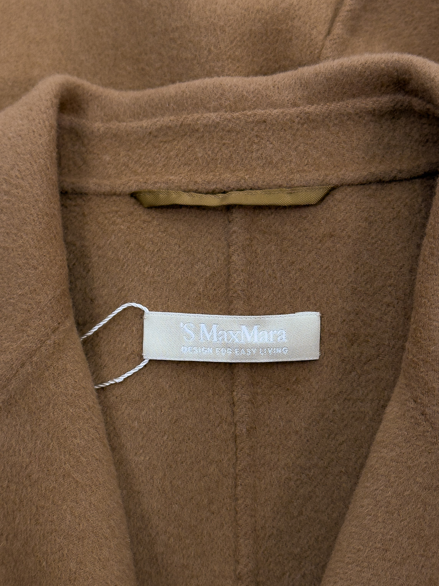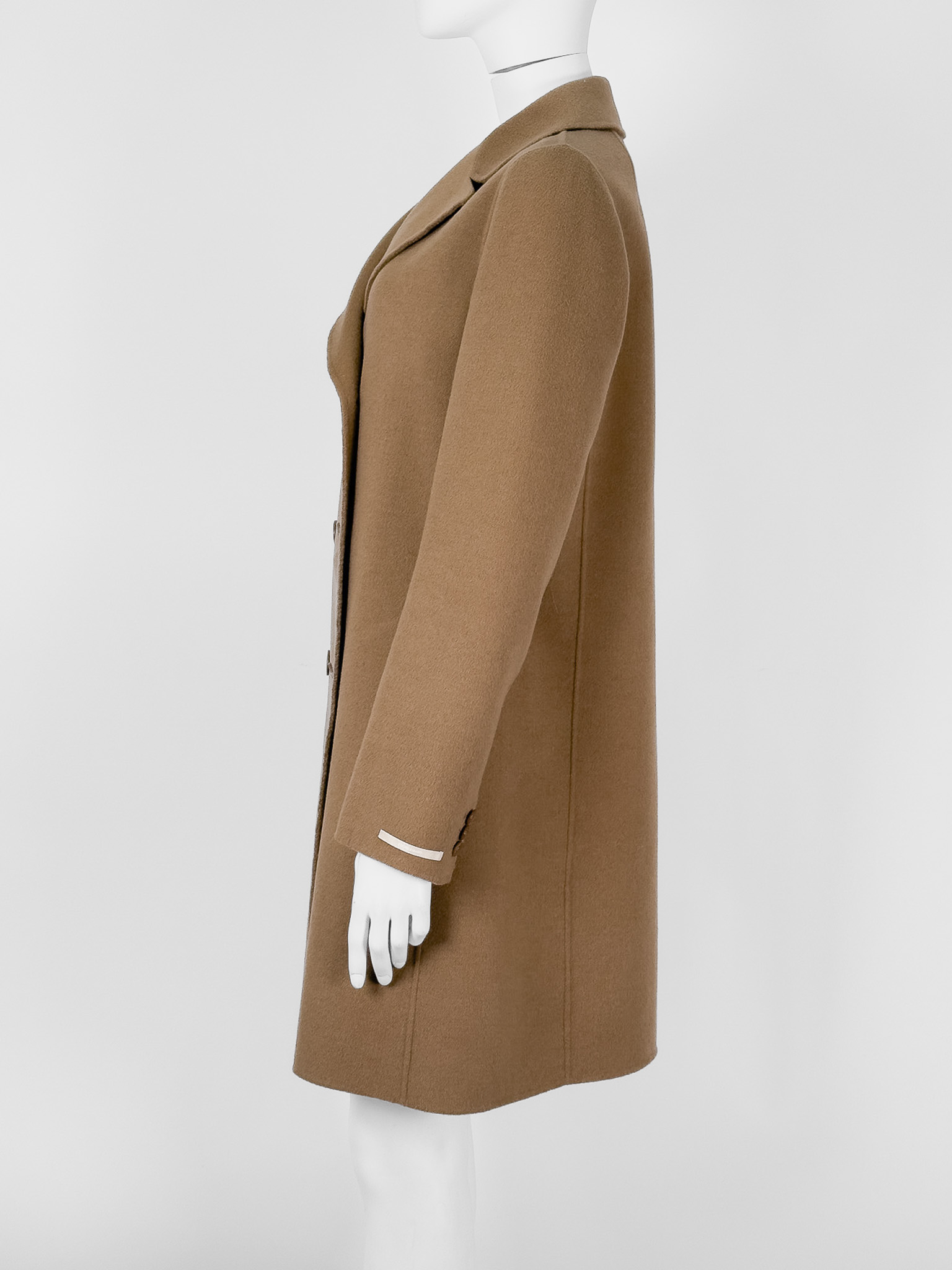 "Camelowy płaszcz bez podszewki, dwurzędowy, prosty krój, mankiety ozdobione guzikami, długość za kolano, rozporek w tylnej części. Stan bardzo dobry, posiada delikatną plamę na w okolicy guzików. Wycięte metki ze składem i rozmiarem. Wymiary: szerokość mierzona od pachy do pachy 54cm, długość całkowita 93cm."