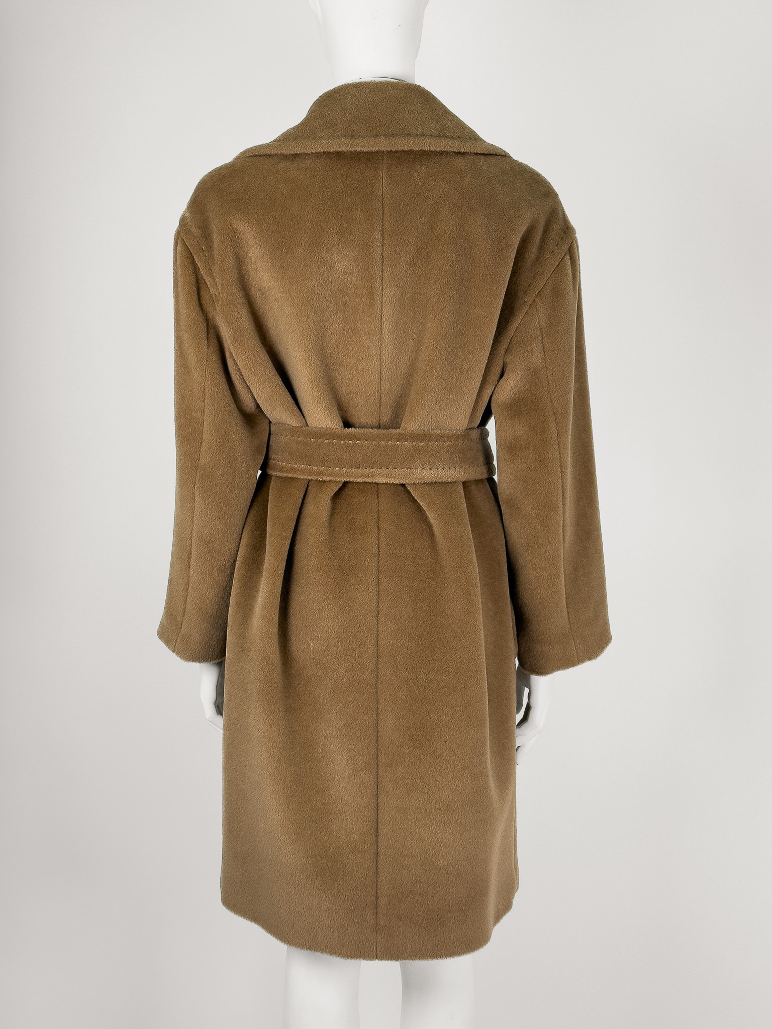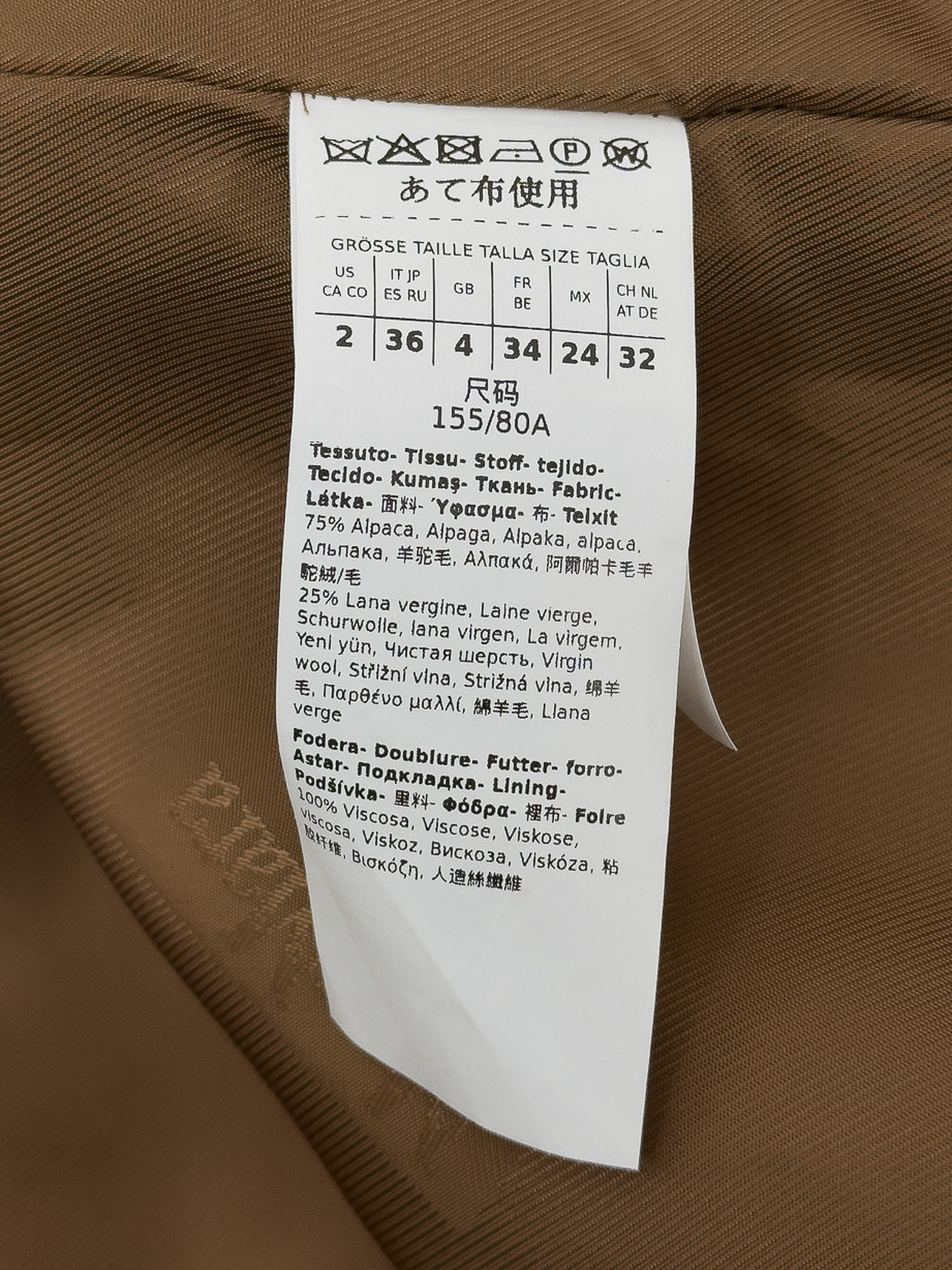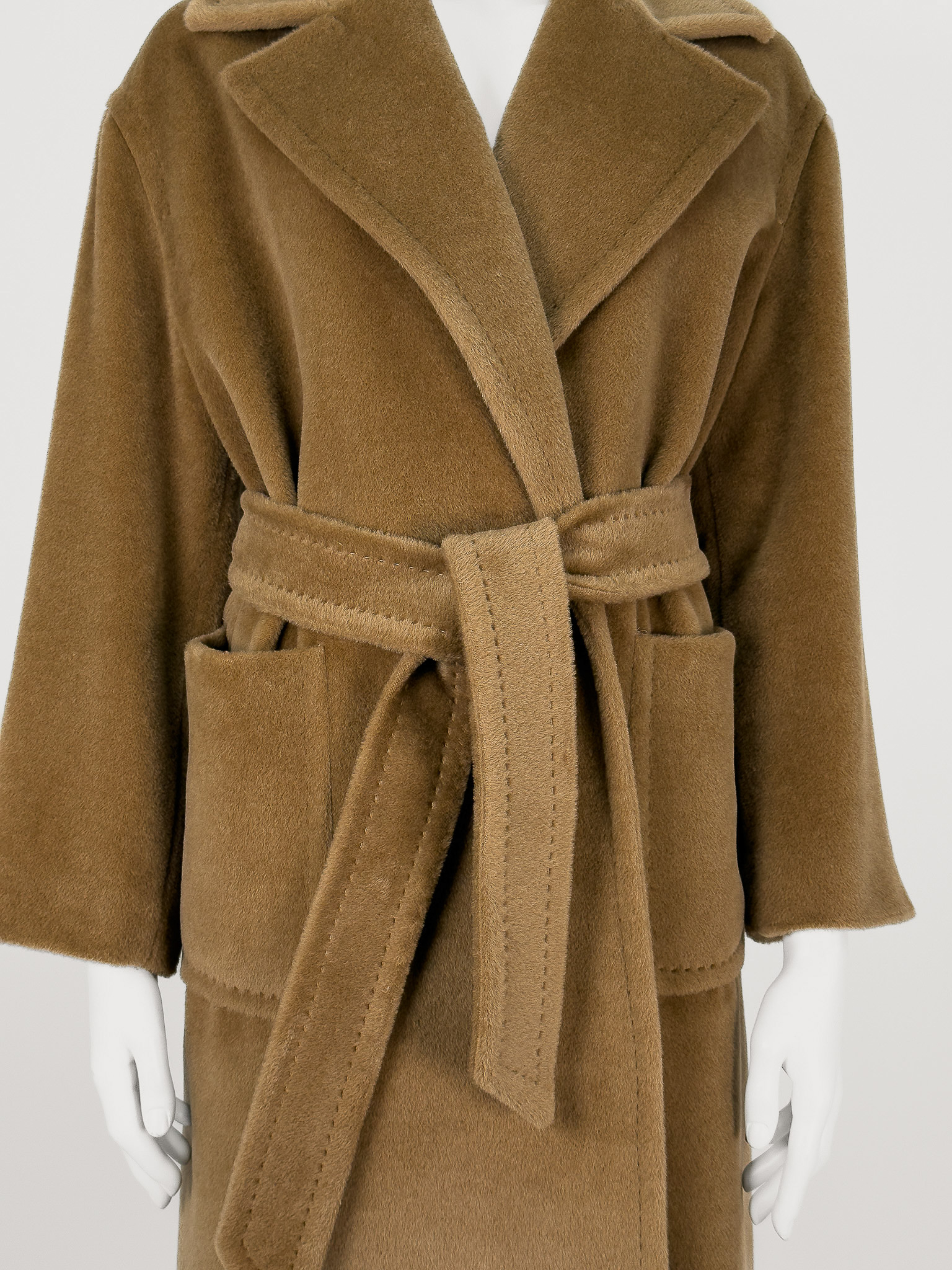 "Camelowy płaszcz z domieszką alpaki w składzie, długość do kolan, zapinany na kryte zatrzaski, wiązany paskiem w pasie, dwie kieszenie po bokach, wykończony stębnowaniem, logowana podszewka. Stan nowy z metką. Rozmiar z metki IT 36. Skład: 75% alpaka, 25% wełna dziewicza; podszewka: 100% wiskoza. Wymiary: szerokość mierzona do pachy do pachy 60cm, długość całkowita 94cm."