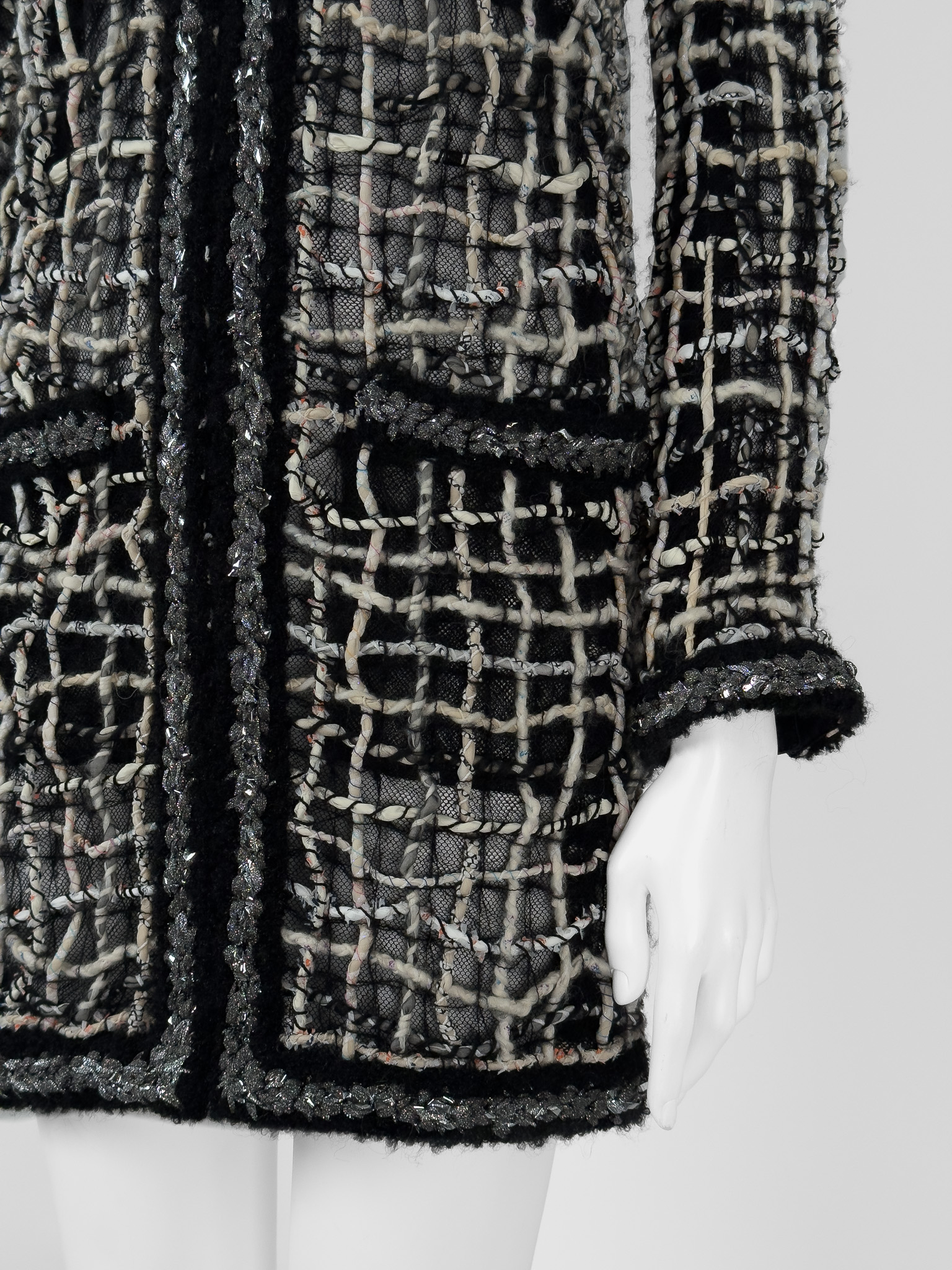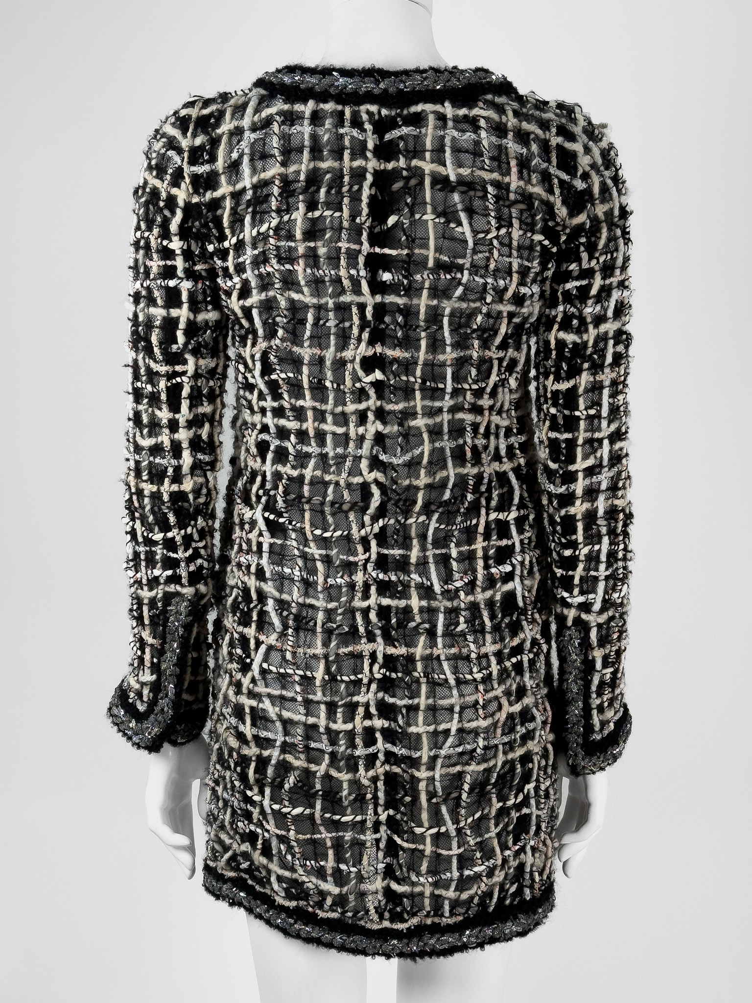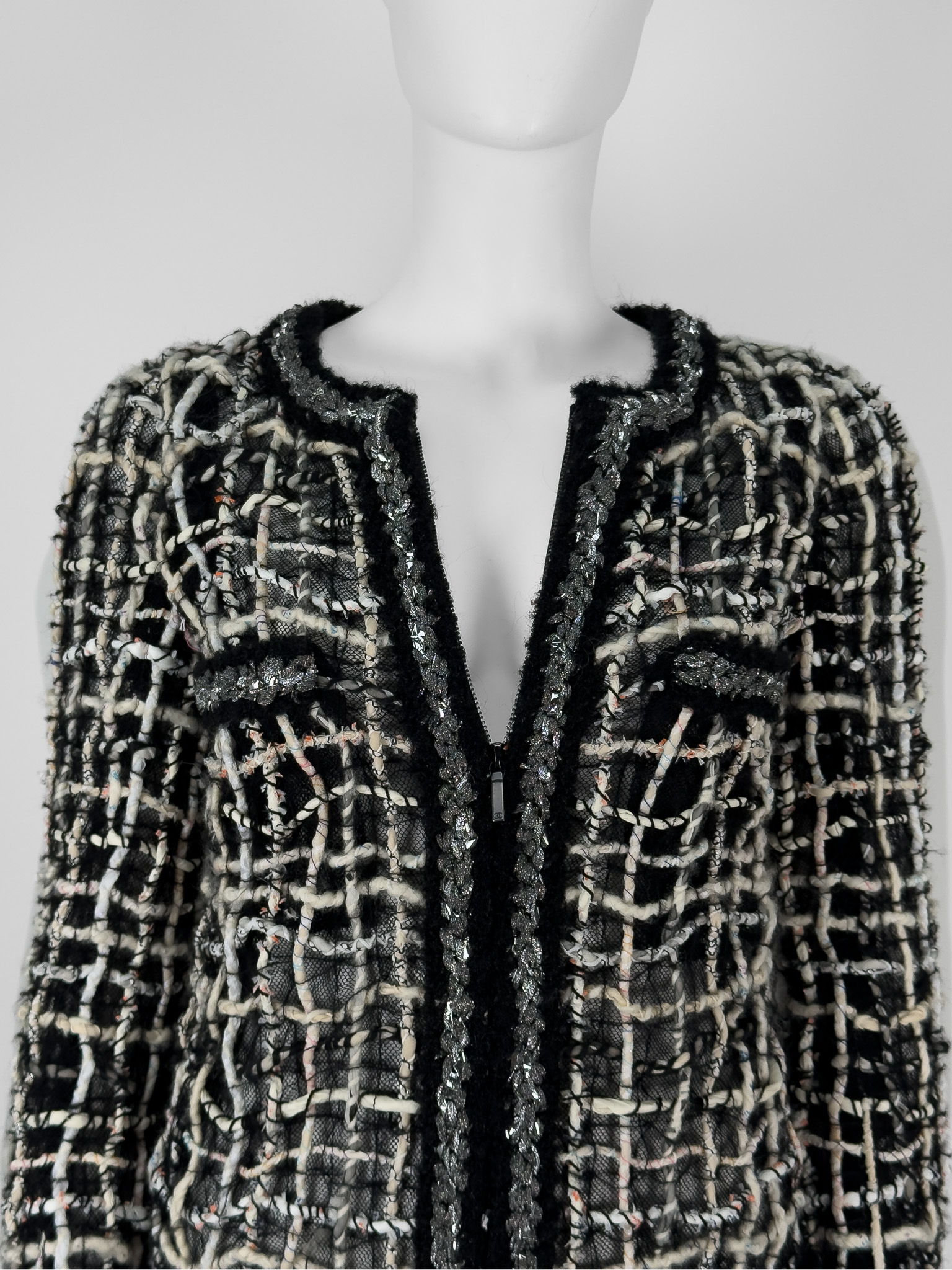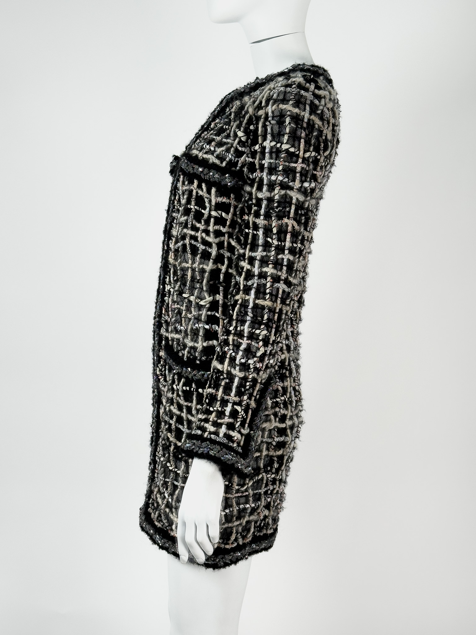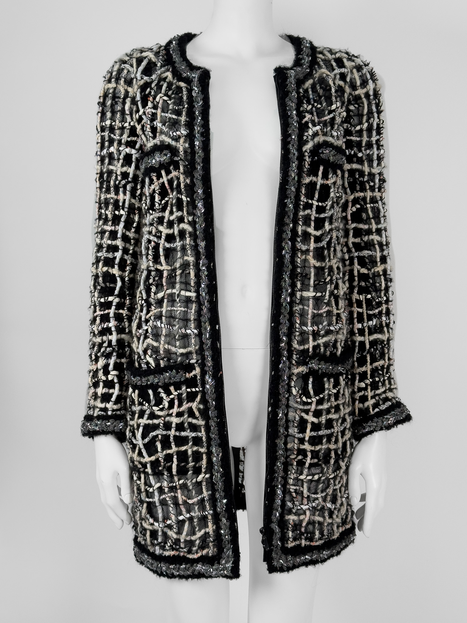 "Czarny płaszcz z długim rękawem, połączenie różnych tkanin, jasnego splotu, metalicznego wzdłuż zamka. Zapinany na kryty suwak oraz delikatnie rozpinane rękawy. Rozmiar z metki 36. Skład: 42% poliester, 20% jedwab, 20% wełna, 7% akryl, 6% bawełna, 4% poliamid, 1% papier. Stan bardzo dobry. Wymiary: szerokość mierzona od pachy do pachy 42cm, długość całkowita 87cm."