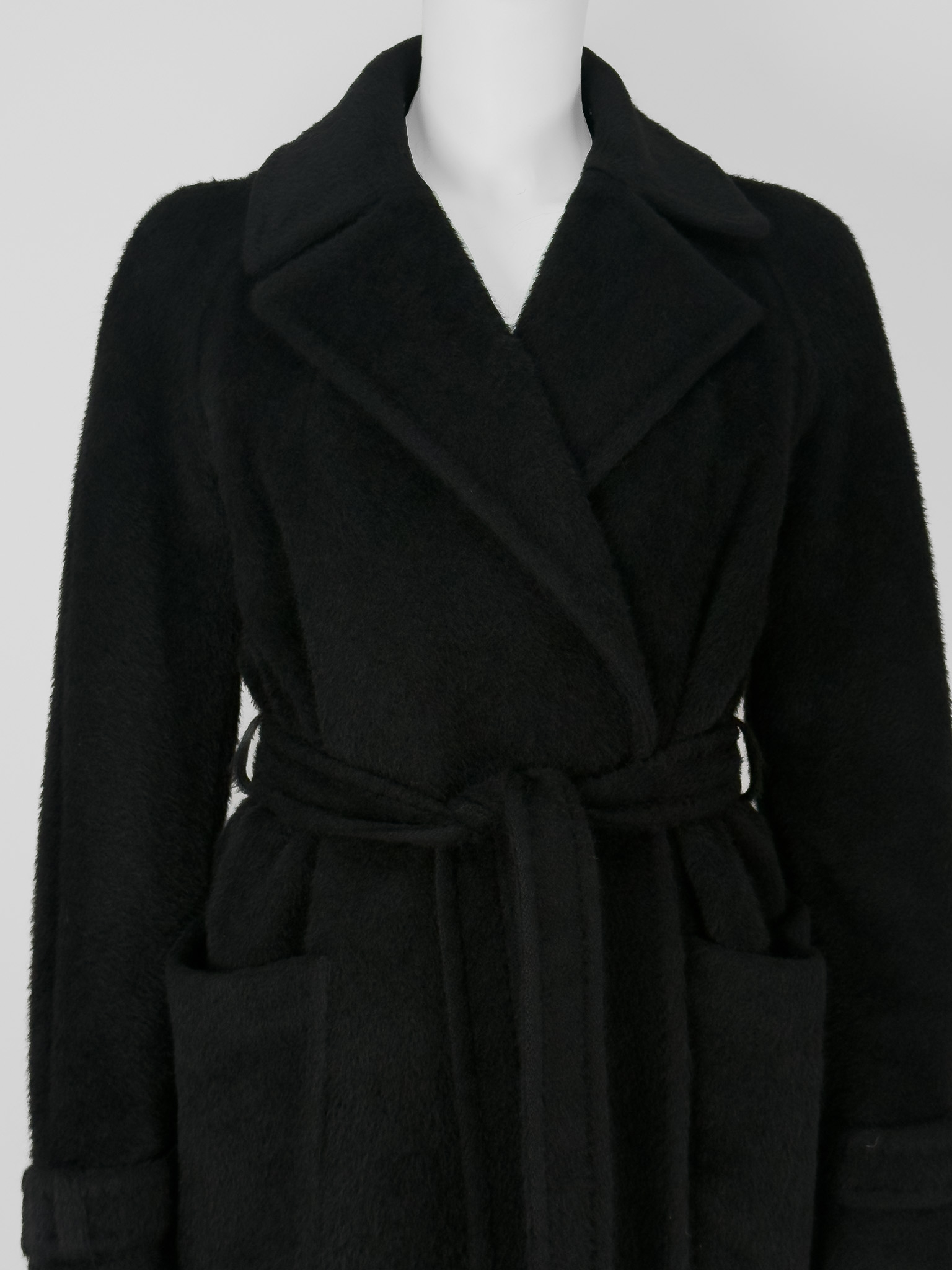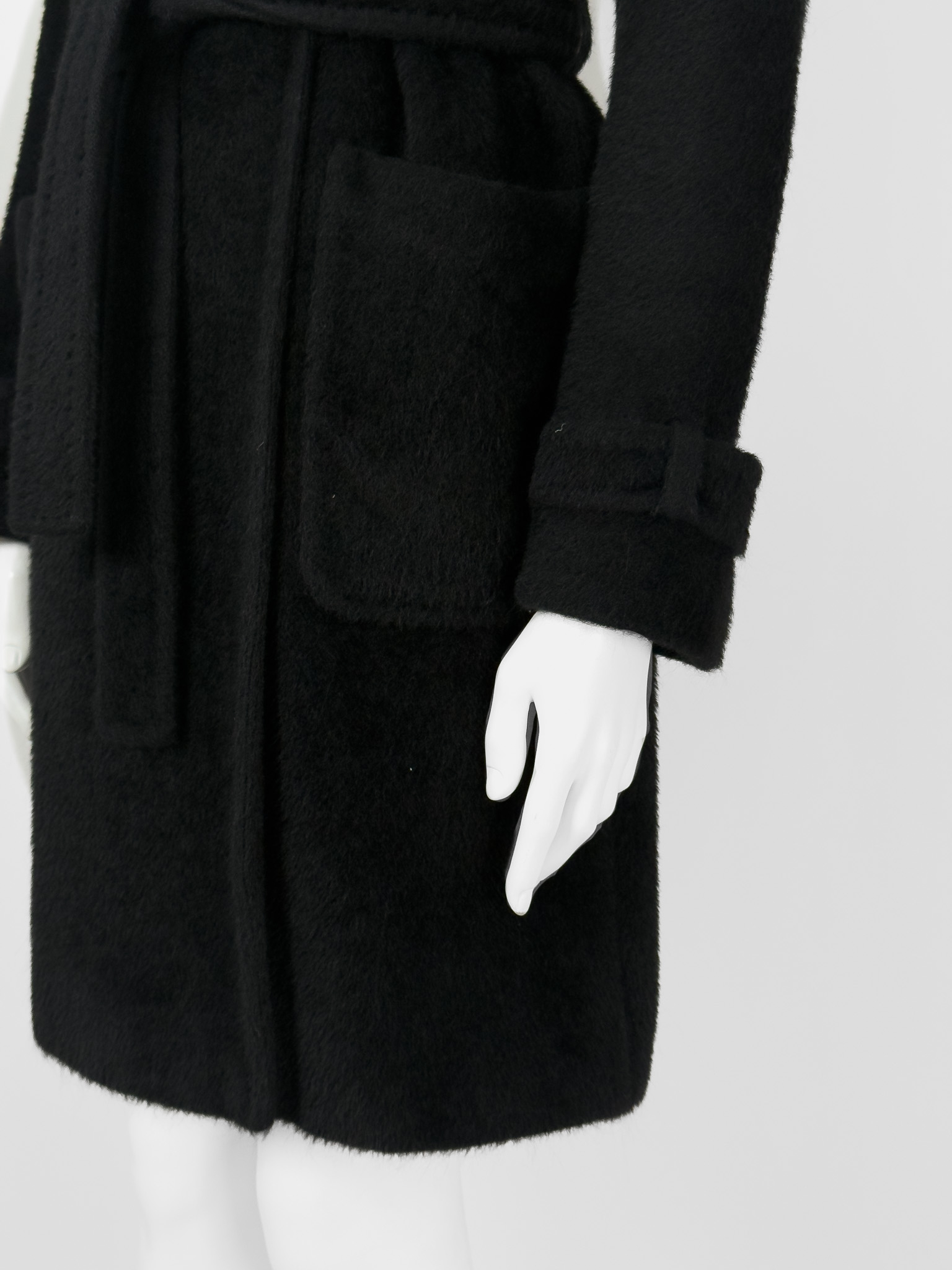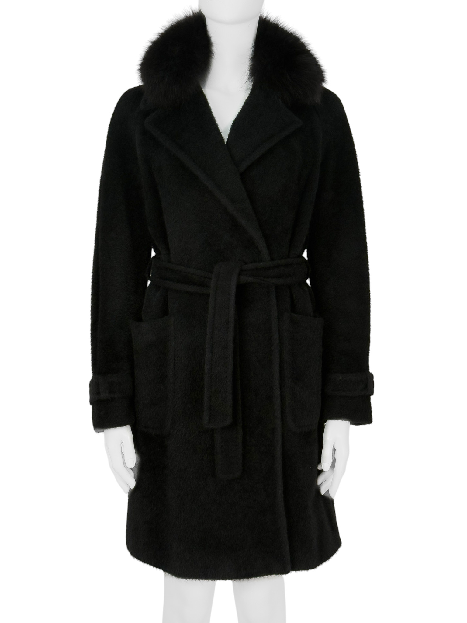 "Czarny, średniej długości płaszcz z podszewką oraz futrzanym kołnierzem. Możliwość przewiązania paskiem, dwie duże kieszenie z przodu. Skład: 70% alpaka, 30 % wełna. Wymiary: ramiona 49 cm, szerokość w pasie 48 cm, długość 102 cm."