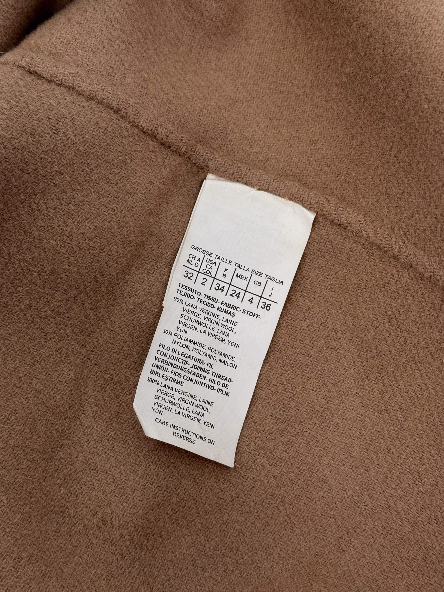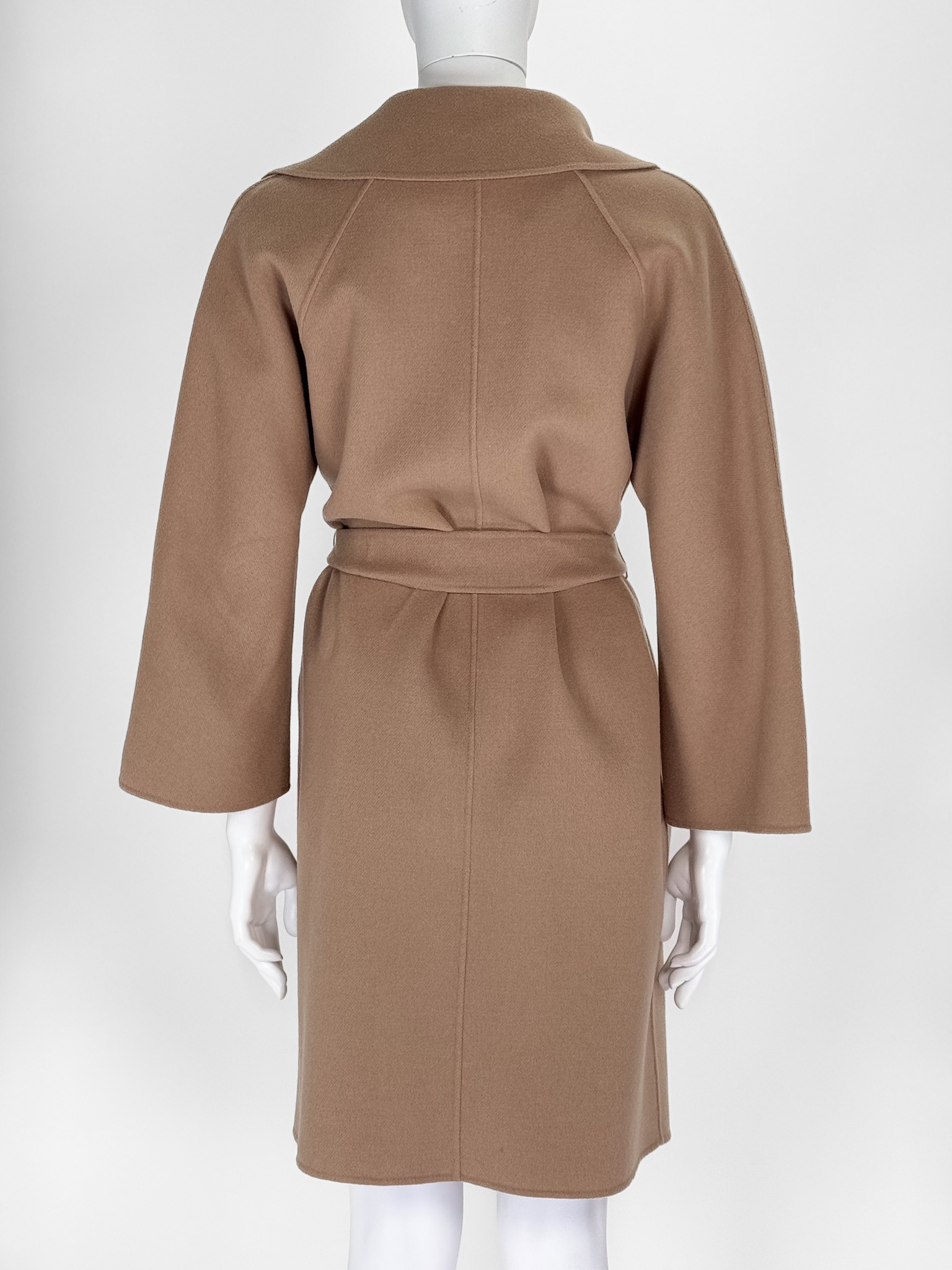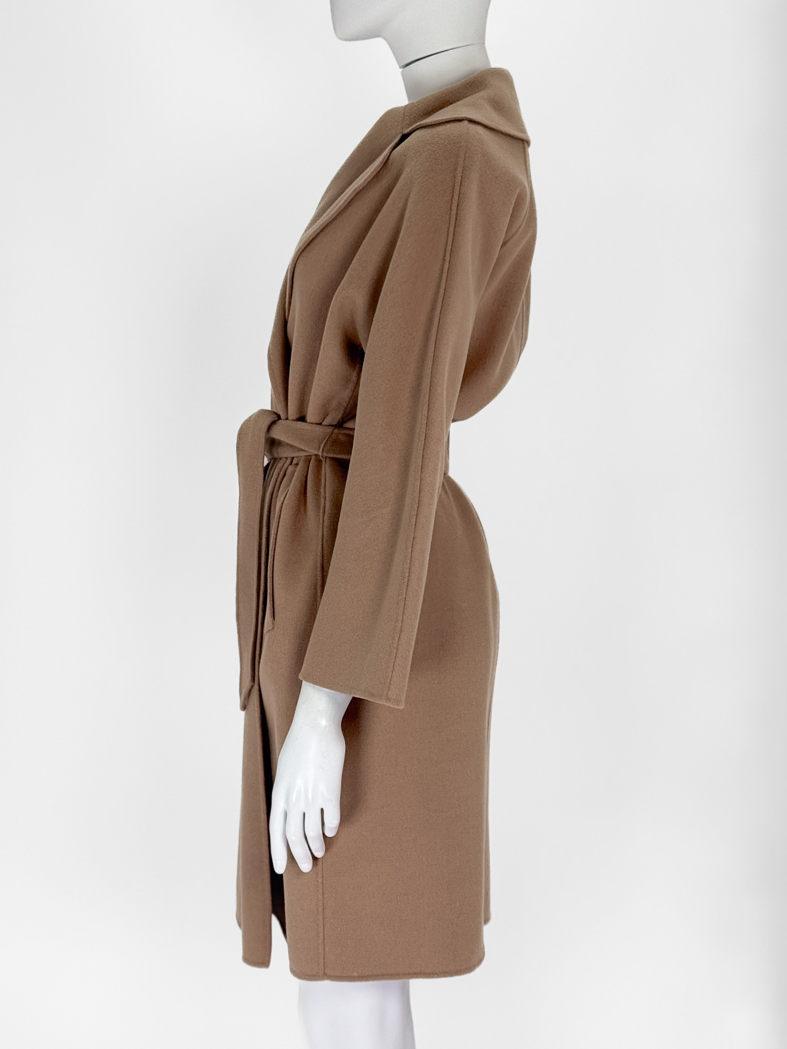 "Camelowy płaszcz WEEKEND MaxMara, wiązany w talii paskiem. Długość za kolano. Rozmiar I/36. Skład: 90% wełna, 10% poliamid. Wymiary: długość: 95cm, szerokość: 55cm"