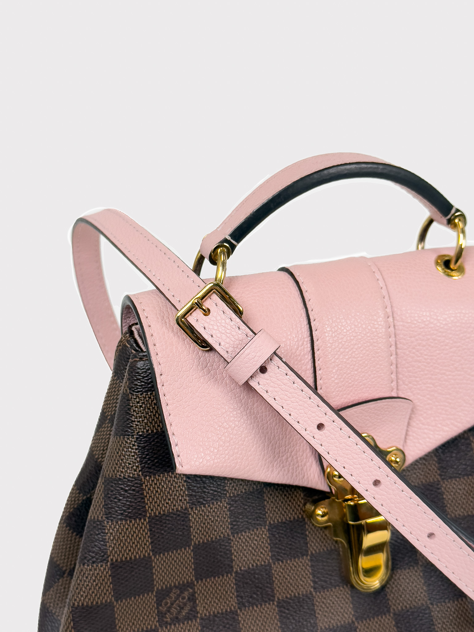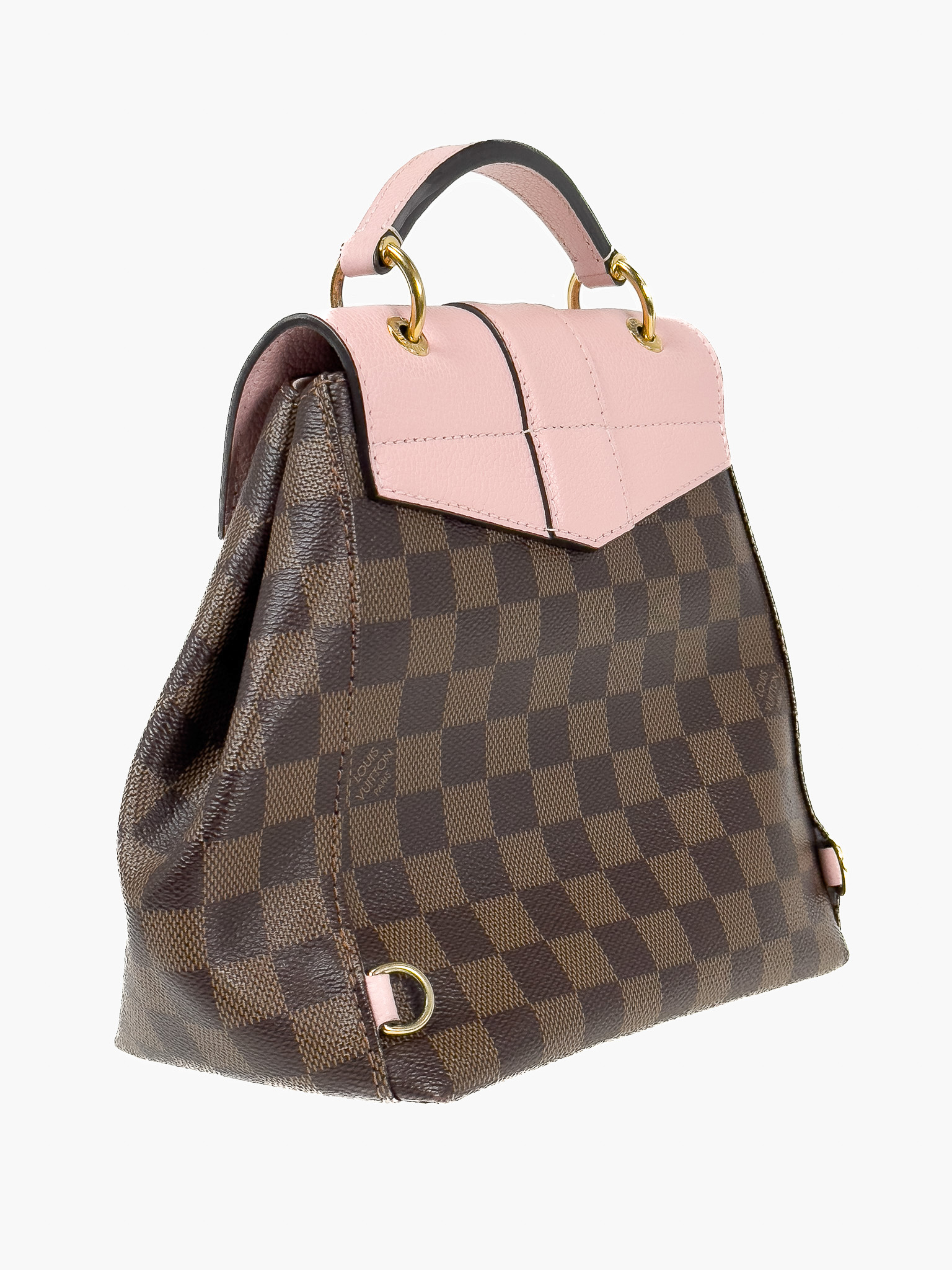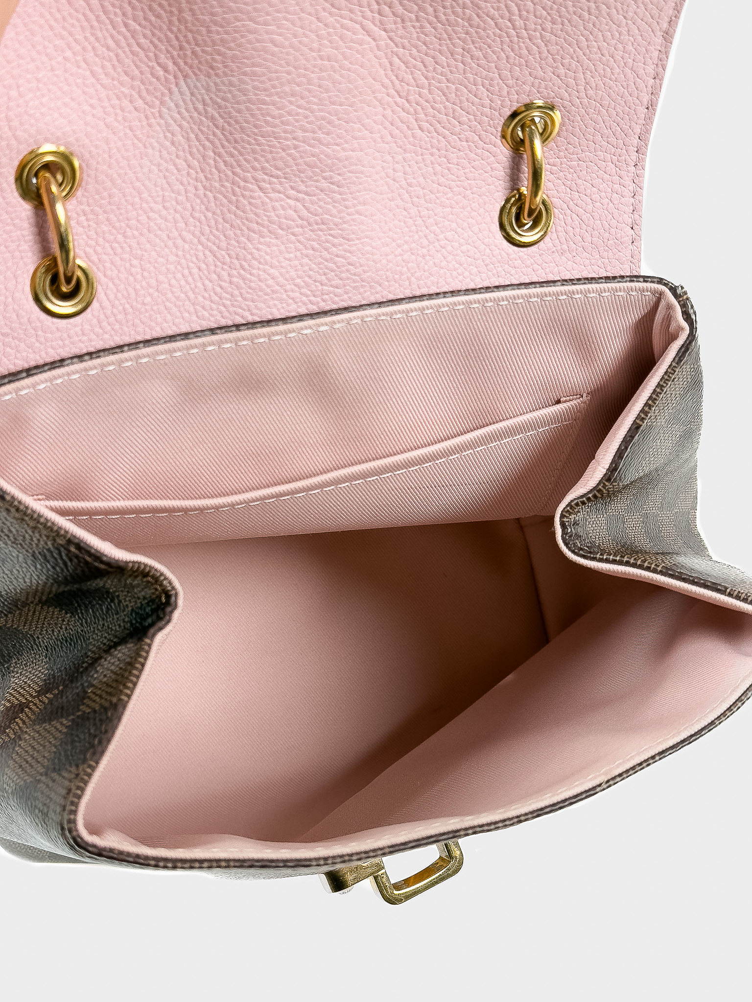 "Model: Clapton. Brązowy plecak/torebka do ręki w motyw damier z logo marki, różowe elementy wykonane z groszkowej skóry, regulowane, odpinane szelki, złote logowane zapięcie na przodzie, jedna komora z kieszenią wewnątrz. W zestawie: pudełko oraz worek przeciwkurzowy. Stan bardzo dobry, delikatne zabrudzenia wewnątrz, rysy na zapięciu. Wymiary: szerokość 20cm, wysokość 21 cm, głębokość 12cm."