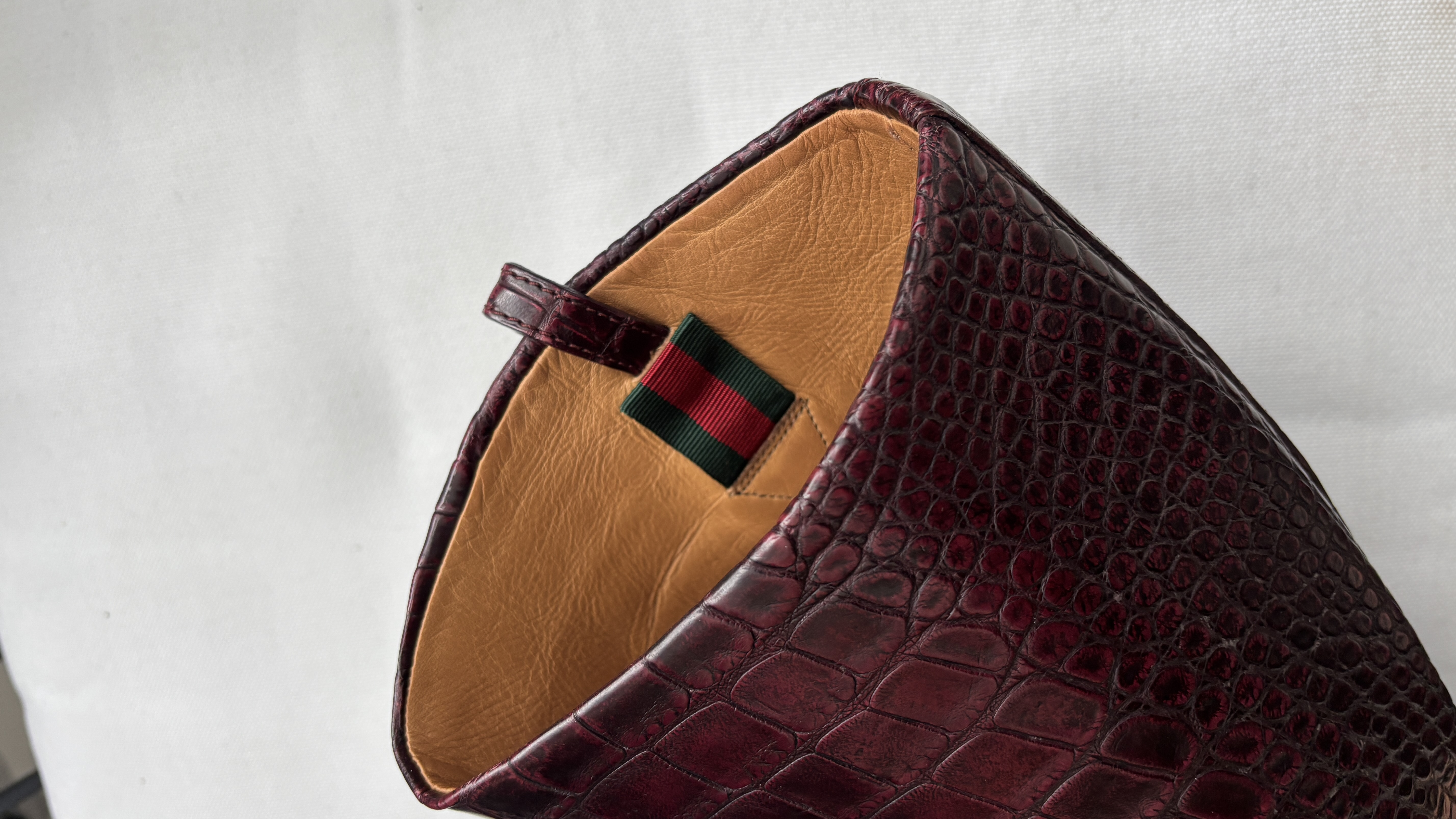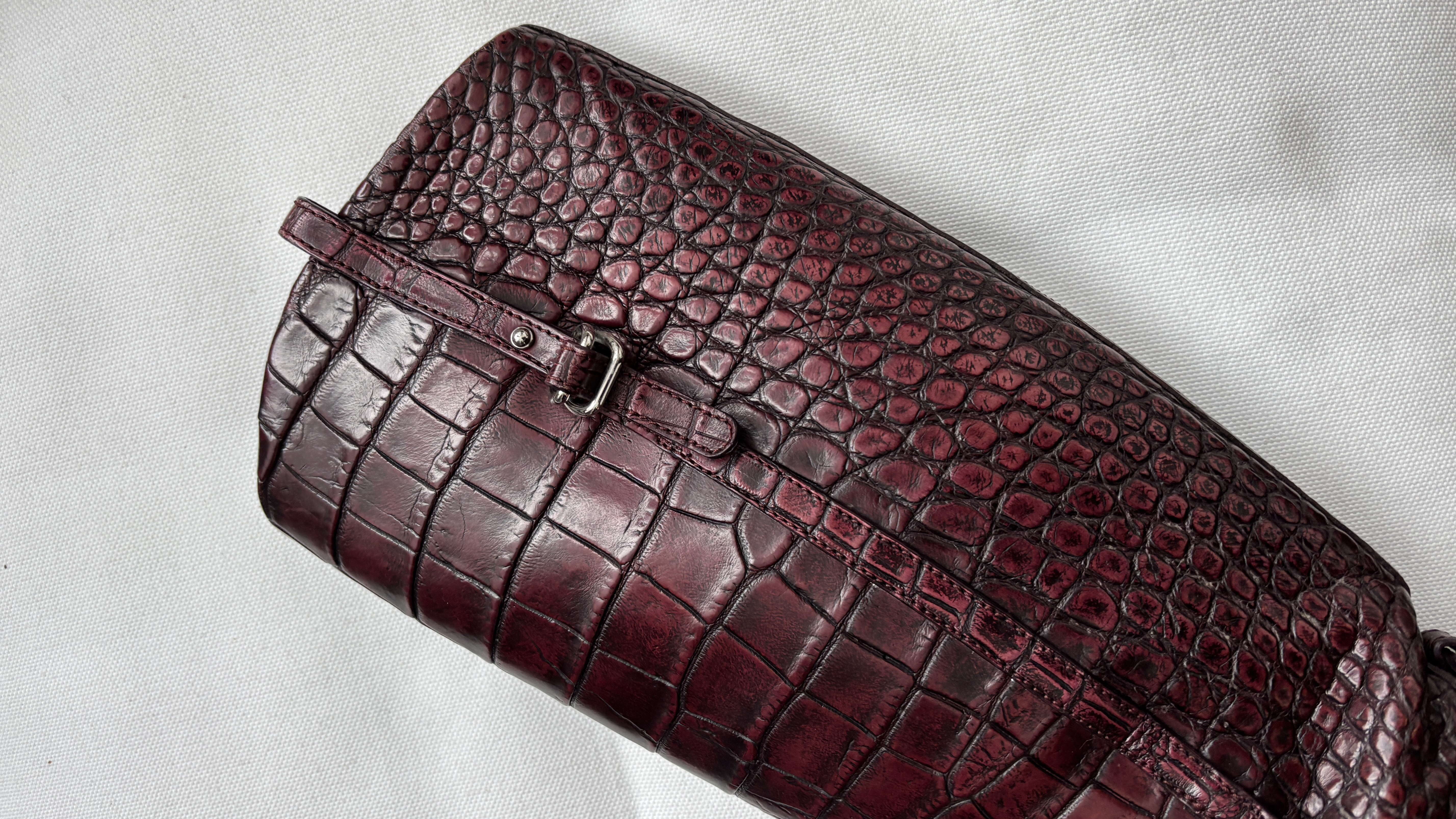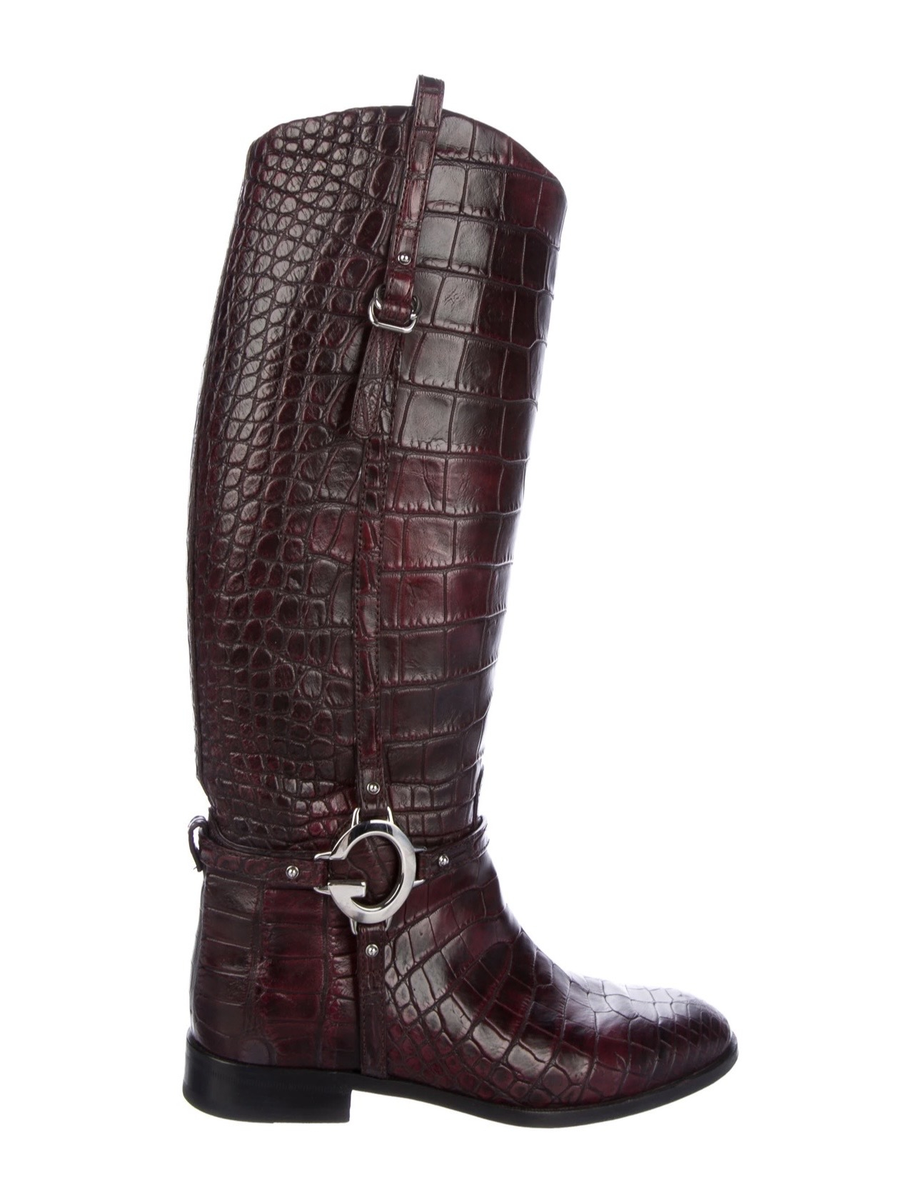 "bordowe kozaki, skóra krokodyla, muszkieterki na płaskim obcasie, srebrne sprzączki i logo G od zewnetrznej strony, rozmiar 37,5, podzelowane"