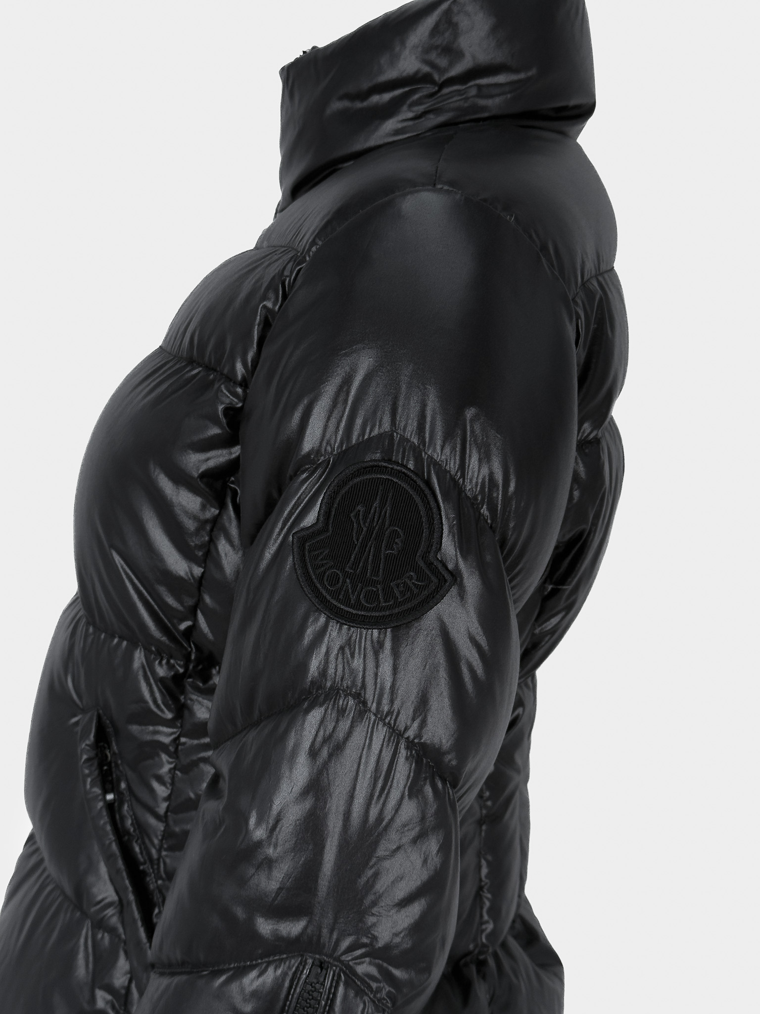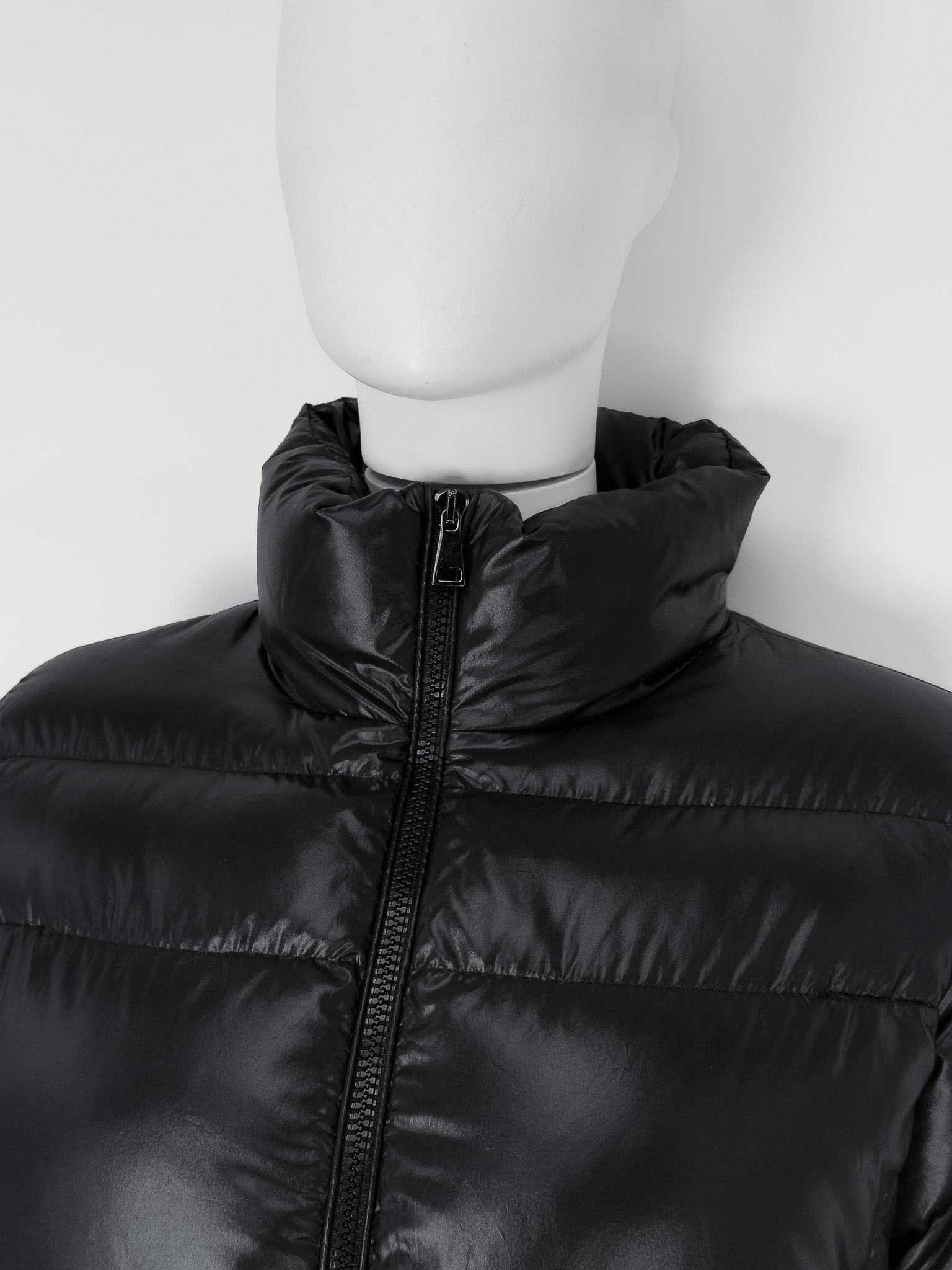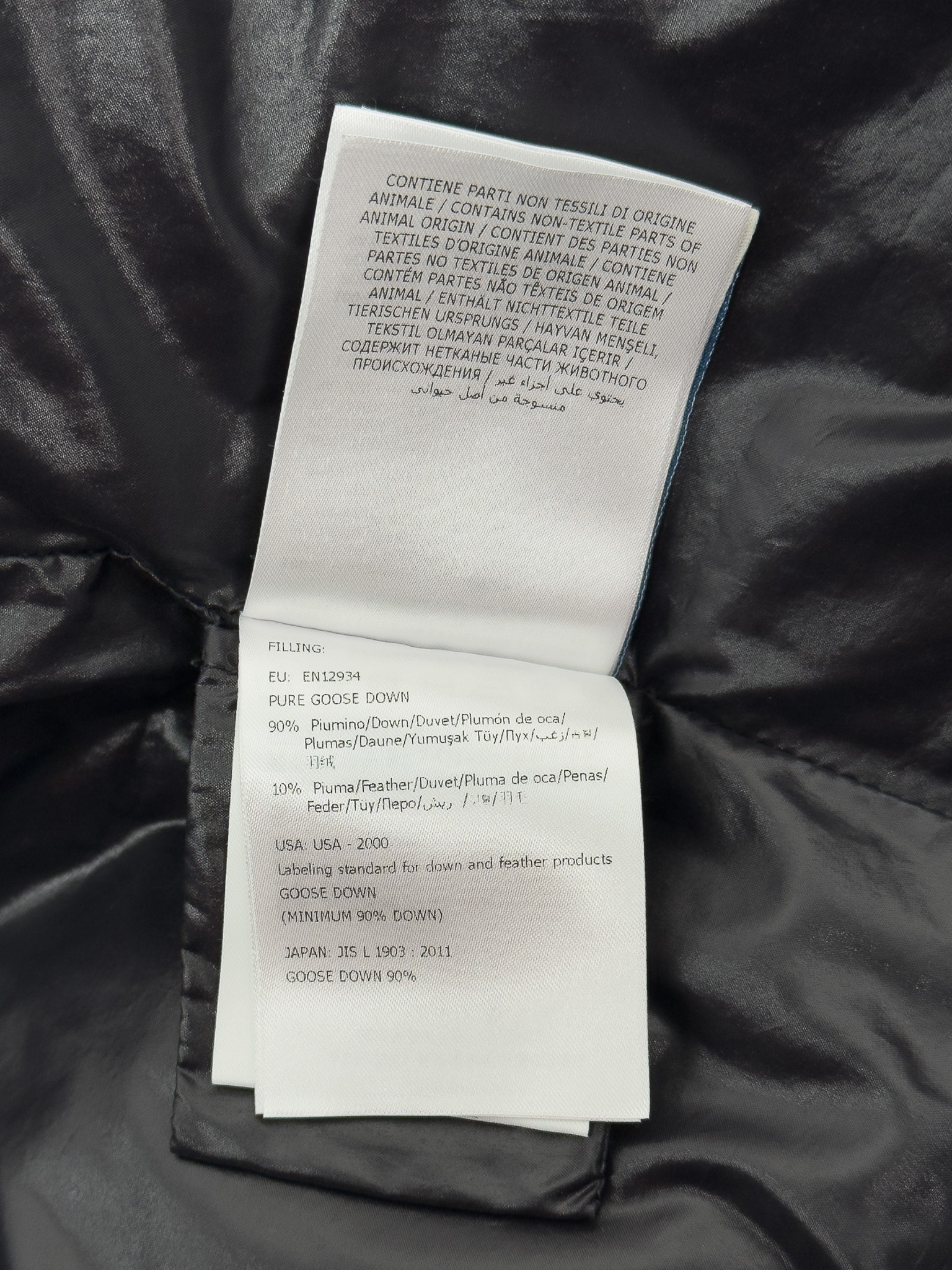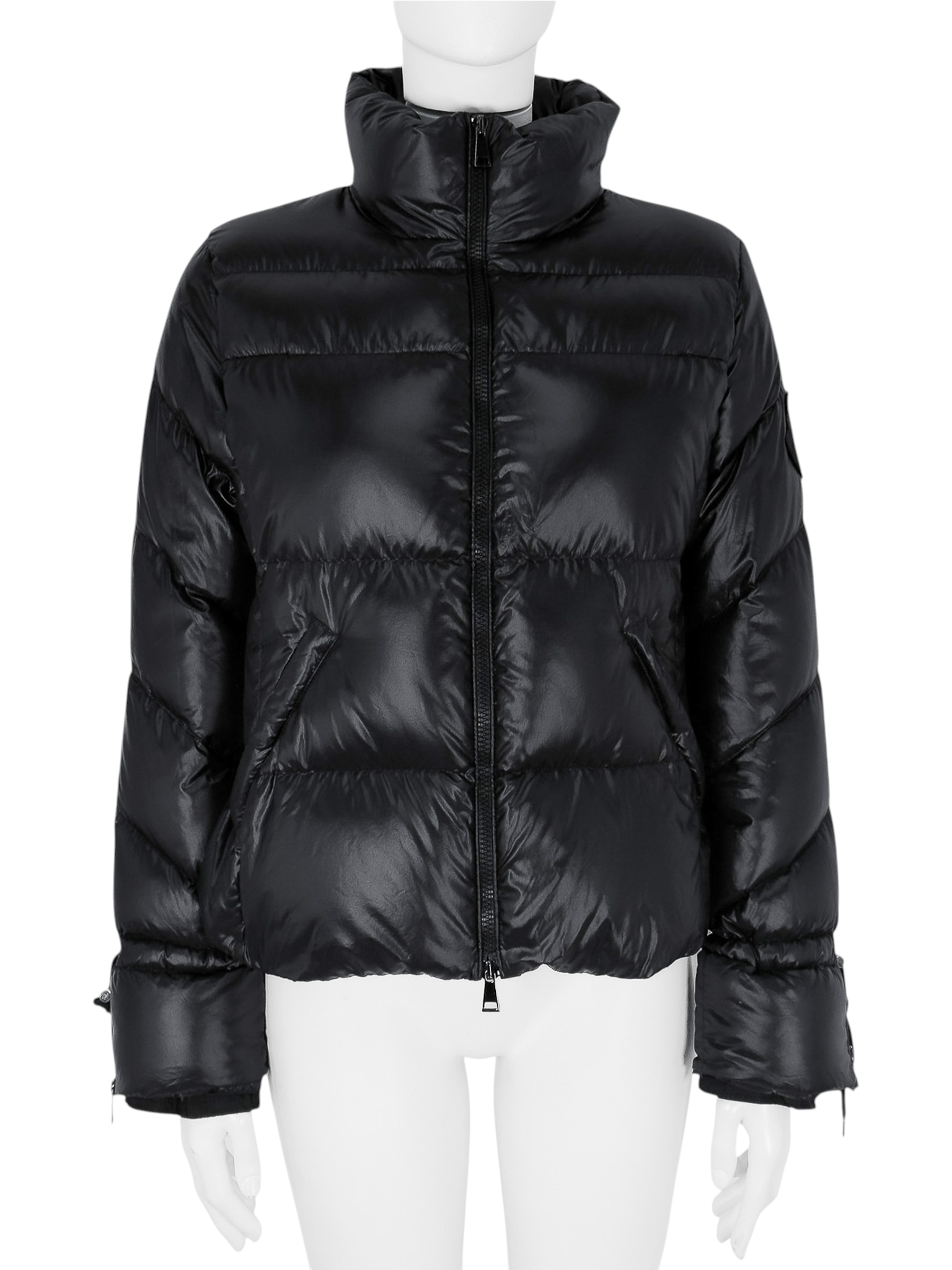 "Czarna puchowa kurtka, lekko taliowana, posiada zamki po bokach rękawów oraz ściągacze, czarne logo marki na rękawie, stójka, zapinana na dwa suwaki, pikowana, dwie zasuwane kieszenie po bokach. Rozmiar z metki S. Stan bardzo dobry. Skład: 100% poliamid; wypełnienie: 90% puch, 10% pióra. Wymiary: szerokość mierzona od pachy do pachy 51cm, długość całkowita 60cm."