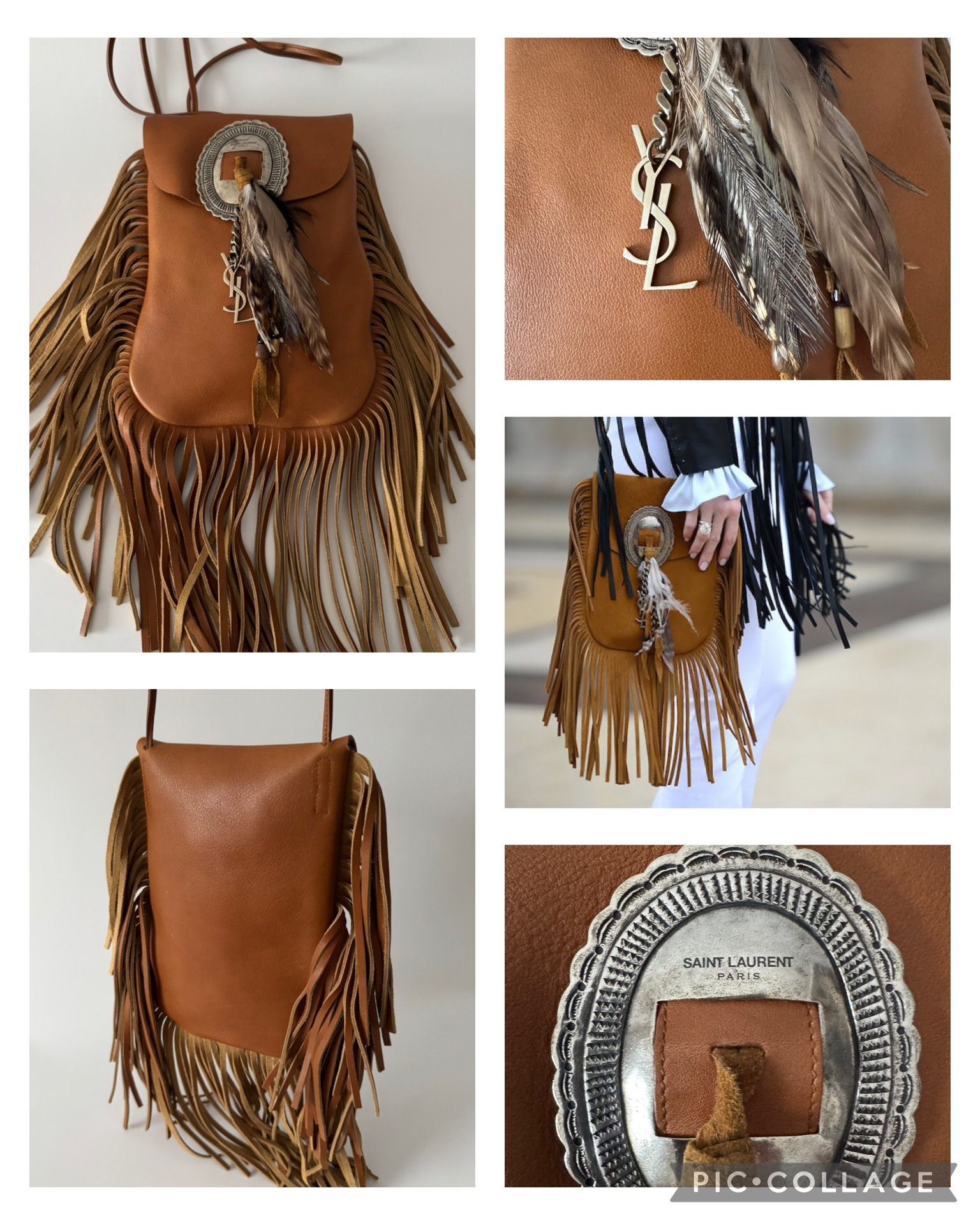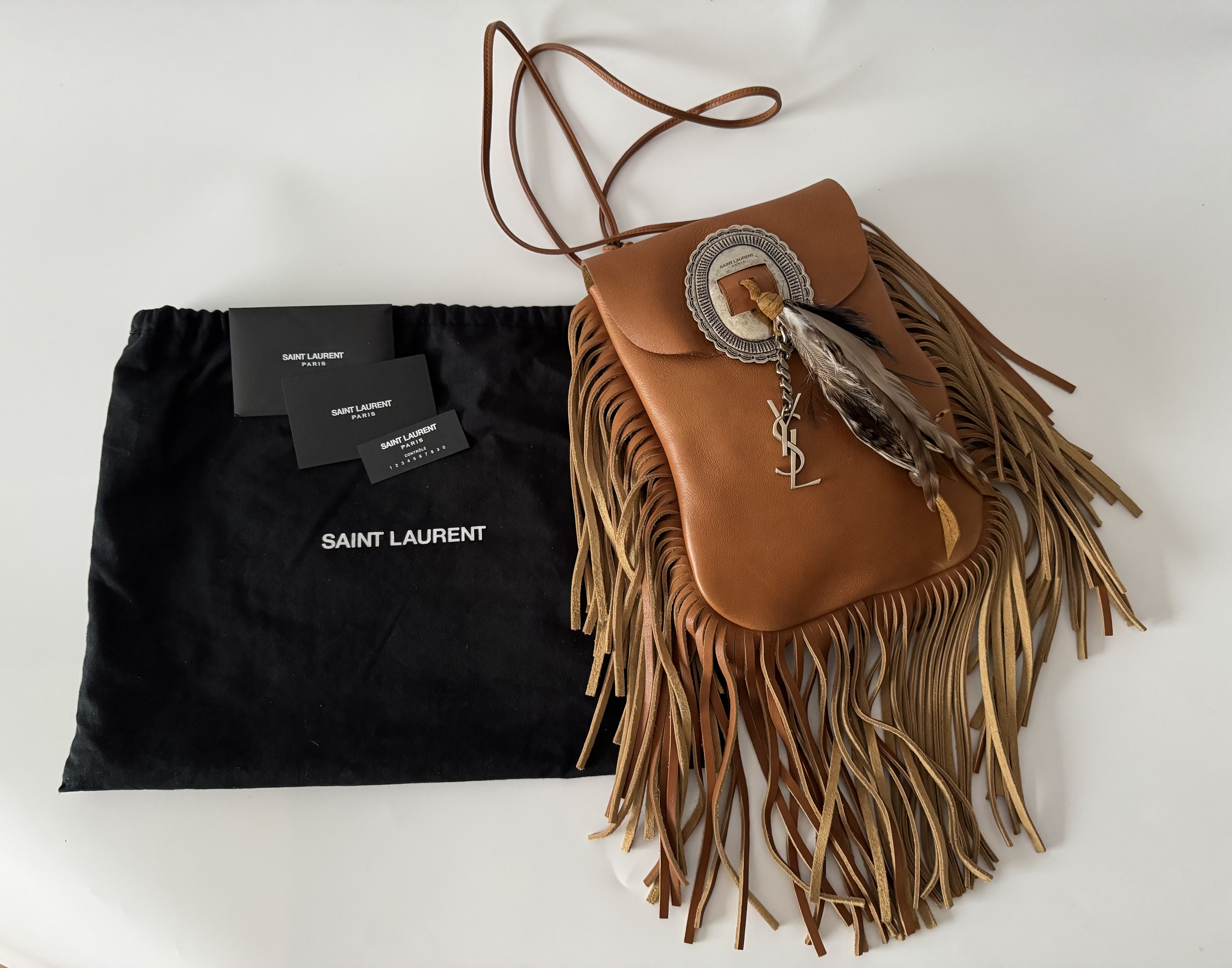 ""SAINT LAURENT Anita Fringe Boho Flap Bag - torebka ▪️Limitowany, absolutnie wyjątkowy model! ▪️Przepiękna torebka w stylu boho wykonana z gładkiej skóry w kolorze „Tan” (karmel). ▪️Ozdobiona frędzlami oraz piękna rzeźbioną blaszką w kolorze postarzanego srebra z wygrawerowanym logo z charmsem YSL i piórami. ▪️W środku zamszowa podszewka i jedna komora, która pomieści codzienne drobiazgi. ▪️Na długim skórzanym pasku, który można wiązać na dowolnej długości w supeł. ▪️ Wymiary: 17 x 26 x 3 cm. ▪️ Stan bardzo dobry z minimalnymi śladami na skórze. ▪️ W zestawie z workiem przeciwkurzowym. ▪️ Jest to bardzo rzadko występujący model z drugiej ręki, zwłaszcza w tej wersji z piórami - zdobywasz zatem egzemplarz kolekcjonerski!""