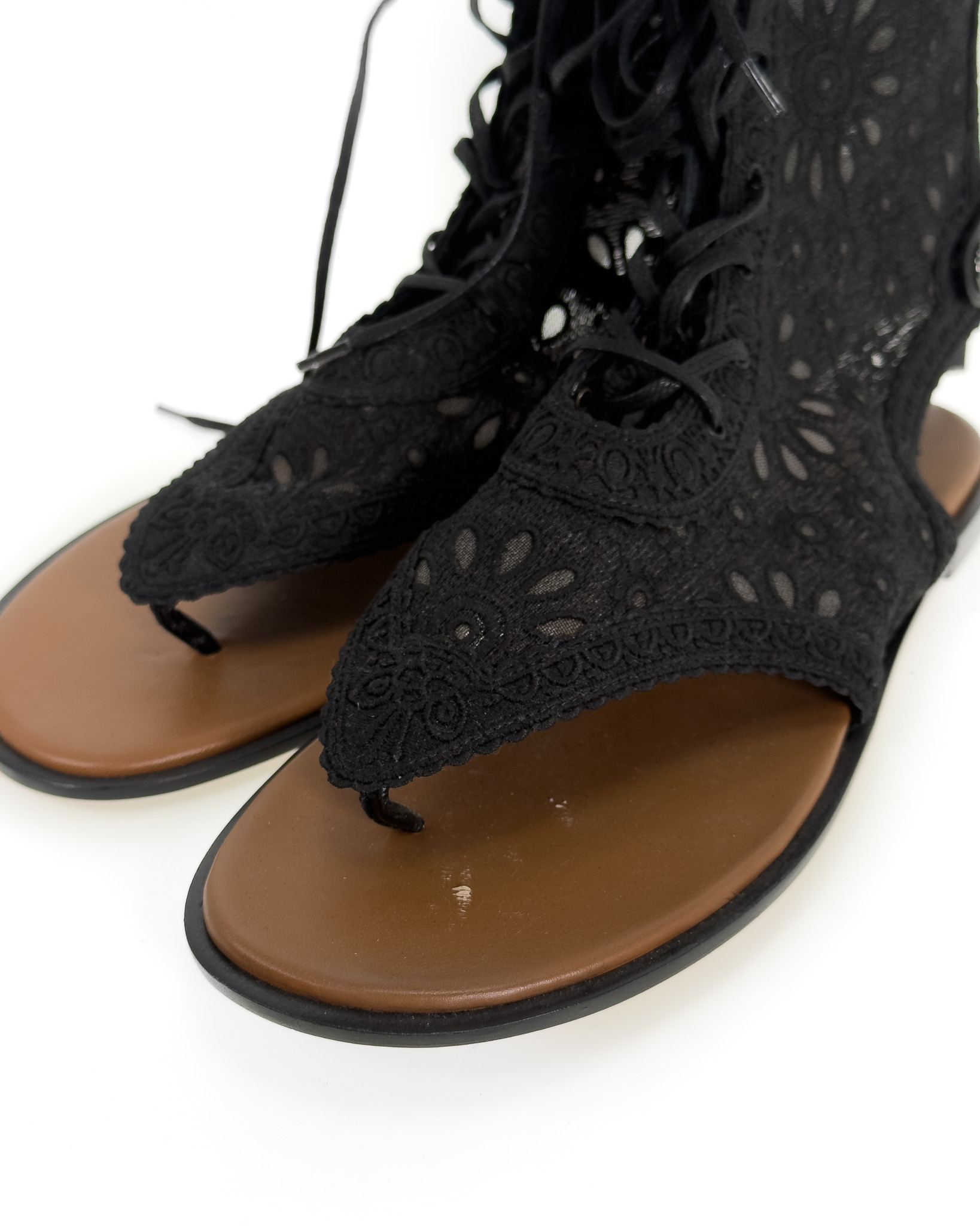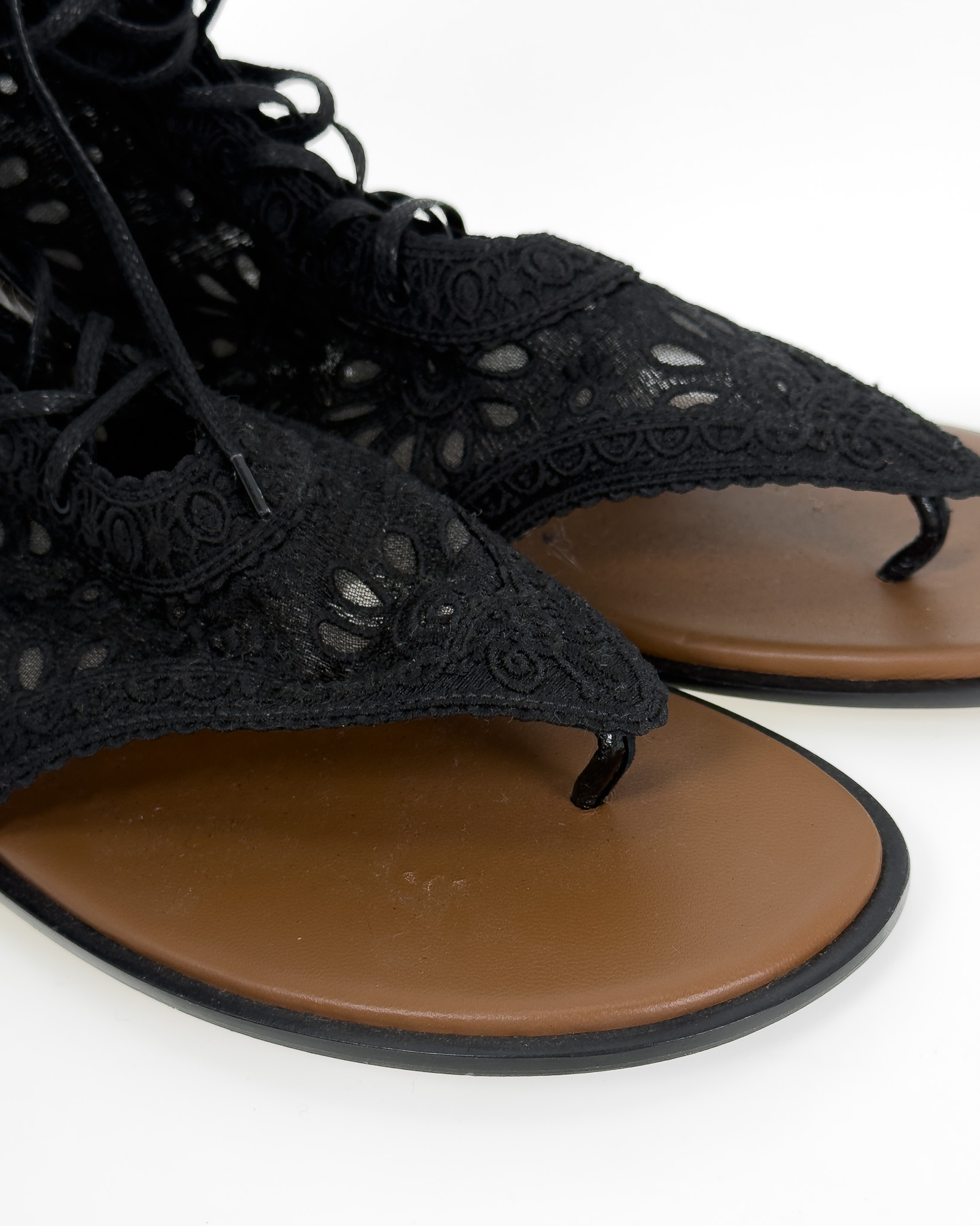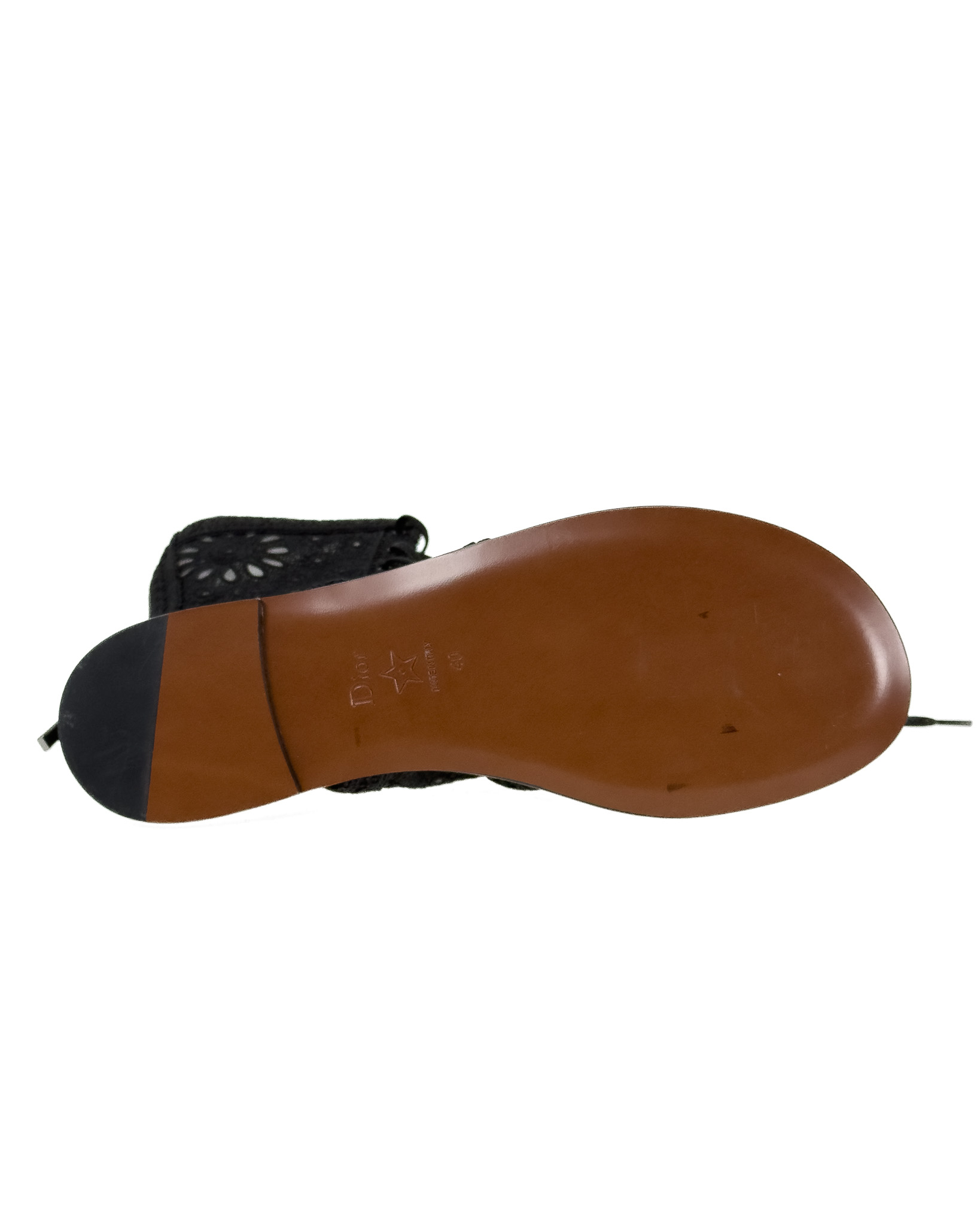"Czarne sandały ozdobione transparentnym wzorem o motywie kwiatowym, typu japonki, pasek ze złotym logo marki zapinany na zatrzask w tylnej części, sznurowane na przodzie, suwak nad piętą, wyższa cholewka, zaokrąglone noski, brązowa skórzana wkładka. Stan nowe, posiadają niewielkie zadrapanie na wkładce lewego buta. Rozmiar 40."