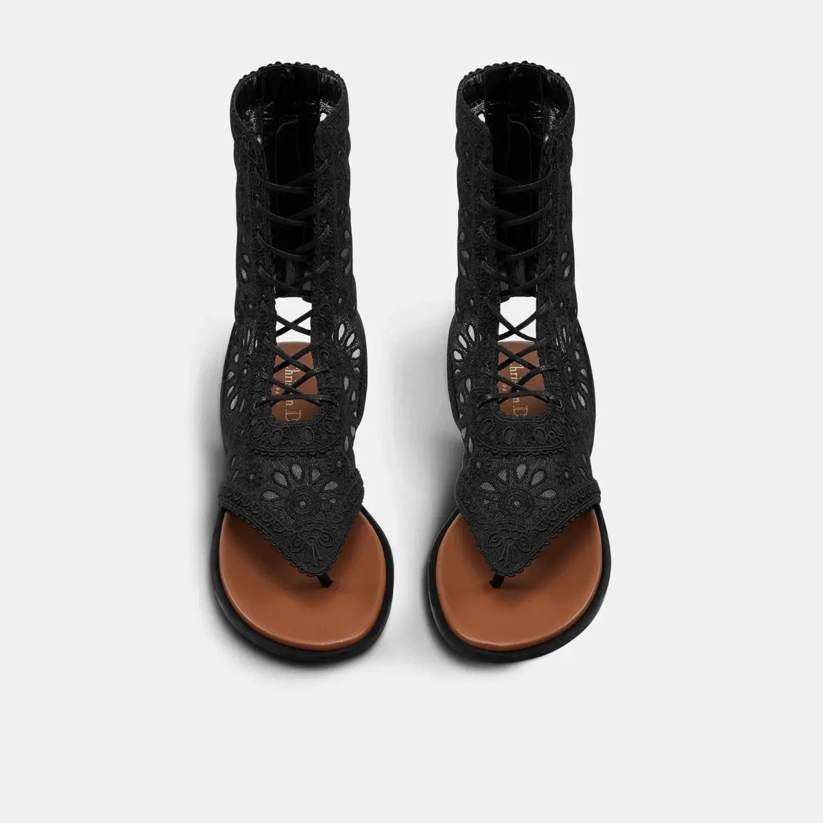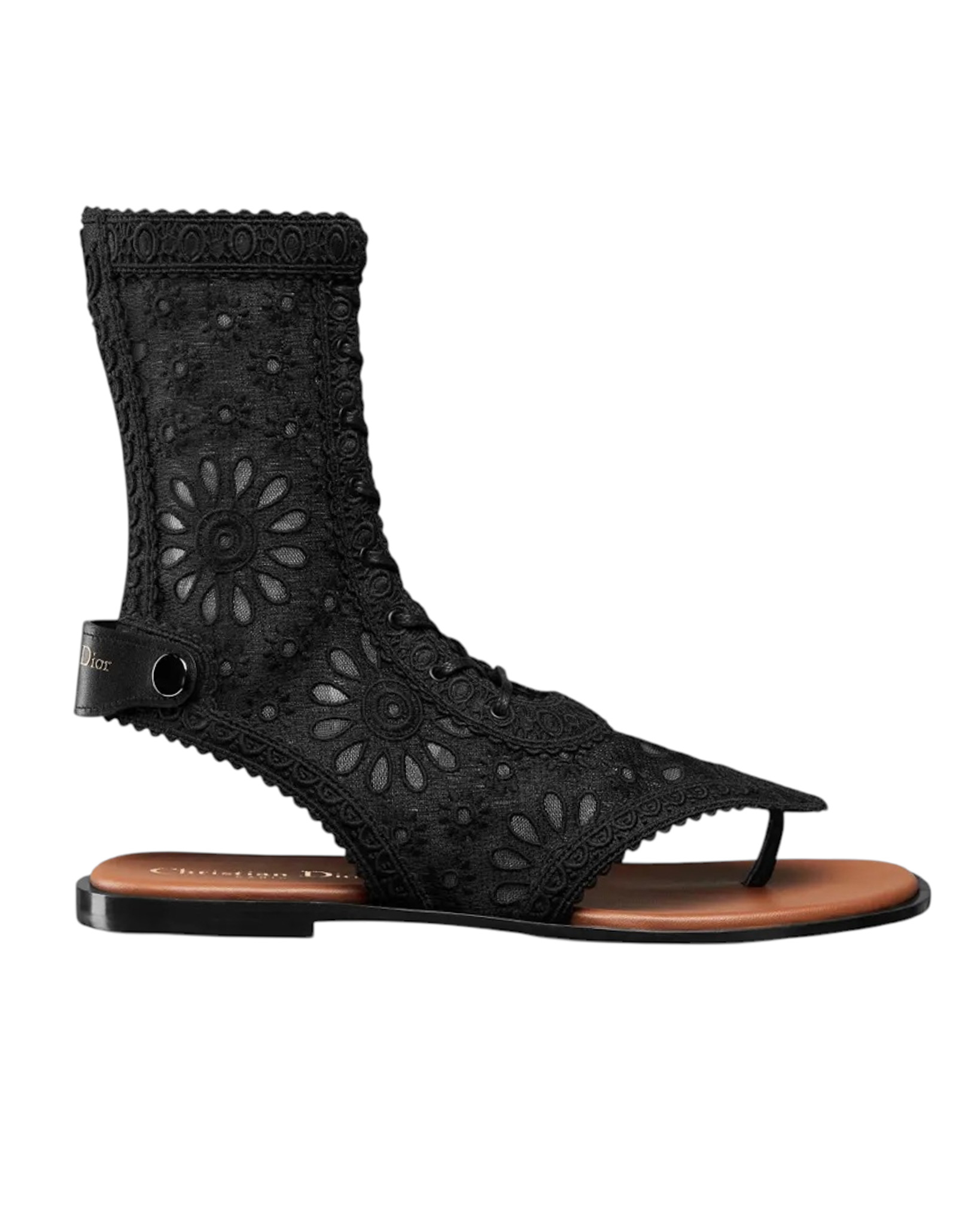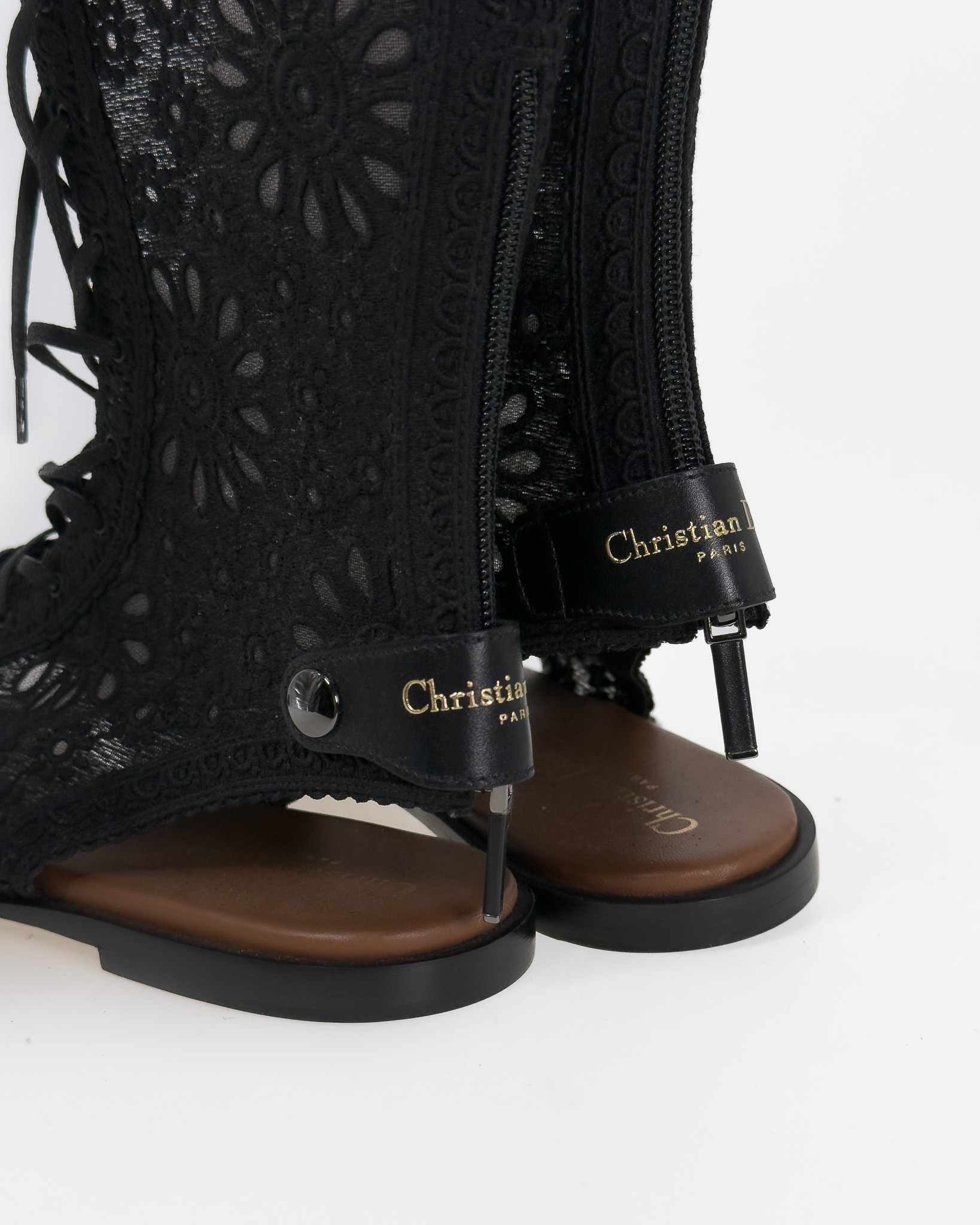 "Czarne sandały ozdobione transparentnym wzorem o motywie kwiatowym, typu japonki, pasek ze złotym logo marki zapinany na zatrzask w tylnej części, sznurowane na przodzie, suwak nad piętą, wyższa cholewka, zaokrąglone noski, brązowa skórzana wkładka. Stan nowe, posiadają niewielkie zadrapanie na wkładce lewego buta. Rozmiar 40."